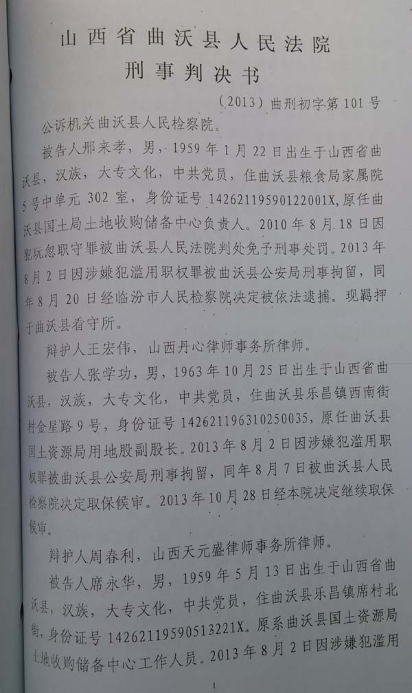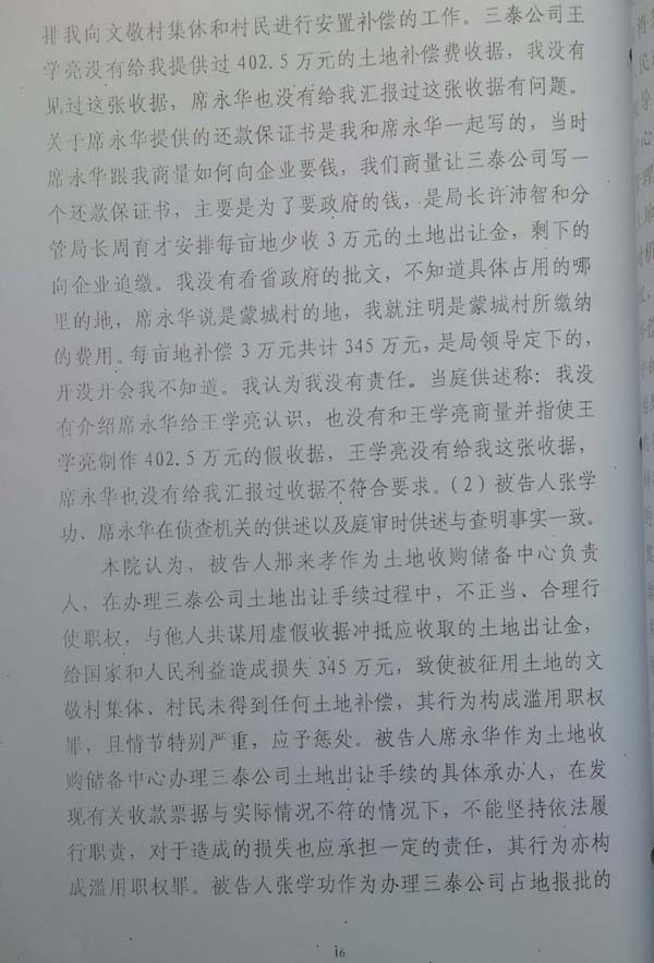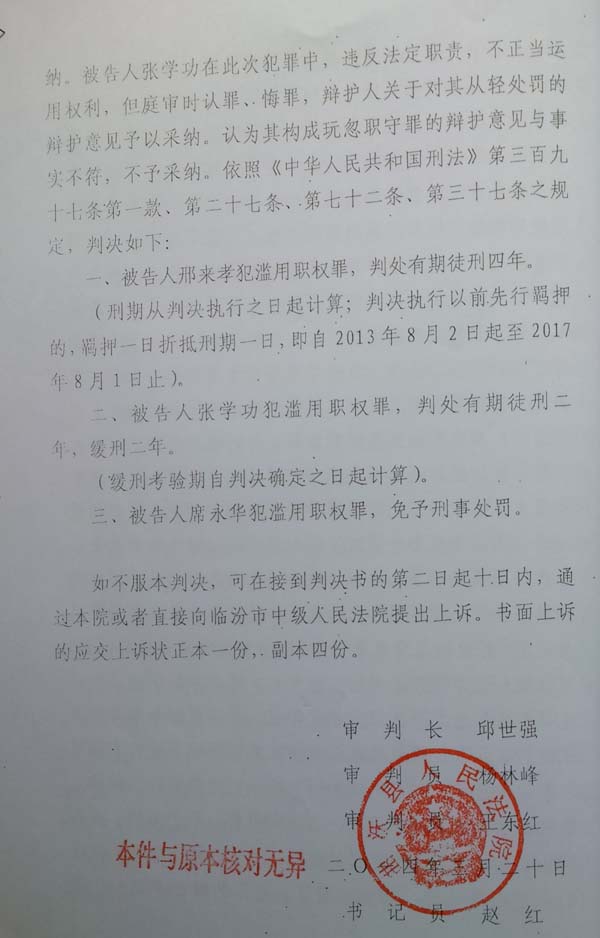 曲沃县人民法院 2014年3月20日以邢来孝是储备中心负责人,用甲村的虚假收据冲抵乙村土地补偿款345万元,给国家、人民、村集体、村民造成损失为由,判令邢来孝有期徒刑四年(见以下刑事判决书节录),但主要证据是无法与原件核对的“收款收据”复印件。