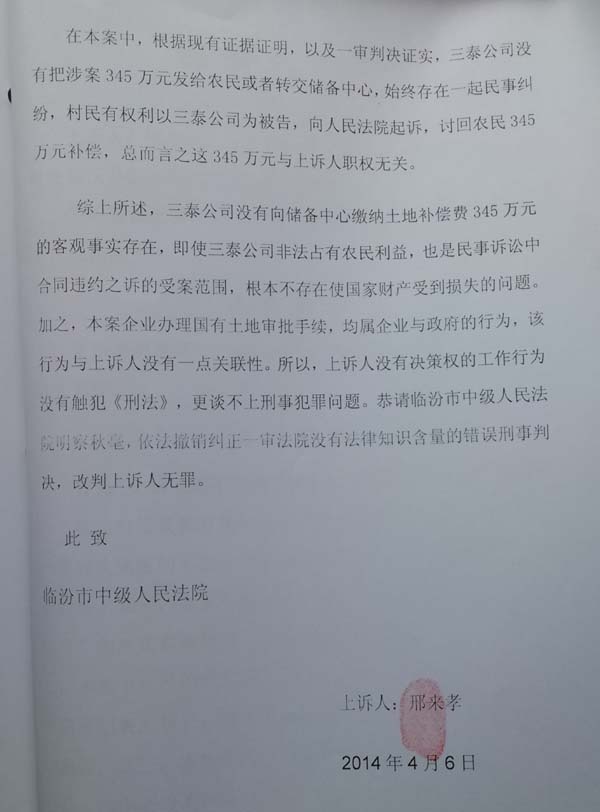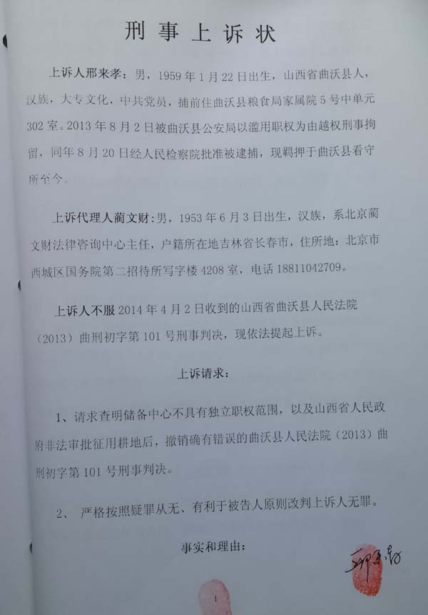 邢来孝不服曲沃县人民法院采用无法与原件核对或者不能确定真伪的定罪量刑行为,以及找不到冲抵哪笔账务的行为,向临汾市中级人民法院提出上诉,要求二审法院依法纠正一审法院用无法与原件核对或者不知真伪的证据收据定罪量刑的违法审判行为。