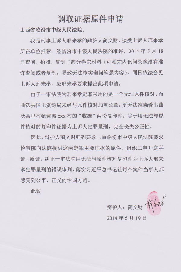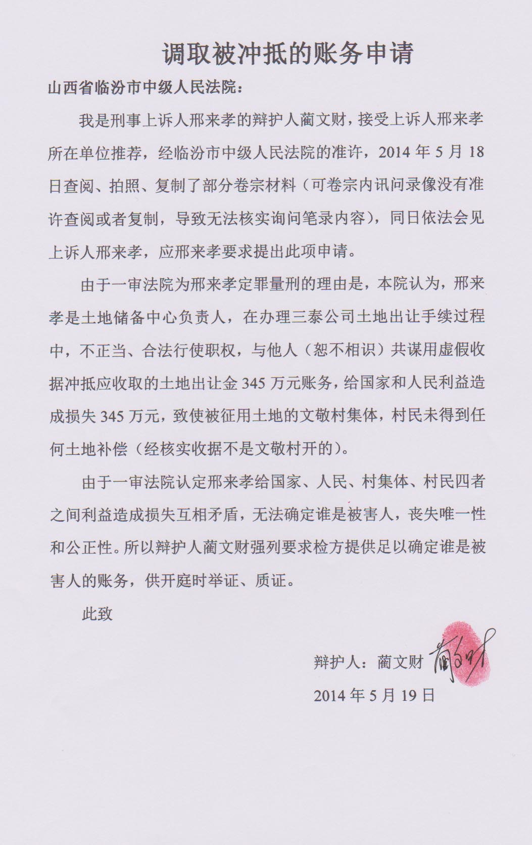 2014年5月18日,敢于坚持公平正义的辩护人查阅、复制卷宗材料,同时回见了邢来孝后,觉得邢来孝提出的有依法成立,及时向二审法院提出申请,要求二审法院严格按照《刑事诉讼法》规定,向人民检察院调取定罪量刑的证据原件,以及调取被冲抵债务的账务,做到公平正义的审判。