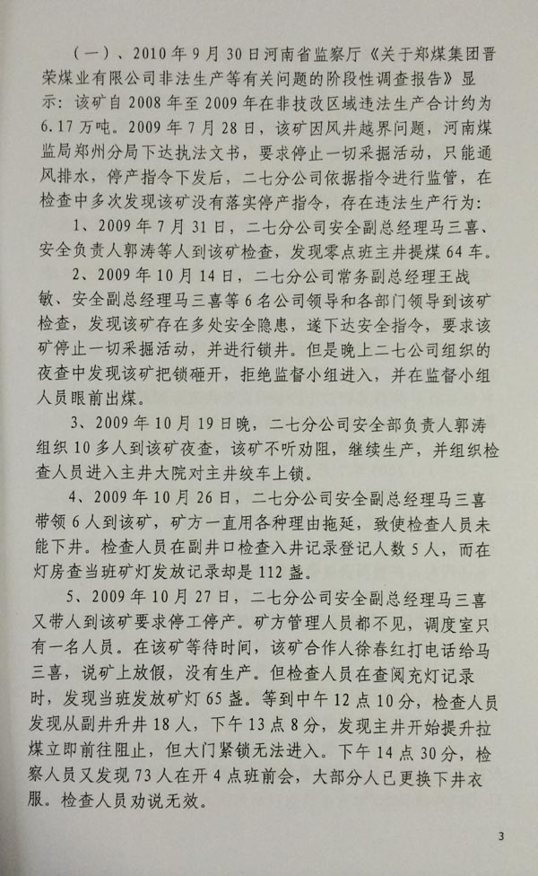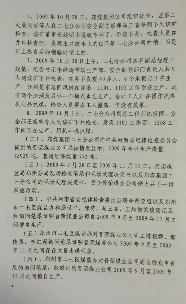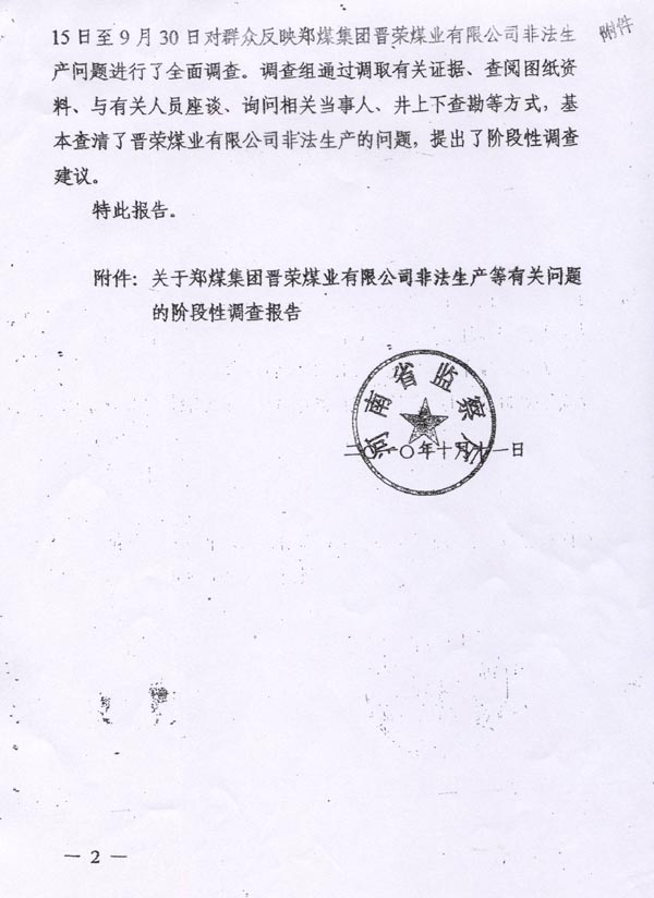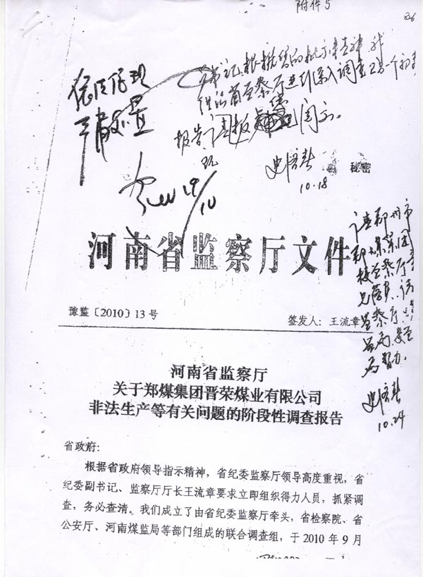 河南省政府安全生产委员会收到郑煤集团材料后,经调查发现晋荣煤矿尚未投产,所以没有作出停产停业的行政处罚决定。此时,徐万年就与原河南省煤炭管理局干部闫济道发生了民事纠纷,河南省纪委监察厅个别干部为了帮助闫济道,故意超越法律授予的职权范围,越权对企业安全生产的问题进行非法调查,并作出了(豫监[2010]13号)“河南省监察厅关于郑煤集团晋荣矿业有限公司非法生产等有关问题的阶段性调查报告”。河南省监察厅作出这份非法调查报告后,为了规定法律的追究,特在报告上加注“秘密”二字,说明这份非法定程序的调查报告不能对外宣传或者使用,但报告题目已经确定了晋荣煤矿非法生产,应当属于越权、无效确定。