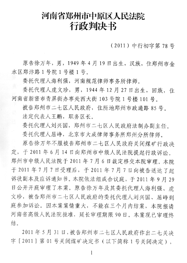 二七区人民政府收到徐万年行政起诉书后,坚持不懈的认为自己依据河南省监察厅秘密报告进行处罚行为合法(昨天在法庭上还是仍然坚持)。原一、二审法院均忽略二七区政府错误依据河南省监察厅秘密非法调查的证据进行处罚,以及对没有投入生产的晋荣煤矿实施关闭的错误,偏见性判令驳回徐万年的诉讼请求,这就是违反最高人民法院行政诉讼管辖规定的后果。