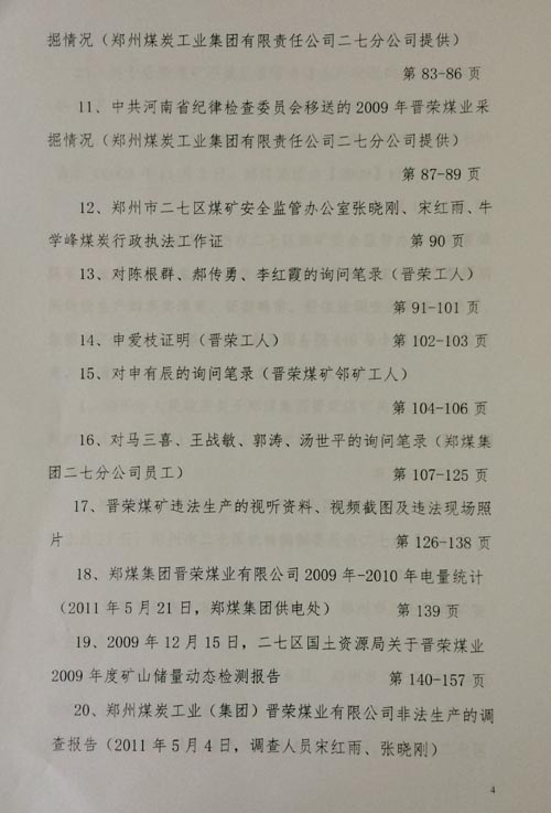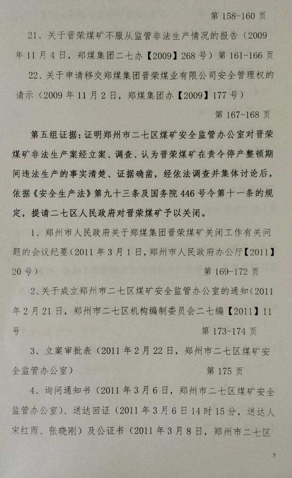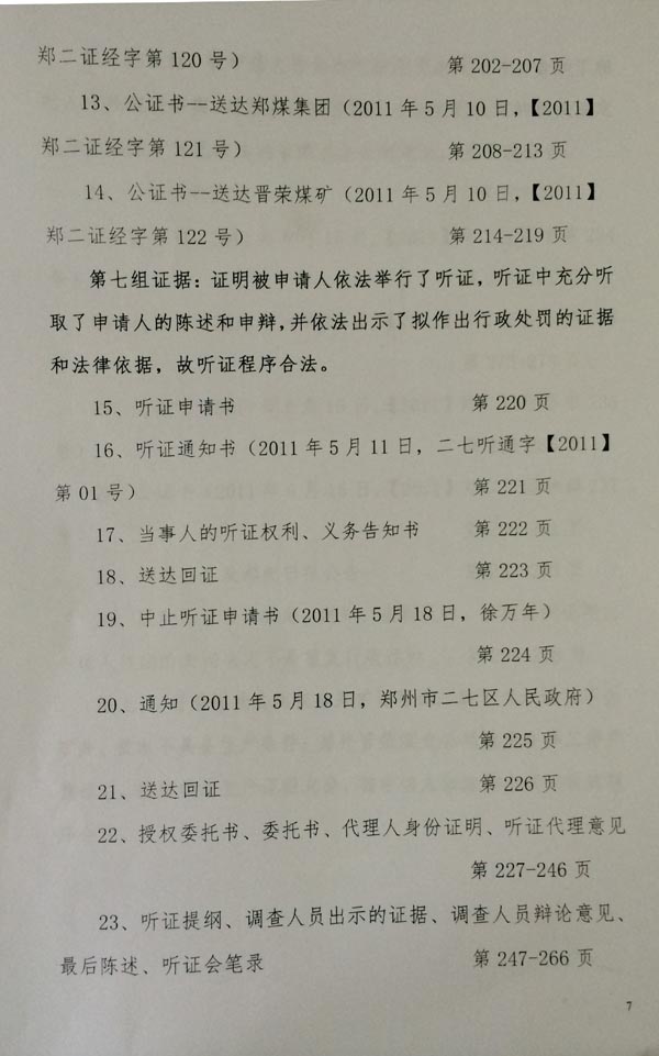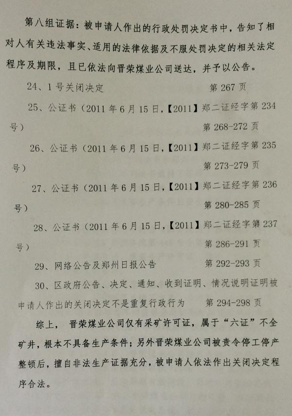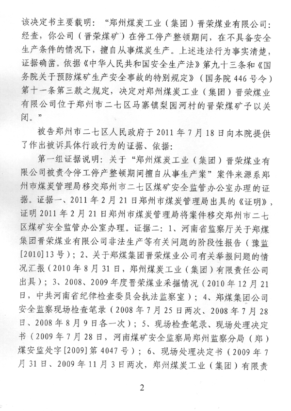 审判长要求二七区政府出示对晋荣煤矿实施关闭的处罚事实依据,二七区政府除了出示没有指向晋荣煤矿非法生产的证据之外,其指向晋荣煤矿非法生产的证据均属于河南省纪委监察厅对煤矿非法生产的越权调查报告内容及讯问笔录,证明二七区政府完全采用被加过密的“河南省监察厅关于郑煤集团晋荣矿矿业有限公司非法生产等有关问题的阶段性调查报告”,没有出示二七区政府对晋荣煤矿进行调查、给予处罚的证据。