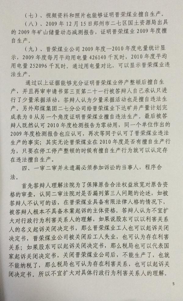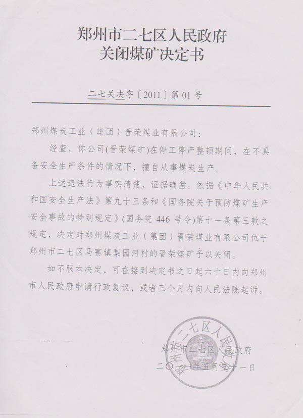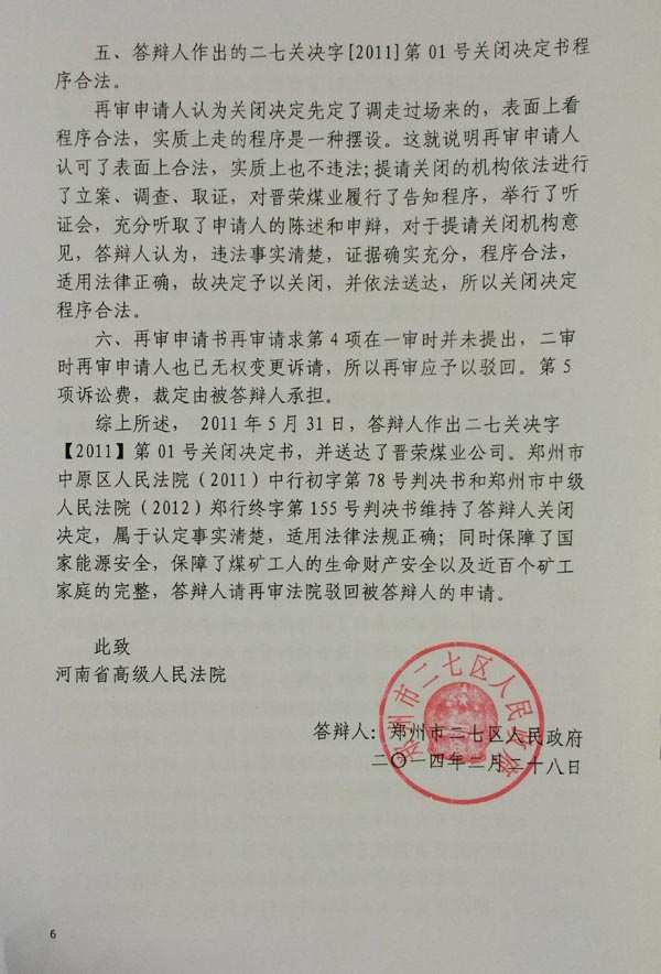 综上所述,(1)河南省国土资源厅向晋荣煤矿颁发的采矿许可证,属于省管企业范围,二七区人民政府没有直接管辖权。(2)二七区人民政府获得秘密文件行为违法,不能作为证据使用,导致本案缺乏事实依据的后果发生。(3)二七区人民政府在无权处罚情况下,或者找不到对尚未投产的煤矿进行关闭法律依据的情况下,作出的关闭处罚决定违法。(4)原审法院没有按照最高人民法院关于行政案件管辖的司法解释办理,属于越权管辖的程序违法,恭请河南省高级人民法院依法纠正,公平公正的判令二七区人民政府对省管煤矿,实施未投入生产前的关闭行为违法。