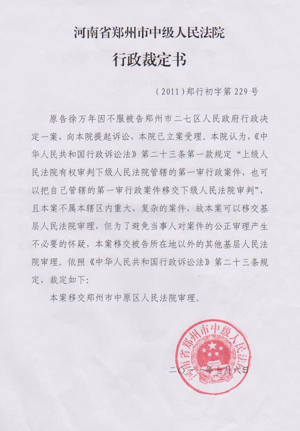 郑州市中级人民法院依据《最高人民法院关于行政诉讼案件管辖若干问题的规定》第一条第一项规定,对徐万年起诉二七区人民政府的案件依法受理(见行政裁定书)。
