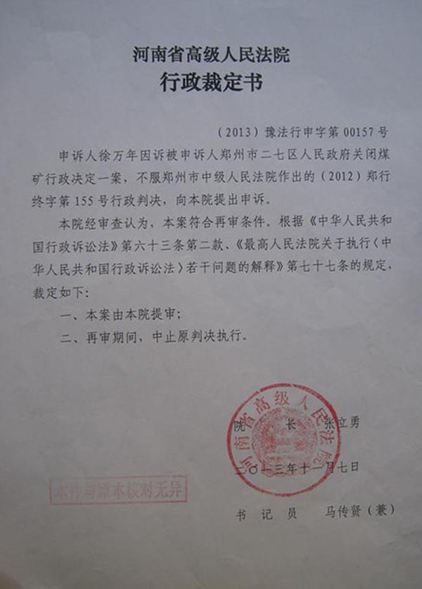 徐万年不服原一、二审法院故意偏袒二七区政府采用河南省监察厅秘密非法程序的调查报告进行行政处罚,以及关闭未投入生产煤矿的违法行为枉法裁判,依法向河南省高级人民法院提出申诉,请求河南省高级人民法院采取人性化原则,救活尚未出生的胎儿(没有投入生产的晋荣煤矿)。经河南省高级人民法院认真审查上述两个问题,根据行政机关执法公开原则,可能确认二七区政府采用秘密调查报告存疑;对没有投入生产、正在积极努力办理、完善手续的煤矿进行关闭处罚存疑;对郑州市中级人民法院贯彻、执行《最高人民法院关于行政诉讼案件管辖若干问题的规定》存疑。所以决定立案提审,是非常正确的。
