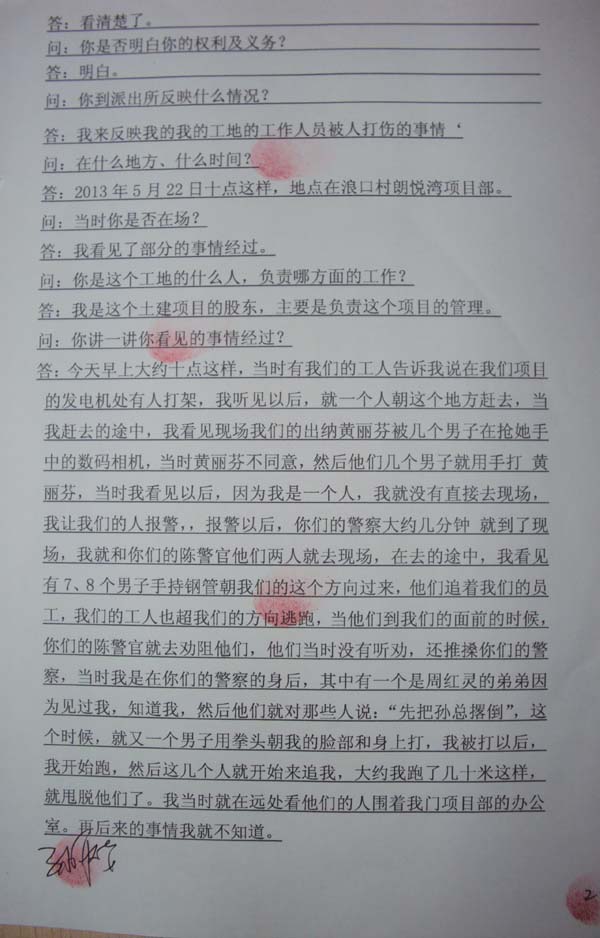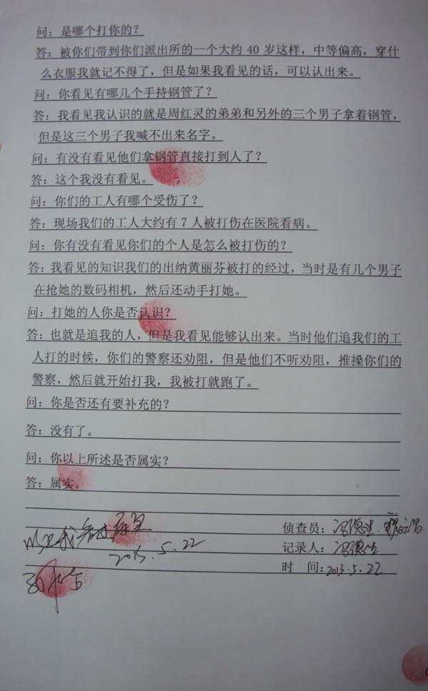 7、围观群众黄卫国被警察打伤后到警局作了笔录,