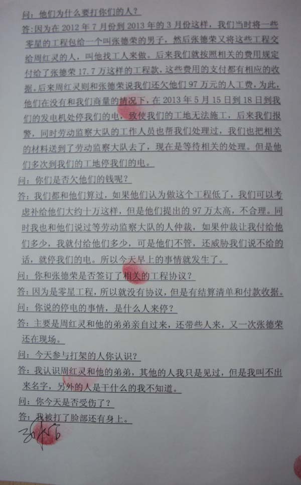 1、因讨薪引发了双方冲突,为什么在先到的3位民警已经平息冲突后,民警012122还打电话调集二十几个民警来现场,殴打已经蹲在地上,静静等待处理的讨薪民工。殴打现场有许多围观群众作证。再者警察出警都佩戴有出警仪有录像证明,四辆警车也有录像监控,恳请中纪委监督、委托相关部门从红云派出所调阅该记录。