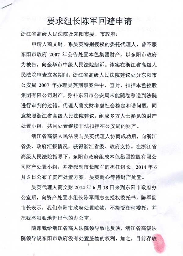中新网金华7月26日电(记者 胡丰盛)26日上午,网上一则“吴英申请资产处置小组组长回避”的报道吸引了众多舆论的关注。报道称,此前,吴英在看守所被羁押期间,曾通过书面方式举报东阳市副市长陈军向其索贿十几万元。