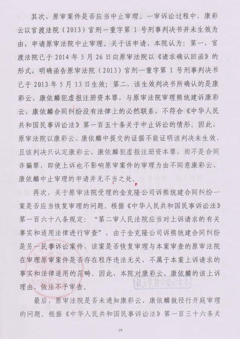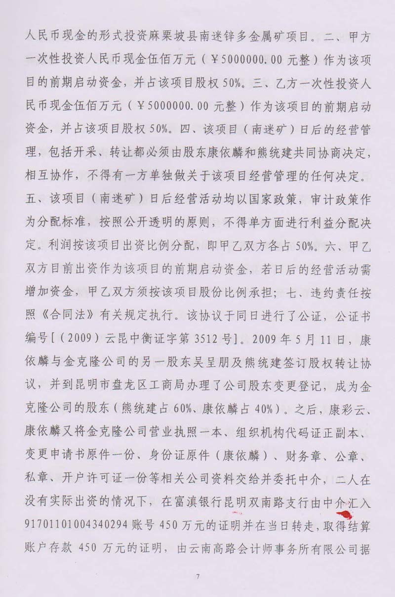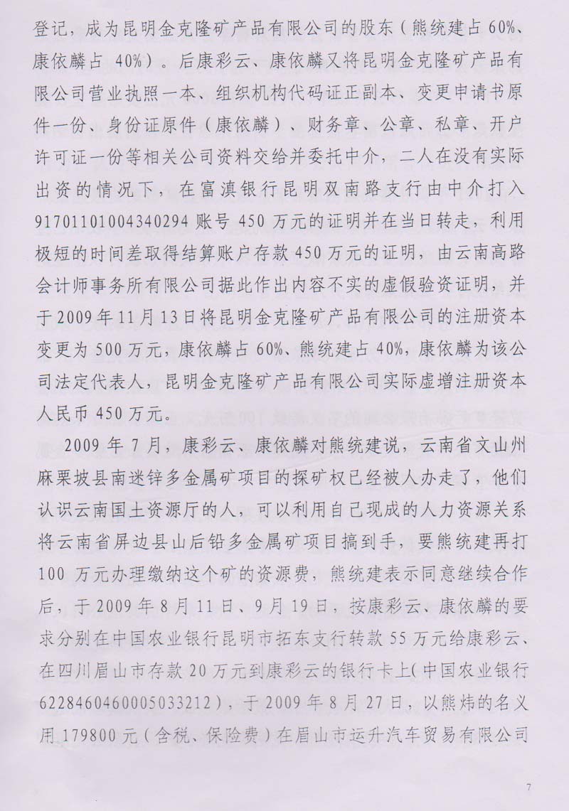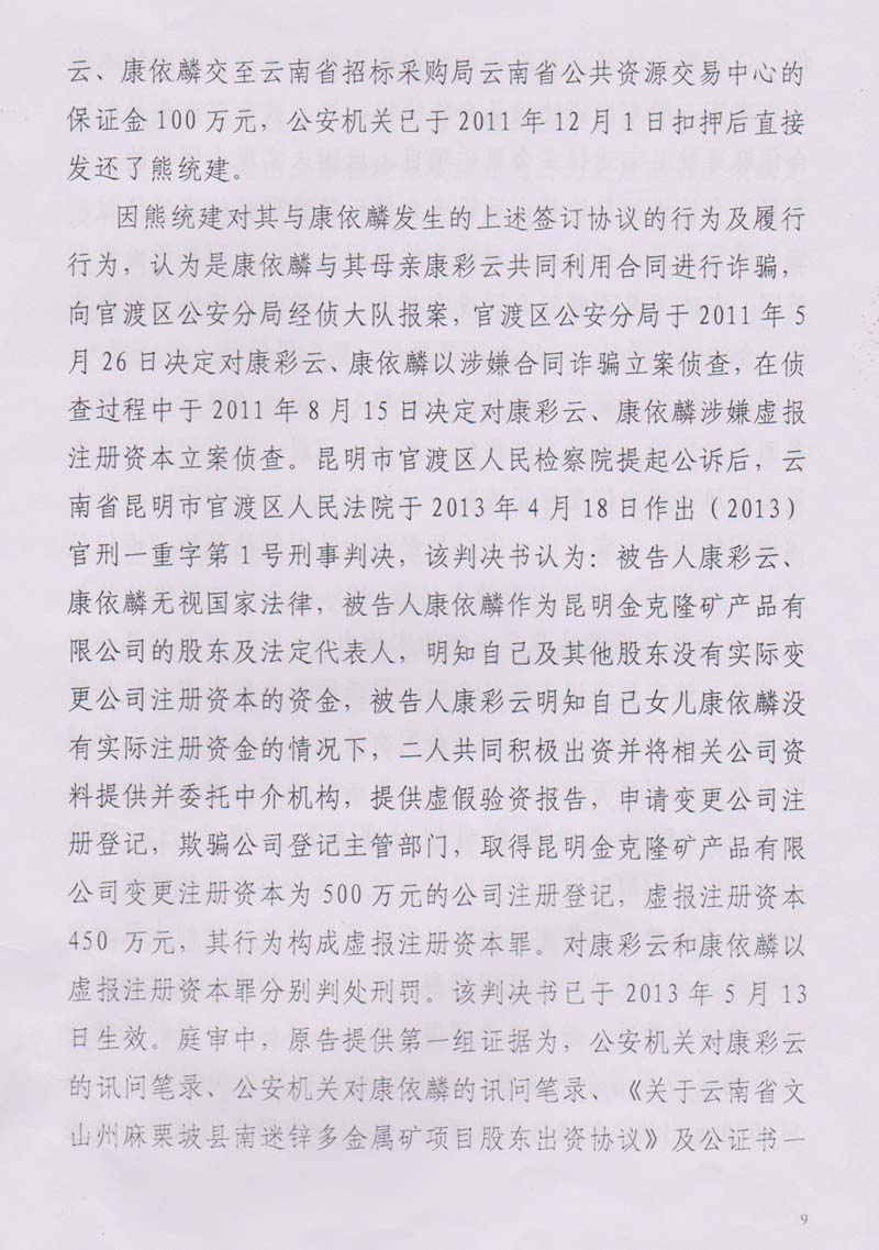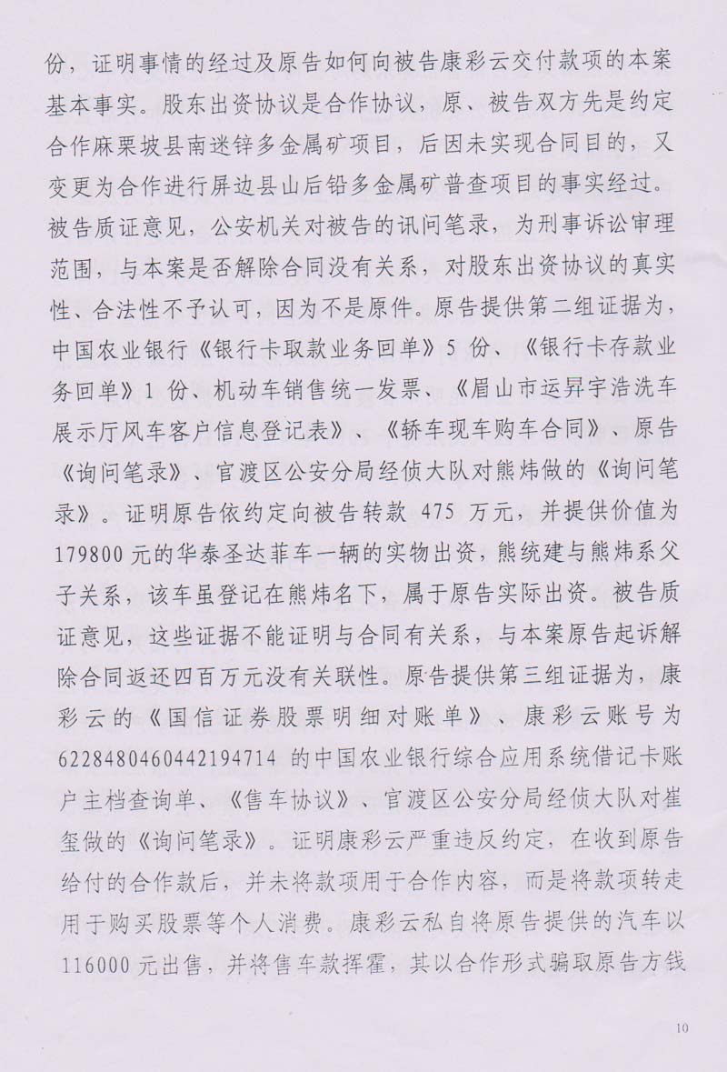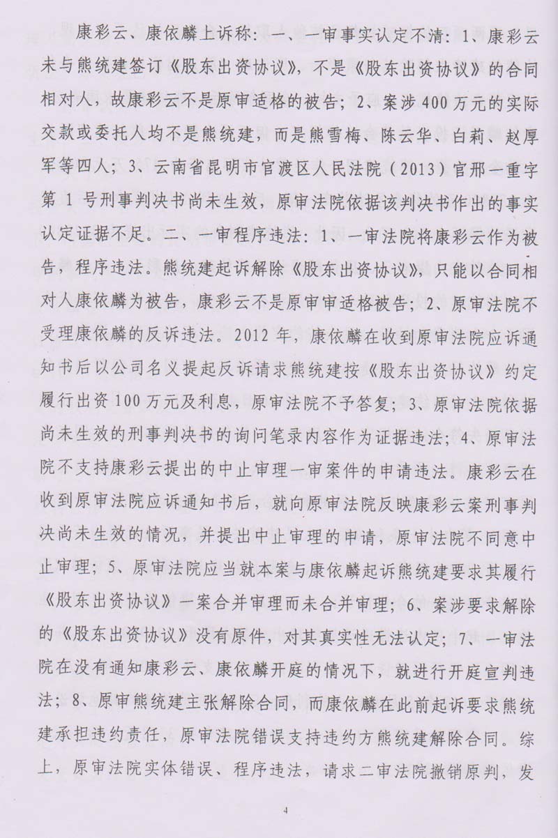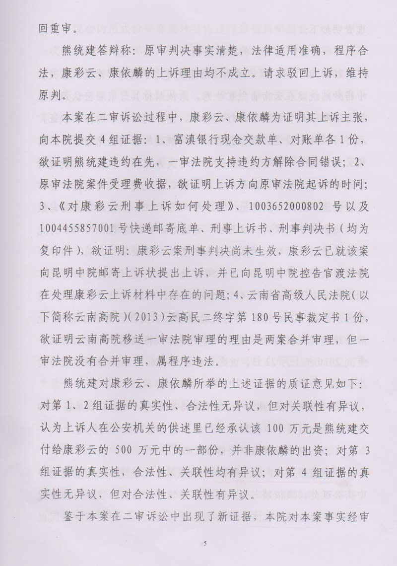 张:关于该出资协议虽系复印件,但二审中熊统建当庭作出解释,该原件因康彩云、康依麟的刑事案件已由其他司法机关存档,本案对该份协议真实性的理由是昆明中院及昆明官渡法院机关的刑事材料由康依麟以金克隆公司的名义,就该协议向东坡区法院起诉,就能证明康依麟对该协议予以认可,据此