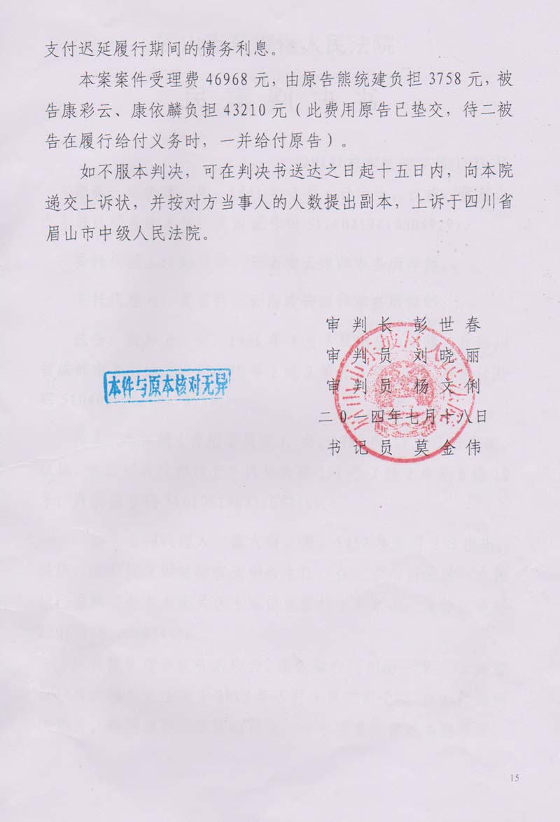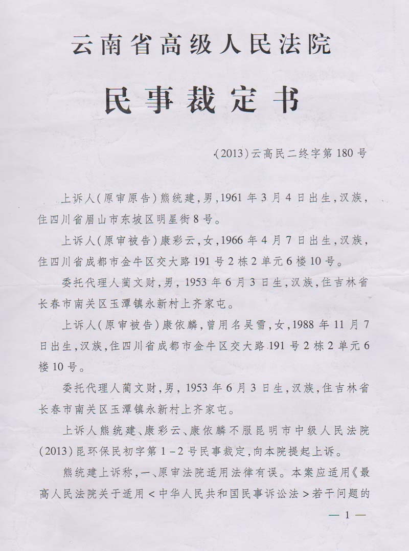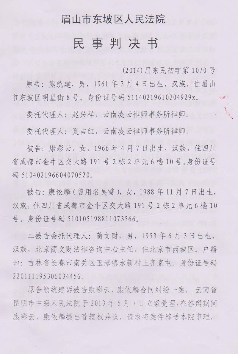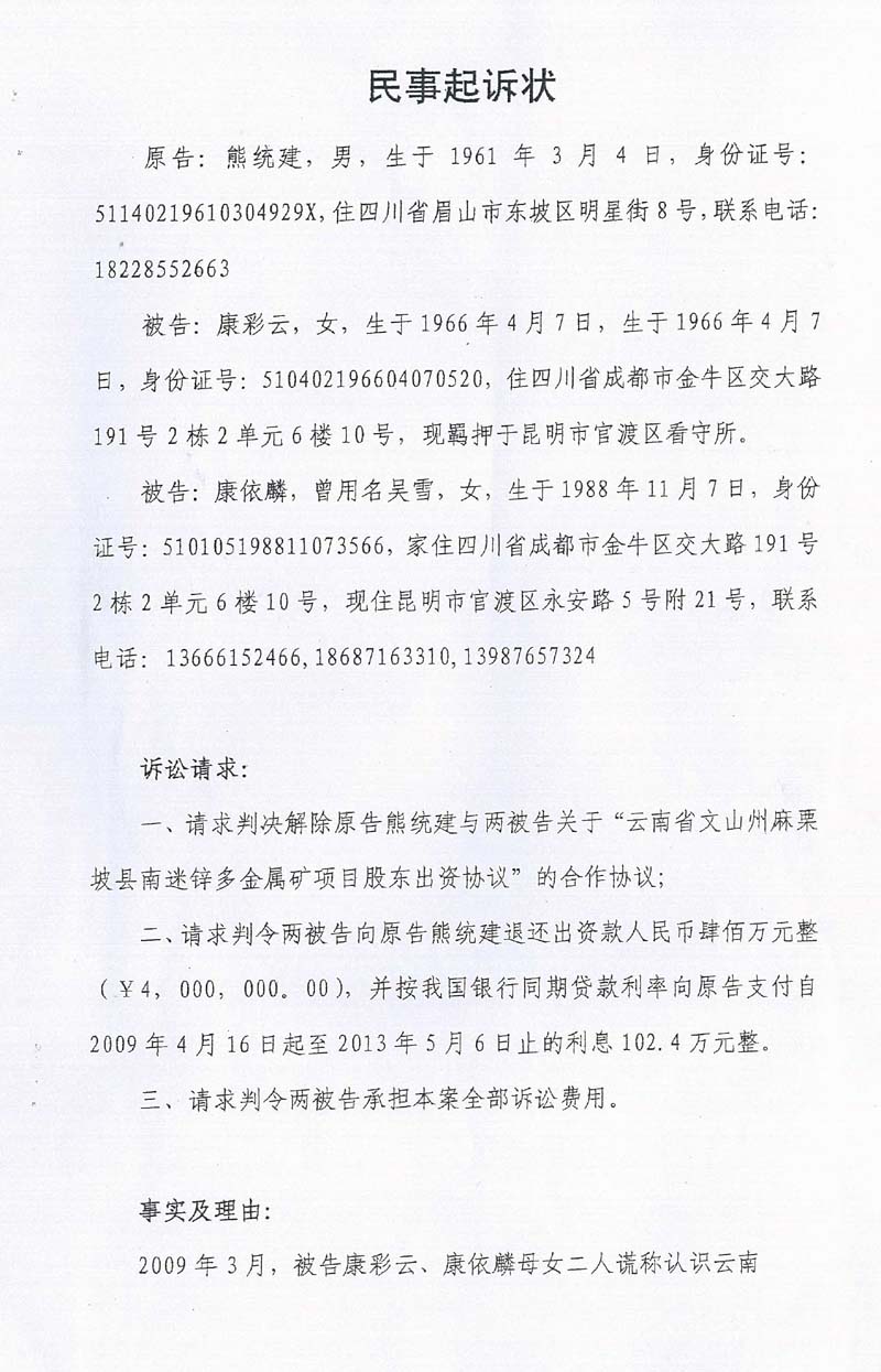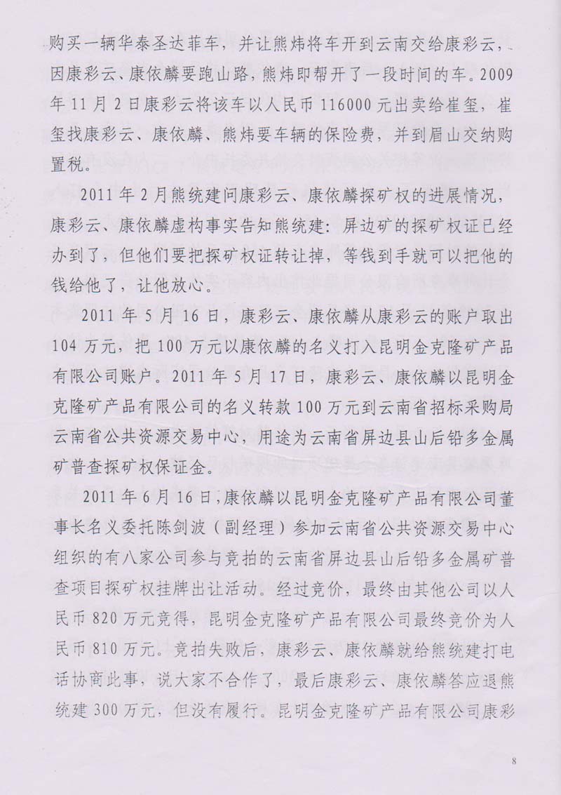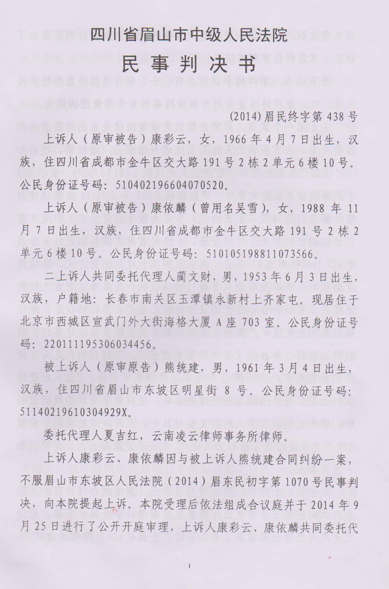 张:关于该出资协议虽系复印件,但二审中熊统建当庭作出解释,该原件因康彩云、康依麟的刑事案件已由其他司法机关存档,本案对该份协议真实性的理由是昆明中院及昆明官渡法院机关的刑事材料由康依麟以金克隆公司的名义,就该协议向东坡区法院起诉,就能证明康依麟对该协议予以认可,据此