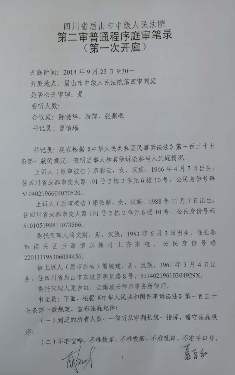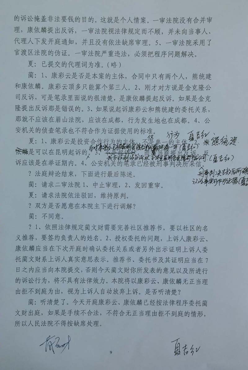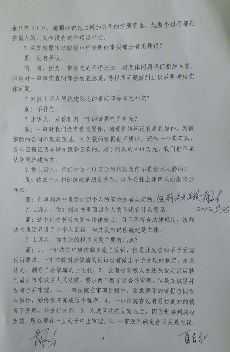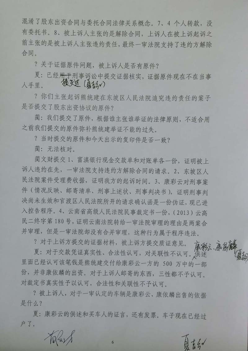 蔺:张法官提到的依据官渡法院作出的刑事判决书及公安机关的笔录,本代理人认为昆明市公安局官渡分局经侦大队对康依麟所作笔录,表面符合合同诈骗罪情形,最终官渡法院没有以康依麟、康彩云犯合同诈骗罪定罪,足以证明公安机关的询问笔录内容不完全真实,不应作为民事案件的证据使用,另,熊起诉的主诉理由是解除与康依麟订立的股东协议,其次才是承担返还财产的责任,眉山两级法院应当就合同是否符合解除条件进行审理,由于眉山