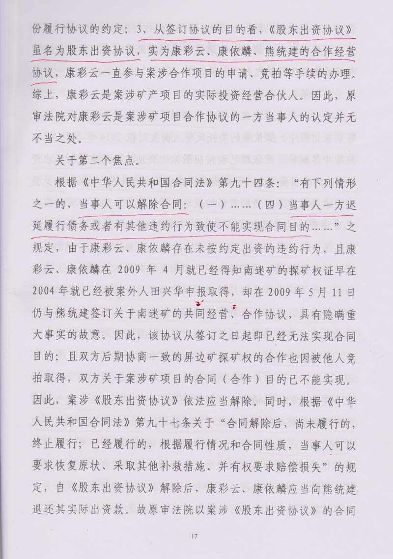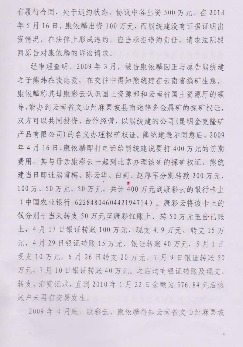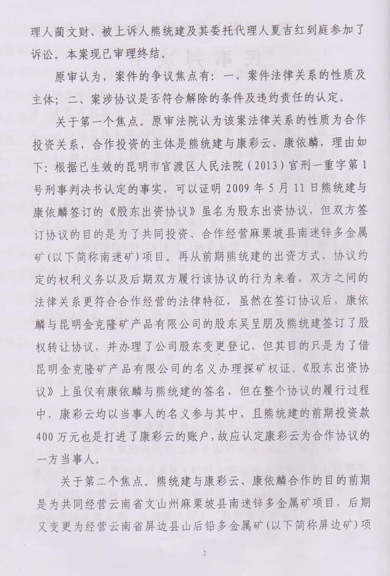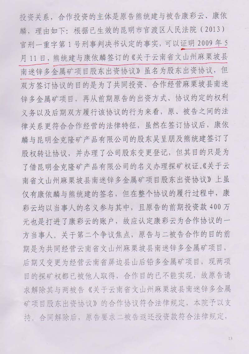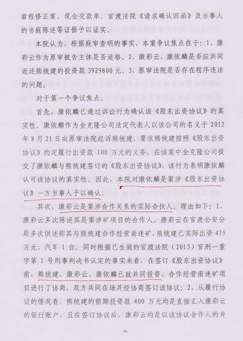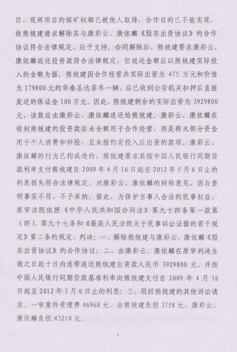 张:判决书中第三页已明确载明,股东出资协议虽系康依麟与熊统建签订,但是一审、二审查明事实,本院对康彩云系矿产开采协议的实际合作投资经营人,并据此 了原审法院对上述事实的认定。