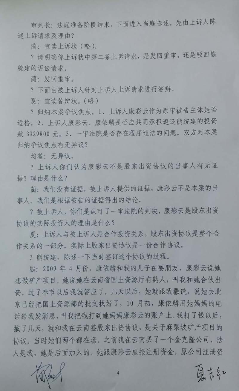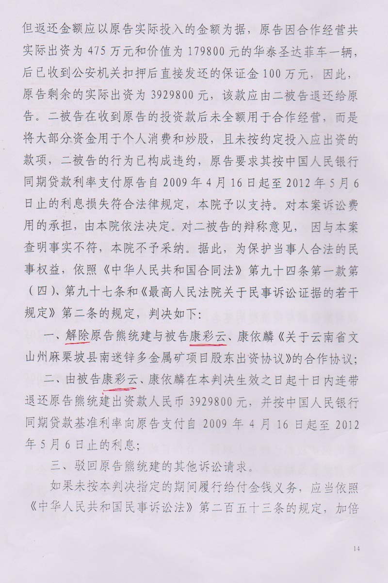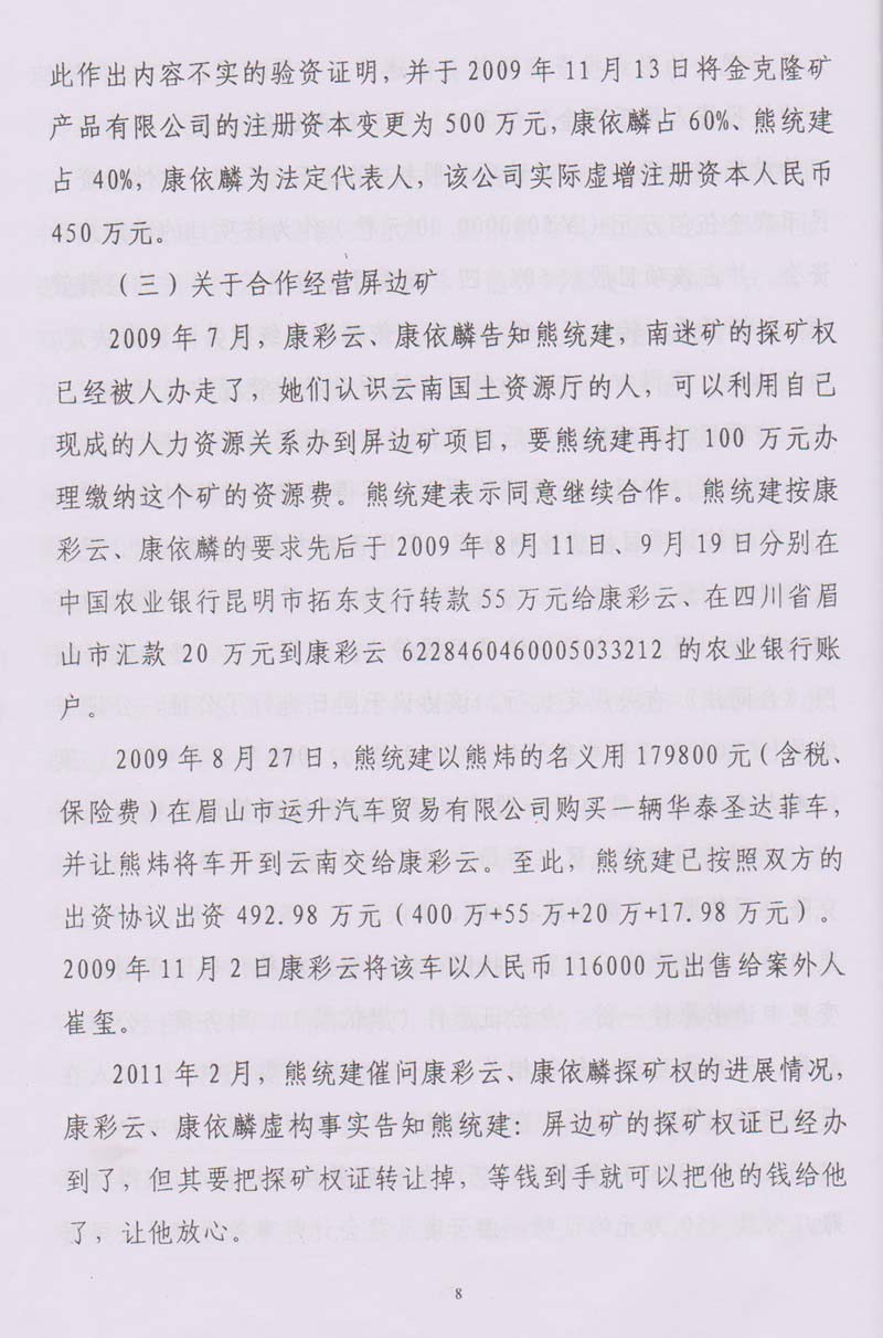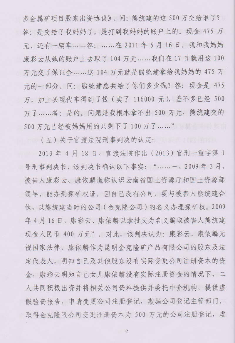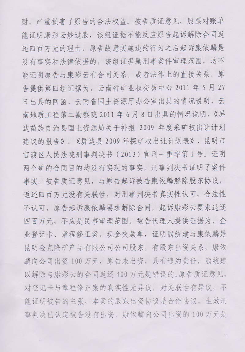 张:判决书中第三页已明确载明,股东出资协议虽系康依麟与熊统建签订,但是一审、二审查明事实,本院对康彩云系矿产开采协议的实际合作投资经营人,并据此 了原审法院对上述事实的认定。