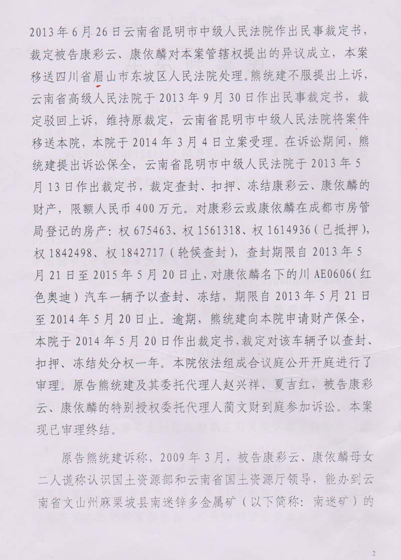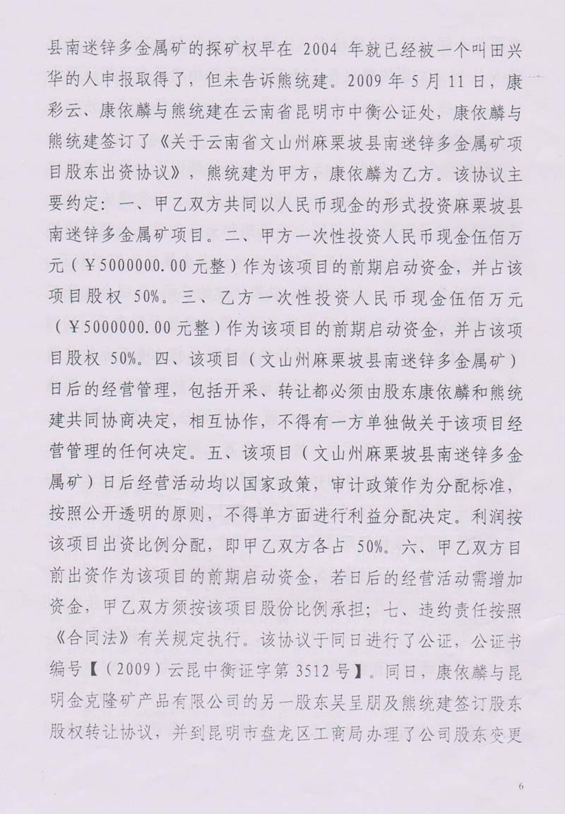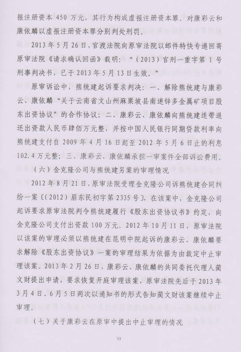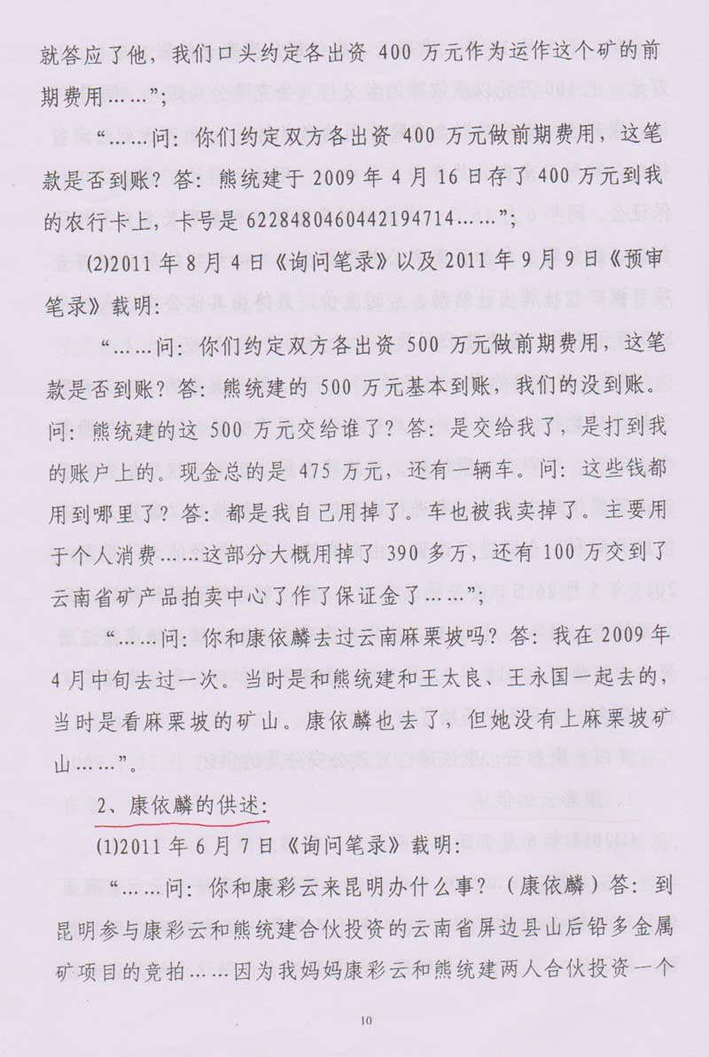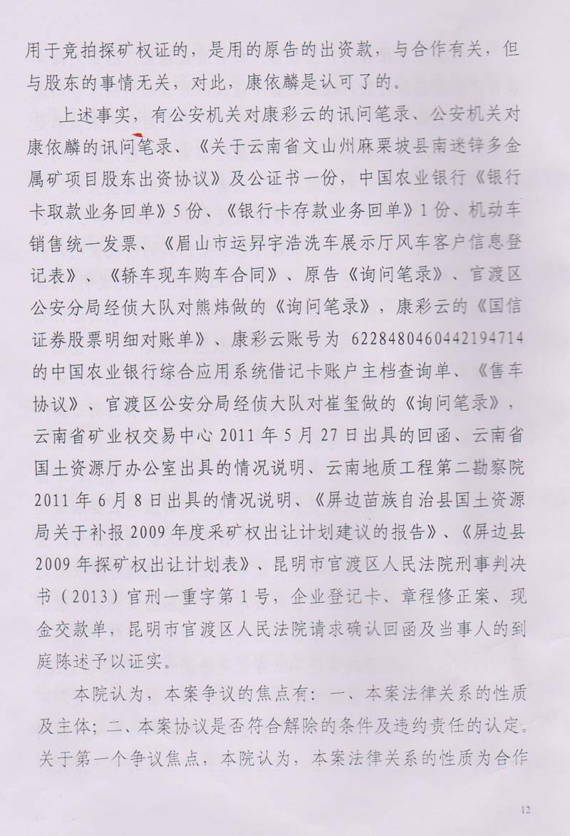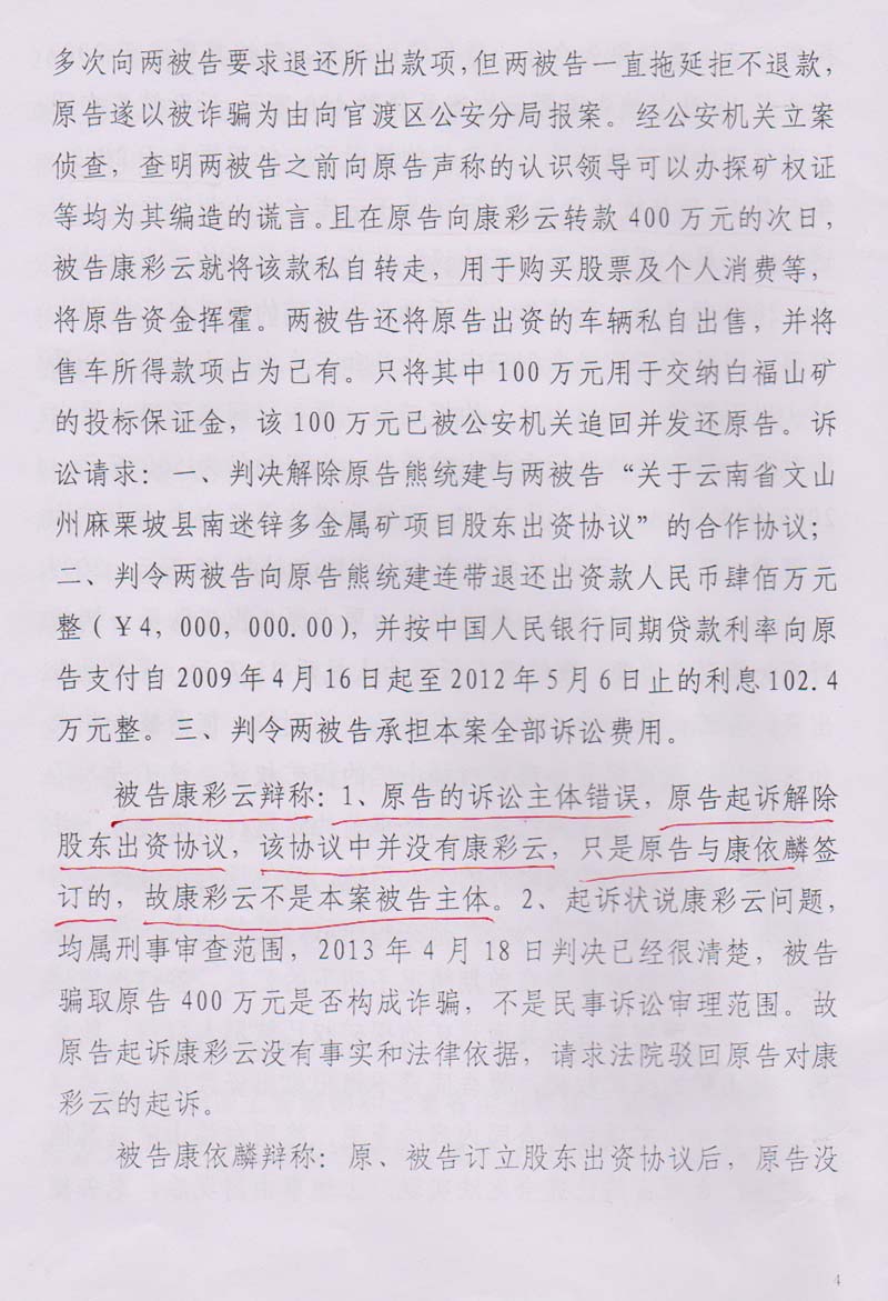 张:判决书中第三页已明确载明,股东出资协议虽系康依麟与熊统建签订,但是一审、二审查明事实,本院对康彩云系矿产开采协议的实际合作投资经营人,并据此 了原审法院对上述事实的认定。