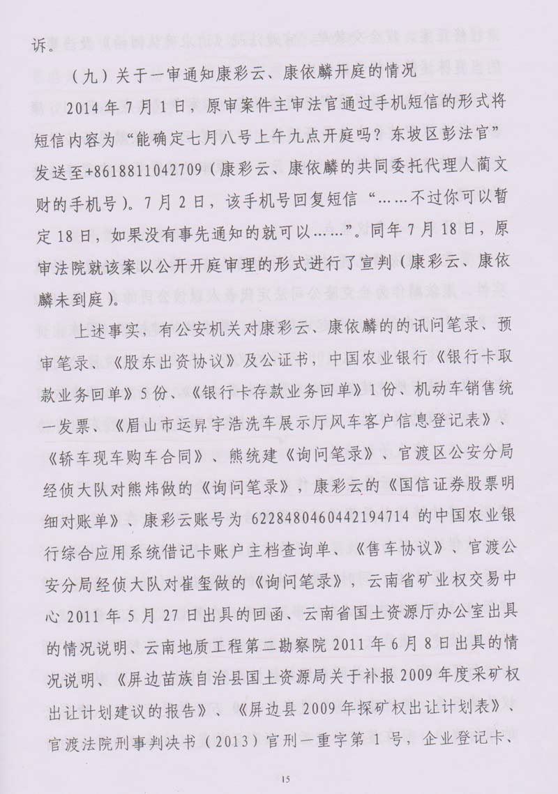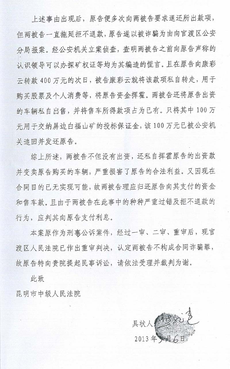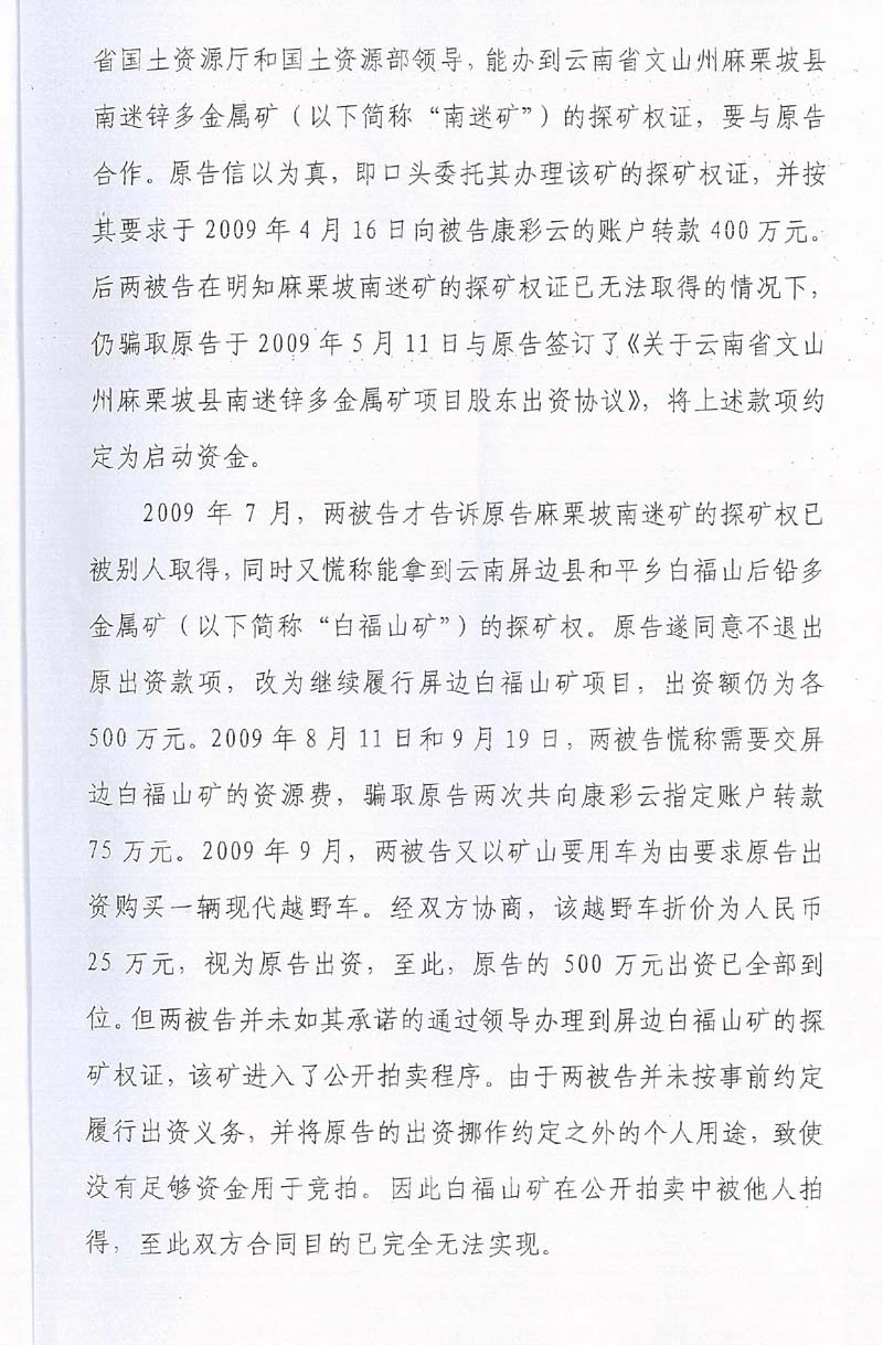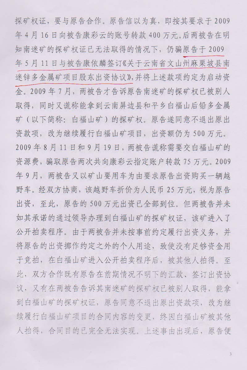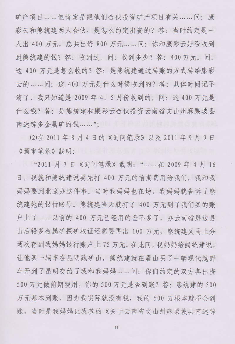 张:判决书中第三页已明确载明,股东出资协议虽系康依麟与熊统建签订,但是一审、二审查明事实,本院对康彩云系矿产开采协议的实际合作投资经营人,并据此 了原审法院对上述事实的认定。