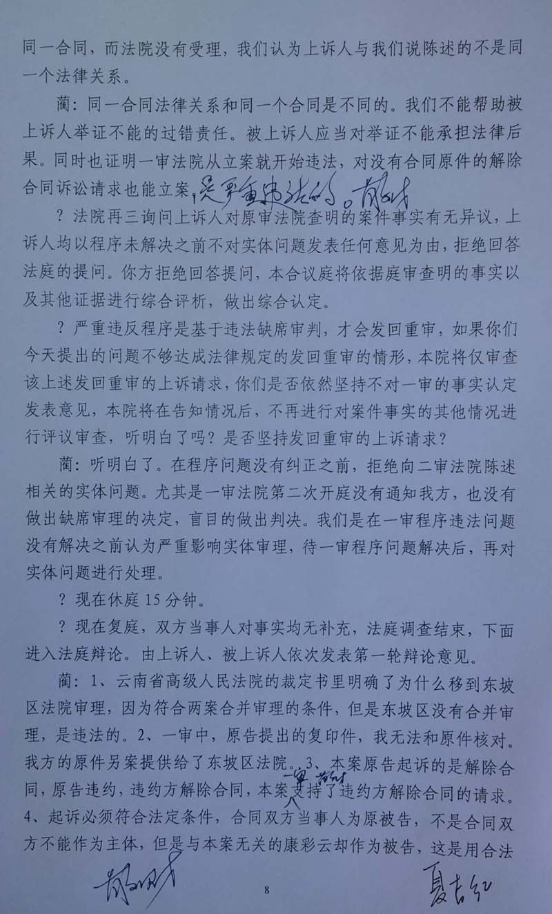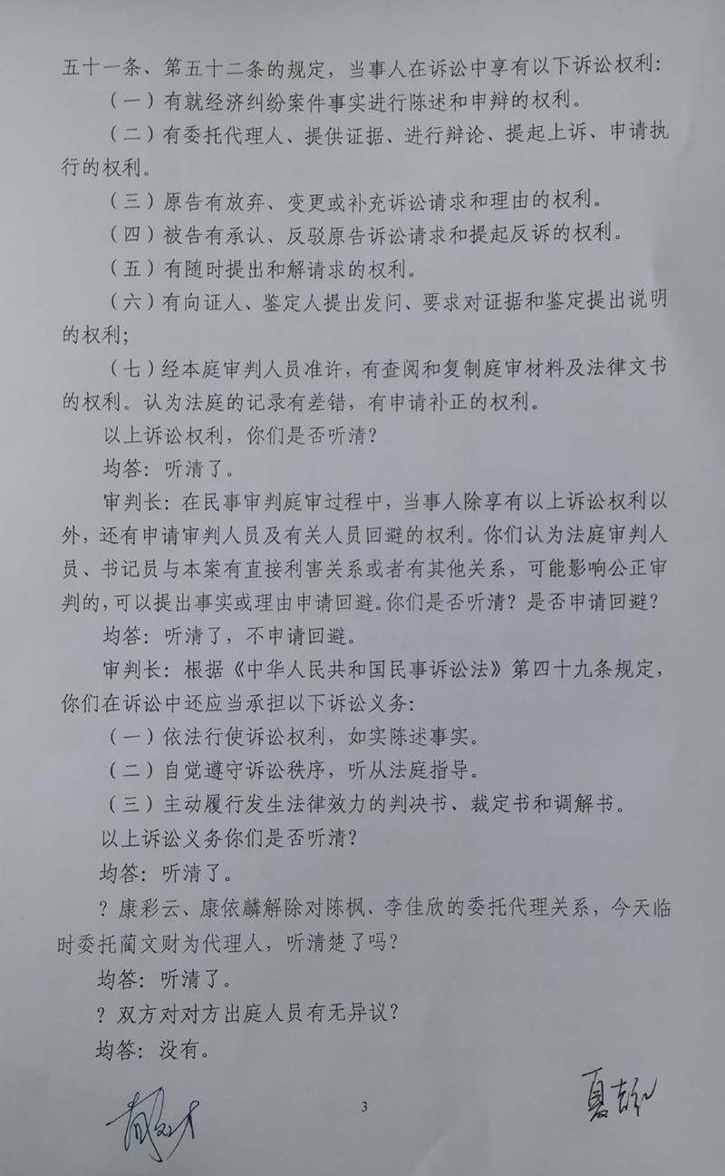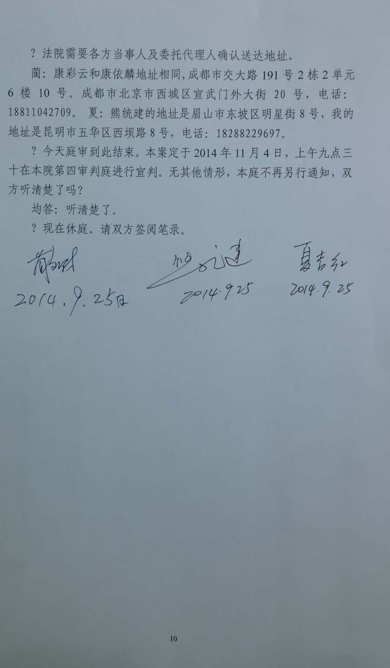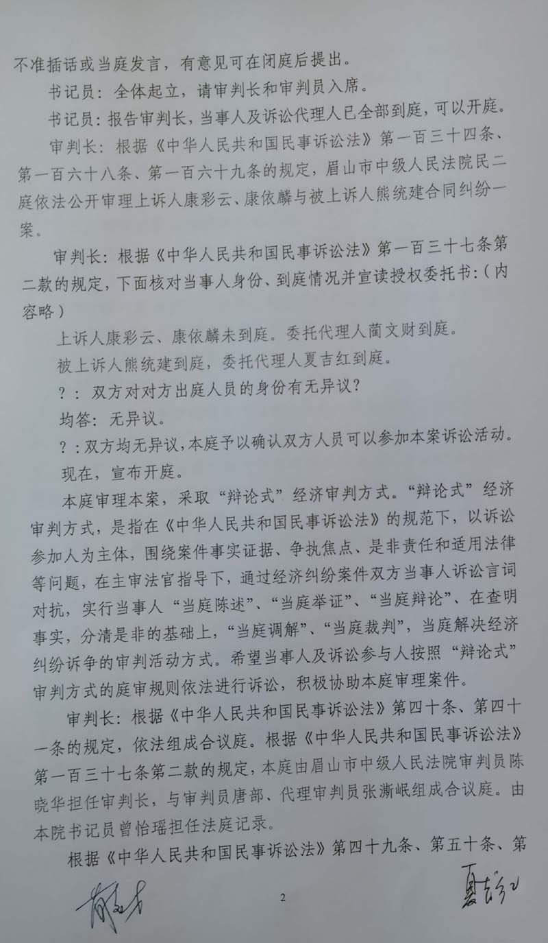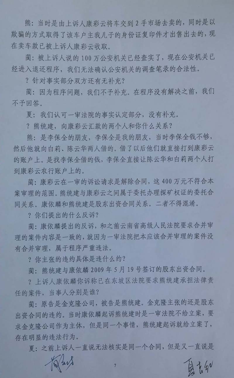 蔺:根据张法官所说熊提出与两康解除股东出资协议,我再次质疑,请看看股东出资协议上是否有康彩云?既然没有康彩云,熊提出与康彩云解除