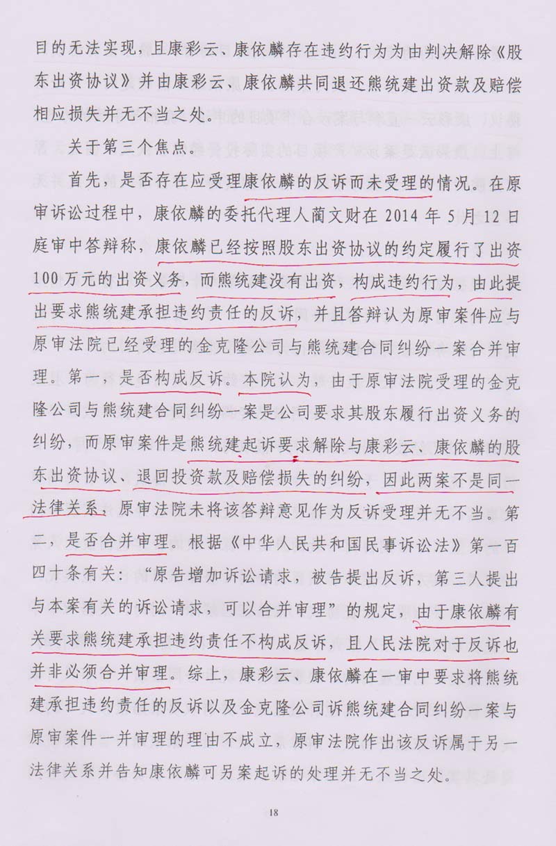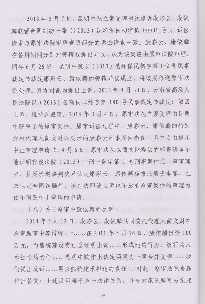 蔺:根据张法官的解释,我认为张法官所说的熊与康彩云的合同关系是根据审理查明的事实所认定,是法律规定范围内的事实合作关系,我认为张法官所讲的是完全错误的,理由是熊起诉书上,已明确记载诉请法院判令解除的是书面股东出资协议,而不是诉求解除与康彩云的事实合作关系,眉山市两级法院判令解除的是康依麟与熊之间订立的书面股东协议,而没有判令熊与康彩云的事实合作合同关系,事实合同关系已经超过熊的诉求范围,这是两级法院在个别腐败领导干预下,企图帮助熊造成的后果,希望能引起眉山两级法院法官的高度重视,严格按照习近平总书记十八大四中全会讲话精神,及时纠正错误。