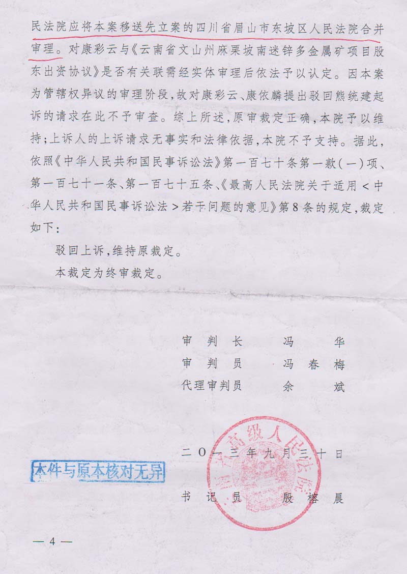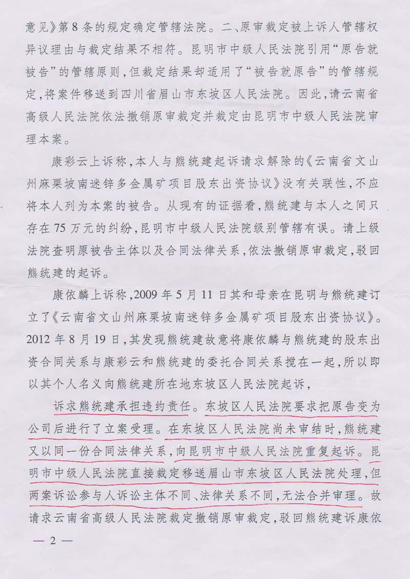 的条款属于适用法律错误,对于案件管辖权,我方认为是移送合并审理的案件,我方无权提出管辖异议,第六,在二审判决中,第九、十页提到康彩云的供述及康依麟的供述,我们无法分辨二审法院审理的是刑事案件还是民事案件,后经我方咨询民事诉讼专家认为这种做法是错误的,对民事诉讼当事人是一种严重侵害,对法律是一种公开的破坏或者践踏,本代理人有理由怀疑眉山中院采取无视法律的做法,抵制对抗习近平总书记的依法治国规定,本案直接涉及对中央推进依法治国的态度问题,所以本代理人已在中国民告官网站上向社会通报,目前已初步同意接受半岛电视台对此采访。