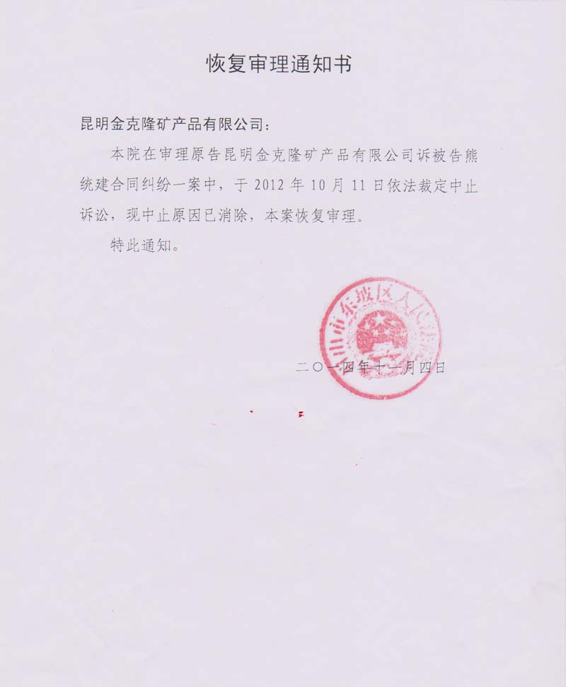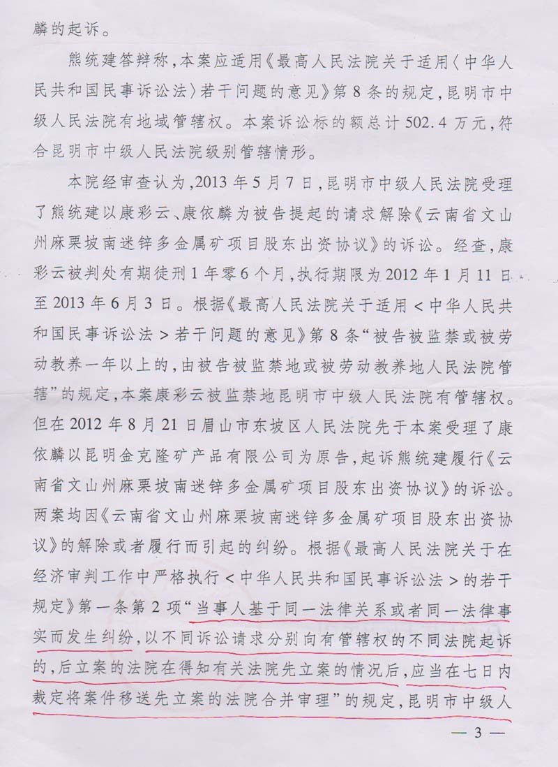 蔺:我方没有提管辖权异议,张法官混淆了合并审理的概念,云南省两级法院裁定移送合并审理,是金克隆公司诉请熊履行协议承担违约责任,不是康依麟起诉熊,所以刚才张法官所列举