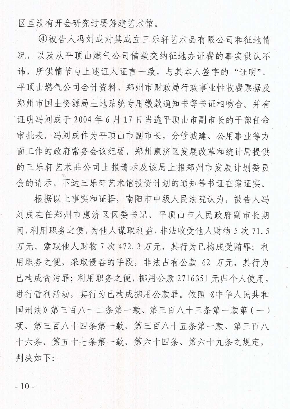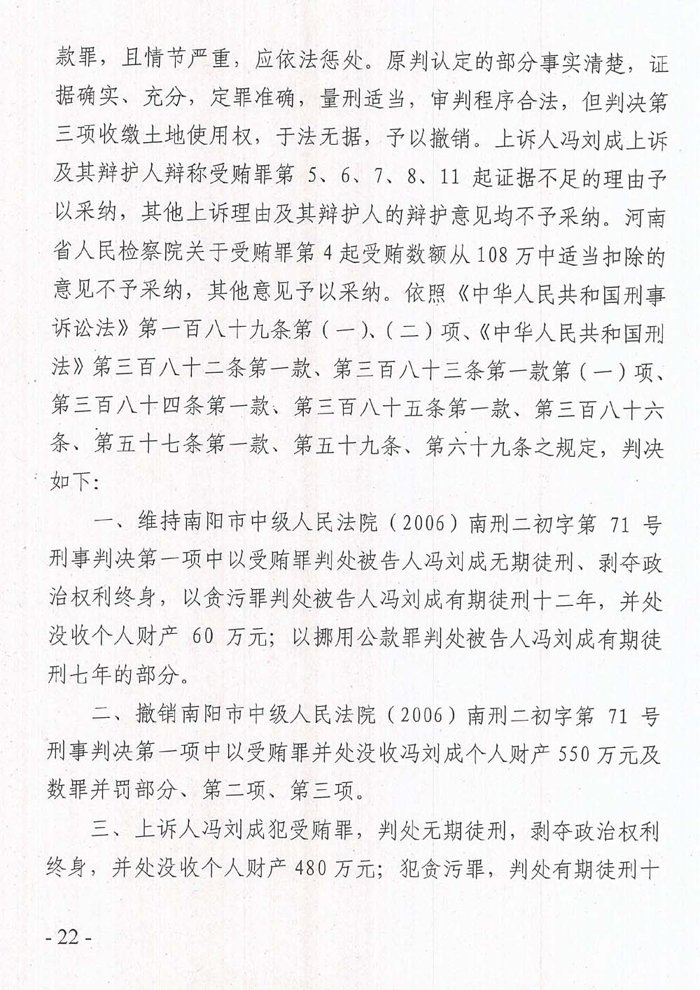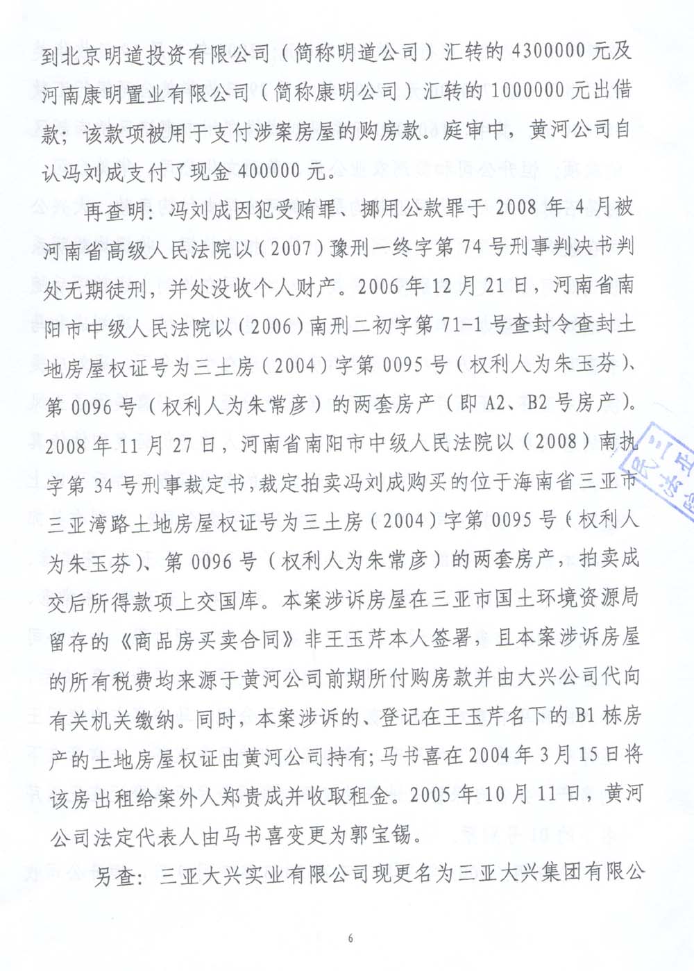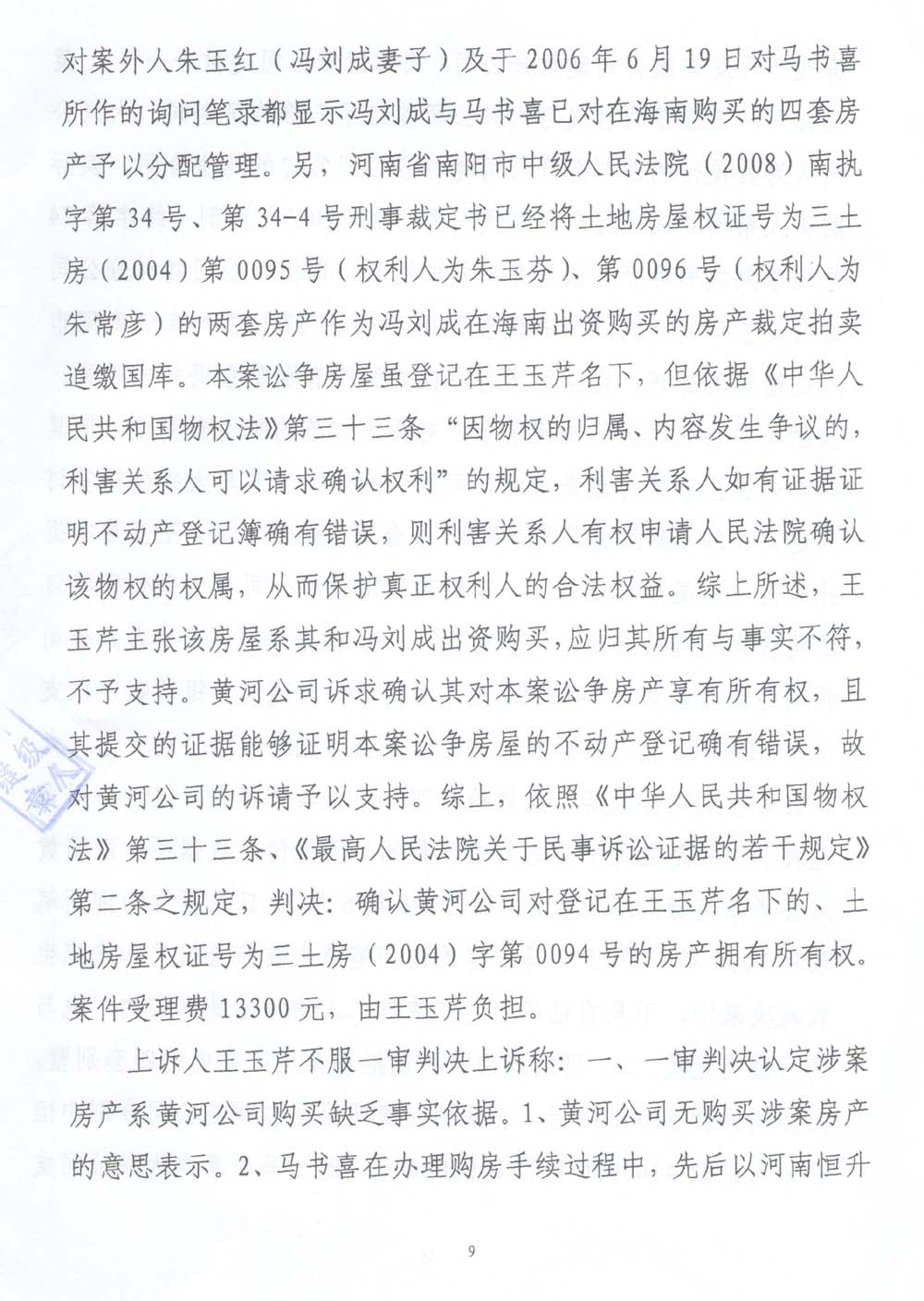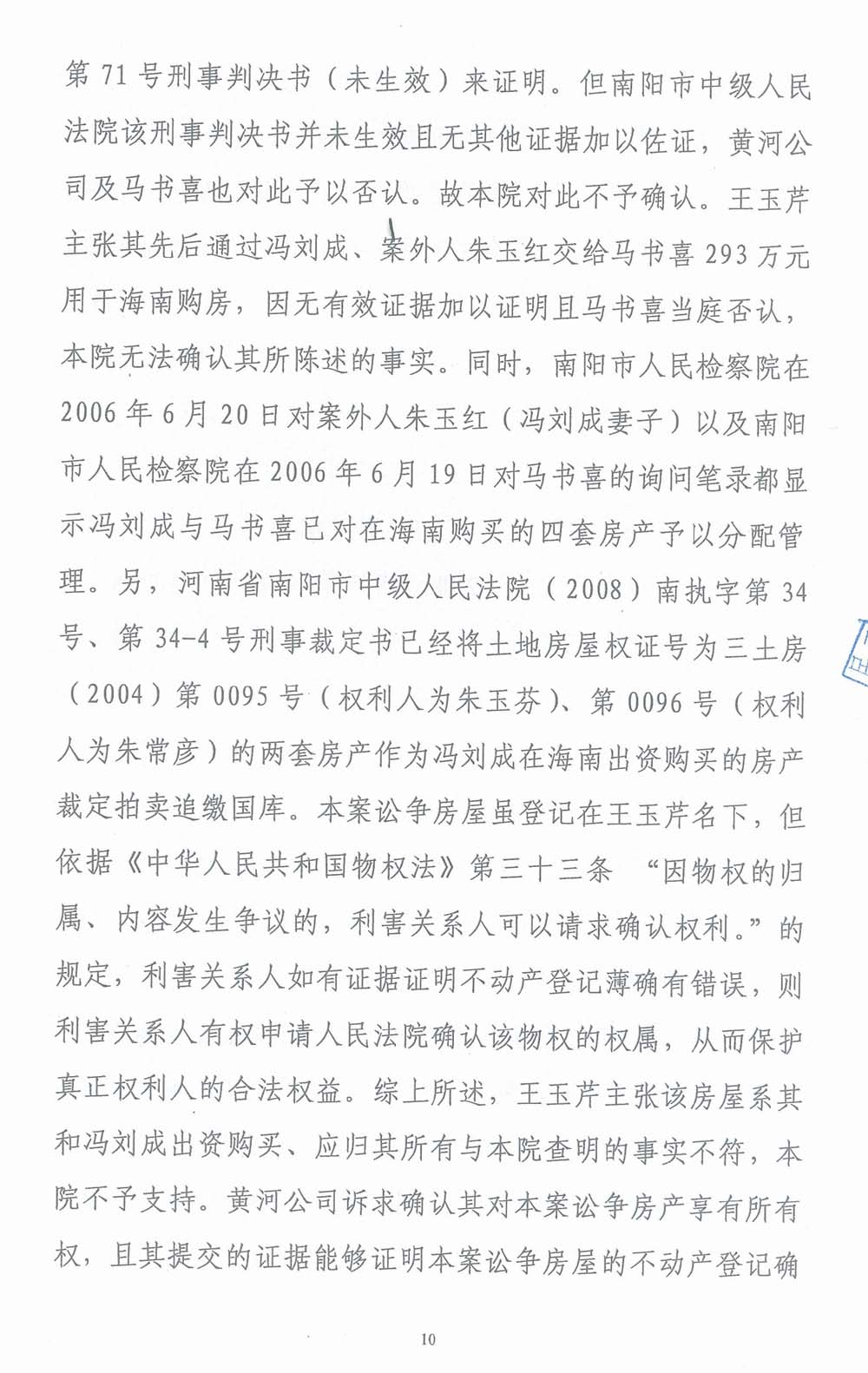 南阳市中级人民法院审理认为,被告人冯刘成犯受贿罪、贪污罪、挪用公款罪的主要证据有海南省三亚市的四套房产(别墅),该房产的所有权已经于2013年5月6日被海南省三亚市城郊人民法院依法判令归河南黄河生态旅游有限公司所有。该生效民事判决已经确定南阳市中级人民法院认定被告冯刘成利用或者拥有三亚的四套别墅的行为够犯罪有误,类似与呼格吉勒图案件的真凶出现基本相同,这次就看河南省高院如何处理了。