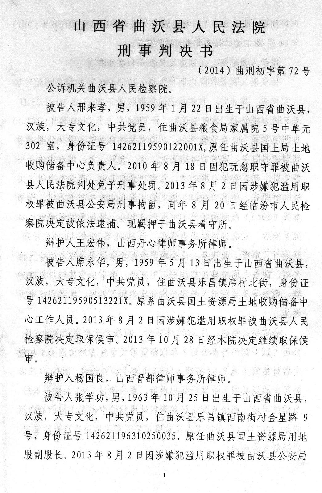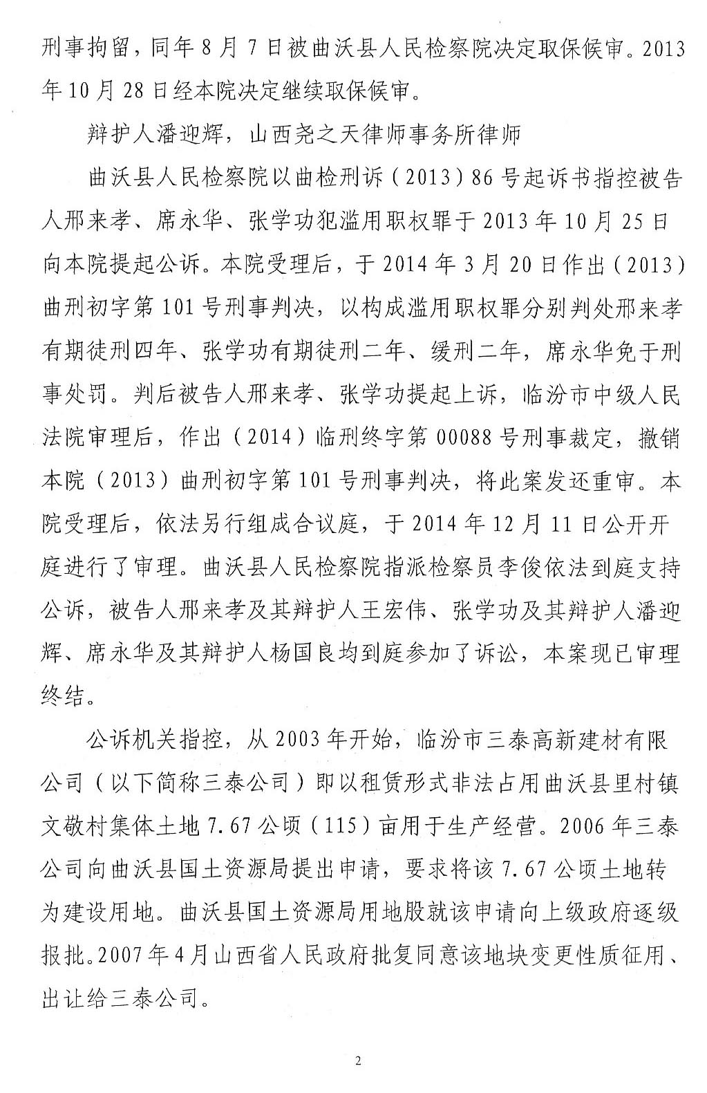 上诉人:邢来孝,男,1959年1月22日生,汉族,住曲沃县粮食局家属院5号中单元302室。现因被滥用职权罪羁押在曲沃县看守所。