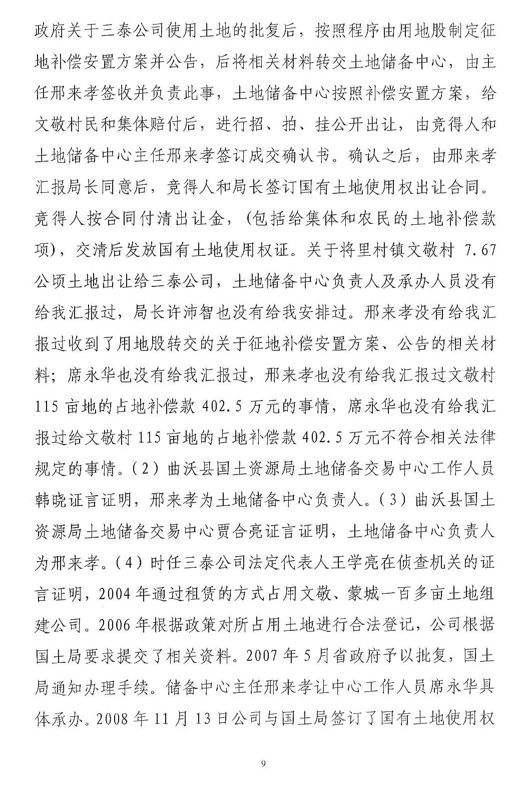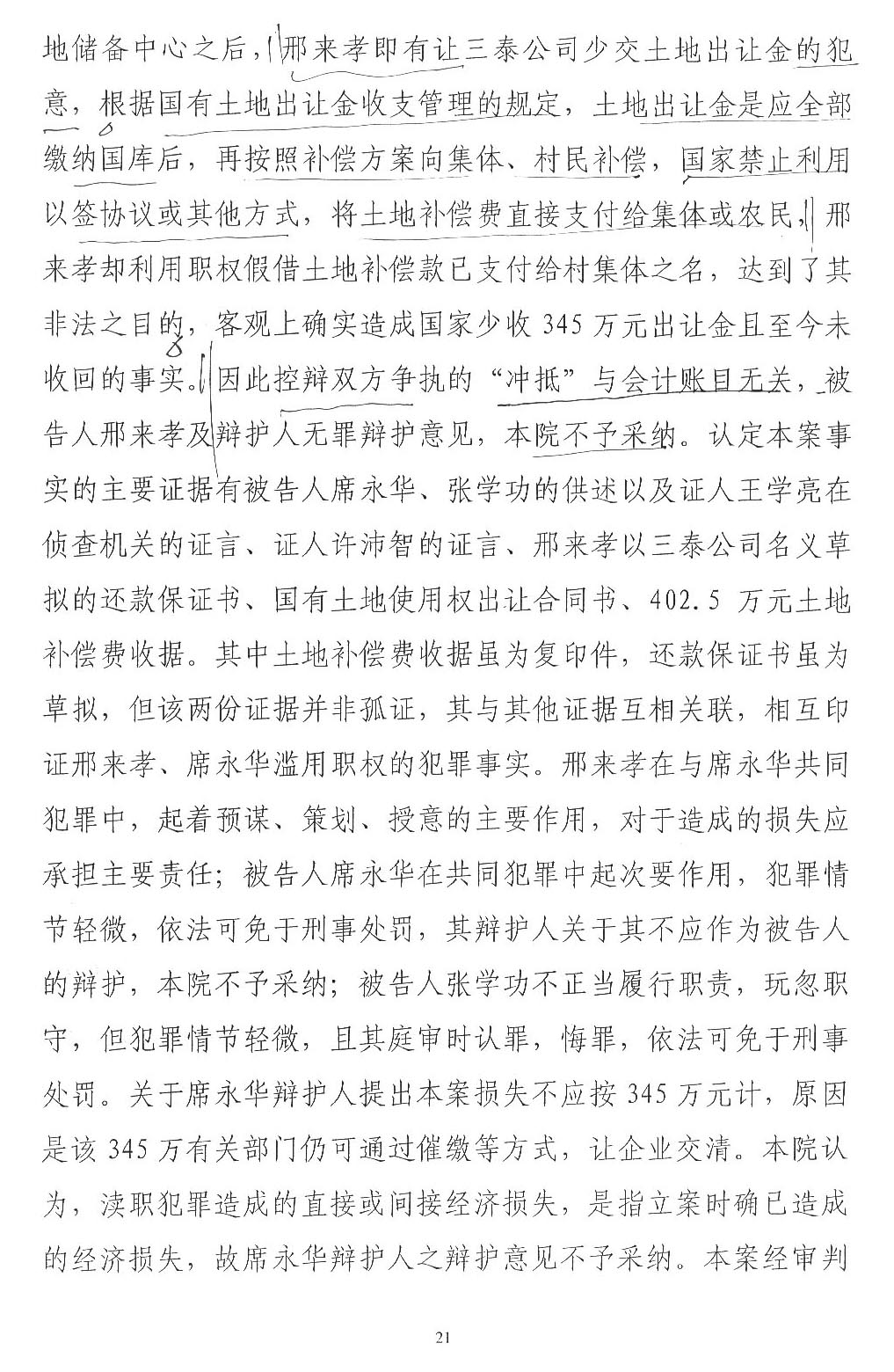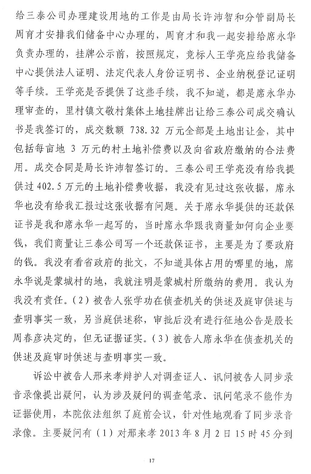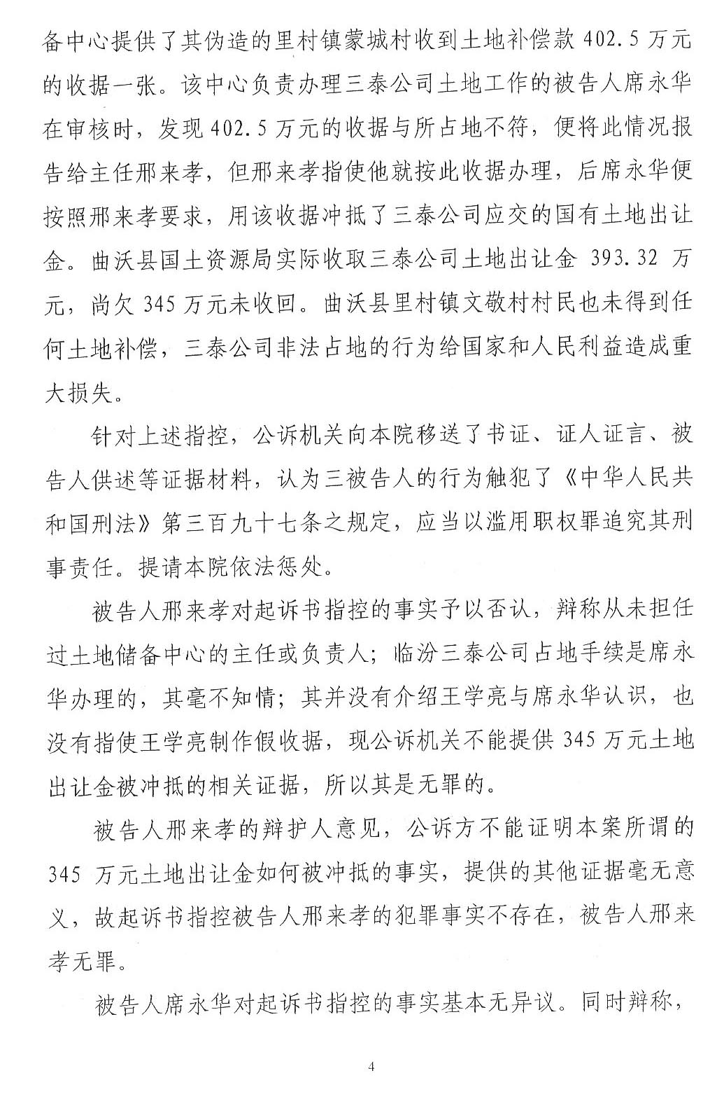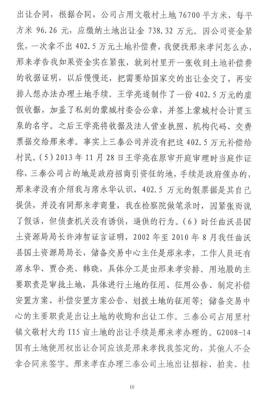 综上所述,1、村委会说没有收到王学亮的款,为何开具收款收据(至今未确定真伪),不属于《刑法》调整范围,应当通过民事诉讼解决。2、公诉机关指控邢来孝冲抵345万元账目后,又告知法庭没有发现被邢来孝冲抵的账目,自认虚假指控,故意制造冤假错案。3、一审判决本案认为中没有评判公诉机关指控邢来孝犯罪事实能否成立,审判委员会直接确定法条的审判行为违法,属于直接抵制习近平让每个案件当事人感受到公平正义精神。