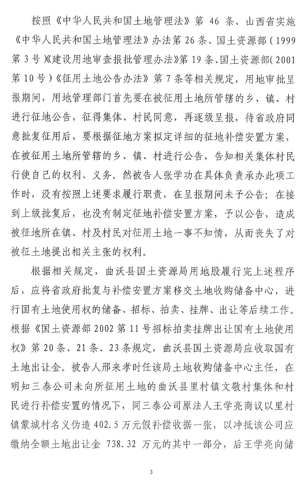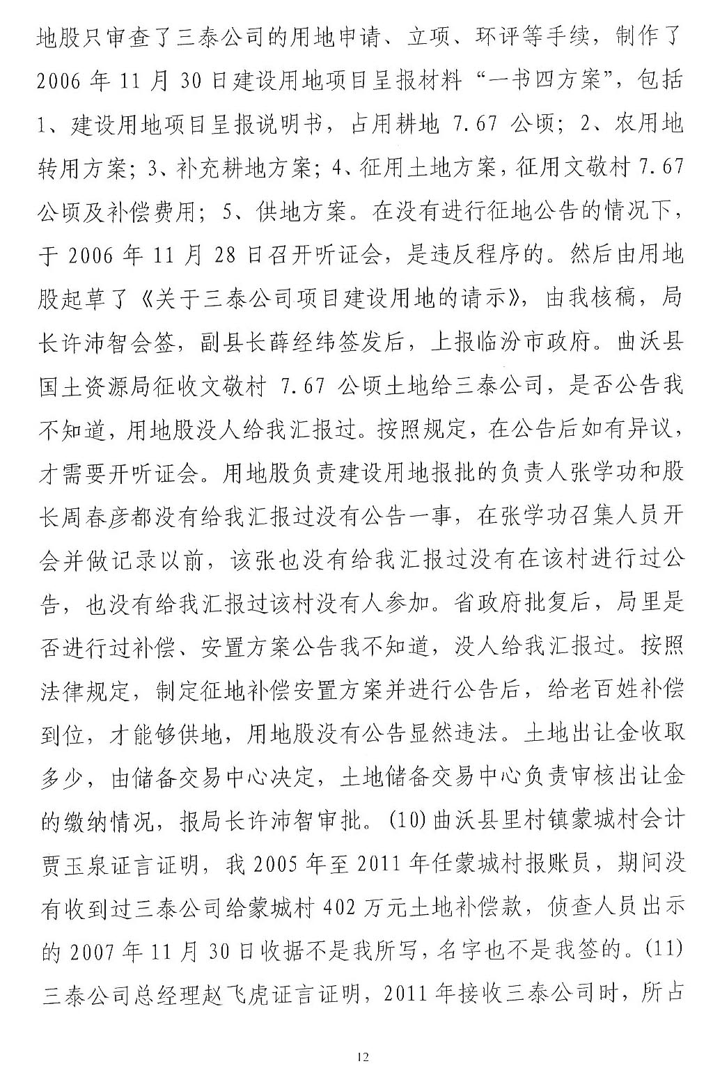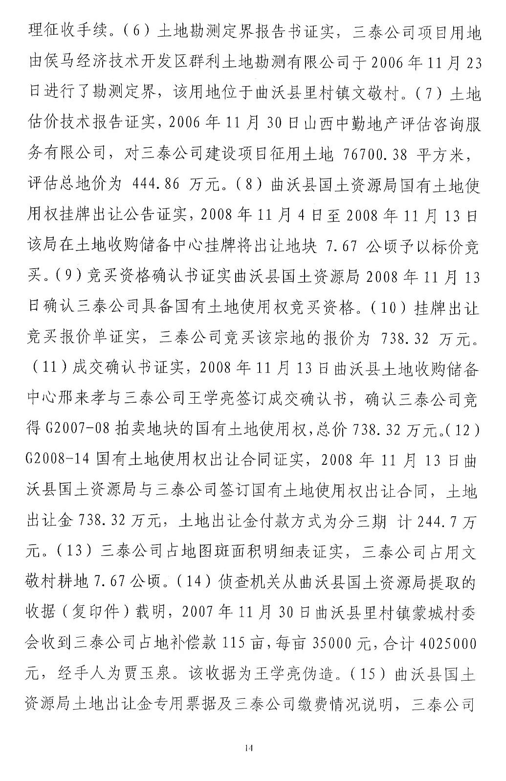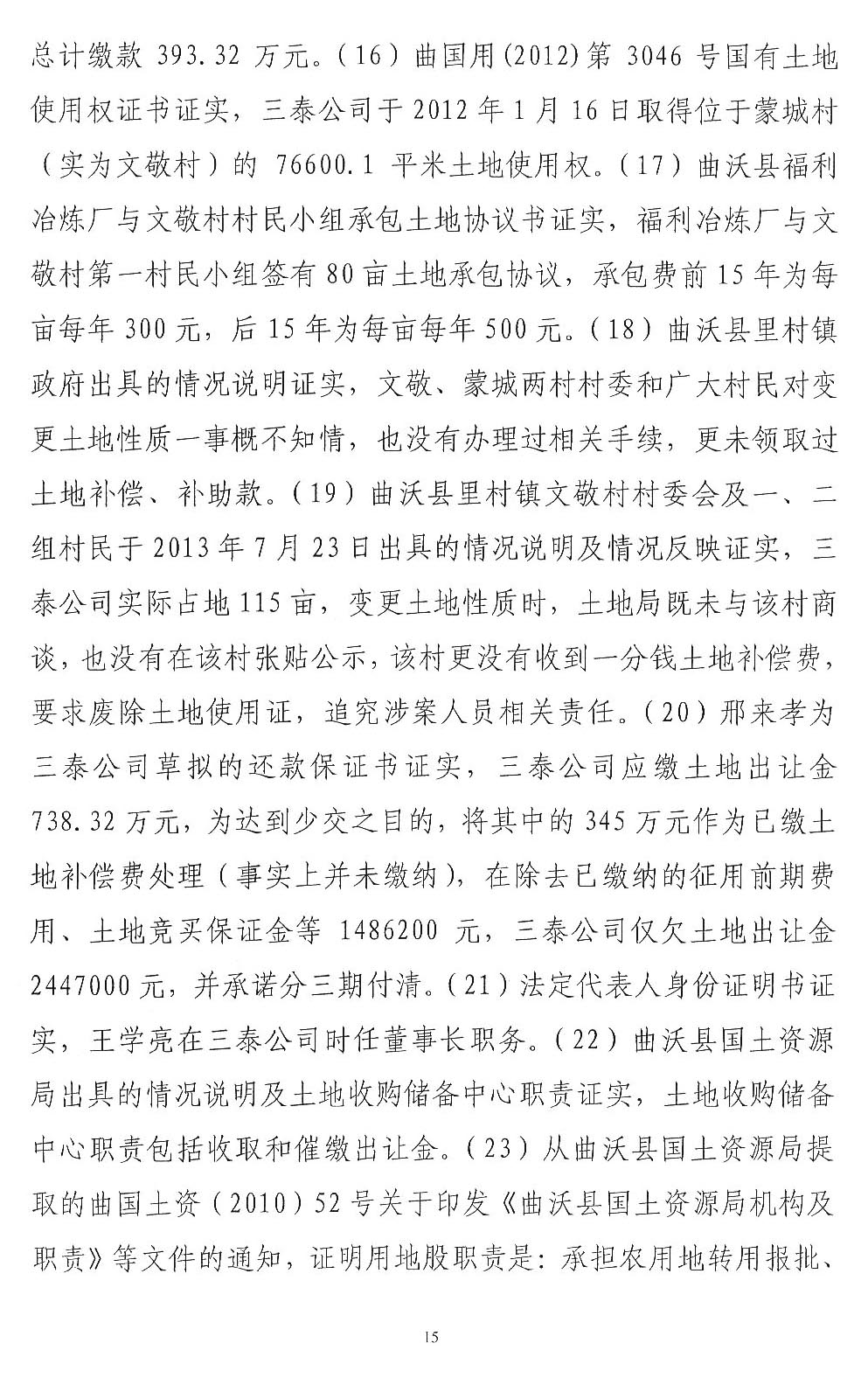 三泰公司发起人王学亮是曲沃县招商引资企业,2003年租用两村农用地建设水泥厂,2007年开始完善土地手续。在完善土地手续过程中,王学亮提供一份村委会盖章的收款收据复印件,企图证明已经向村委会交付征地款的事实,如果是因为这份收款收据发生纠纷,应当通过民事诉讼解决,请求人民法院依法判令王学亮及时支付,加之村民至今还继续要求交付租金,拒绝接收土地补偿欠款345万元,说明村民没有因涉案土地受到经济损失。