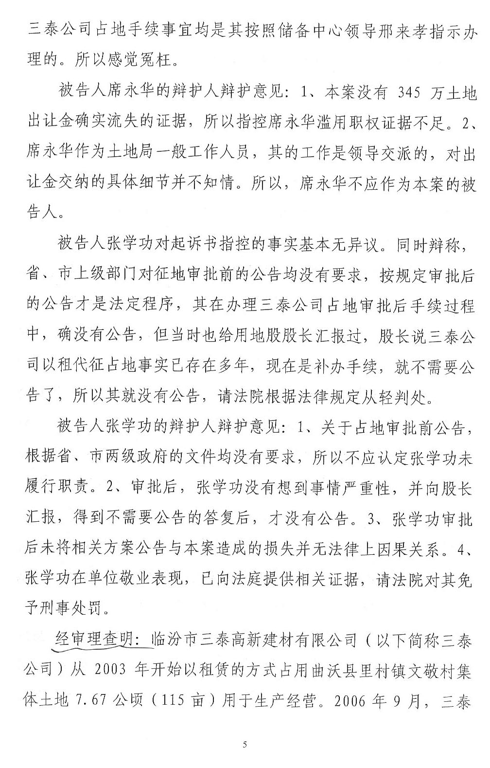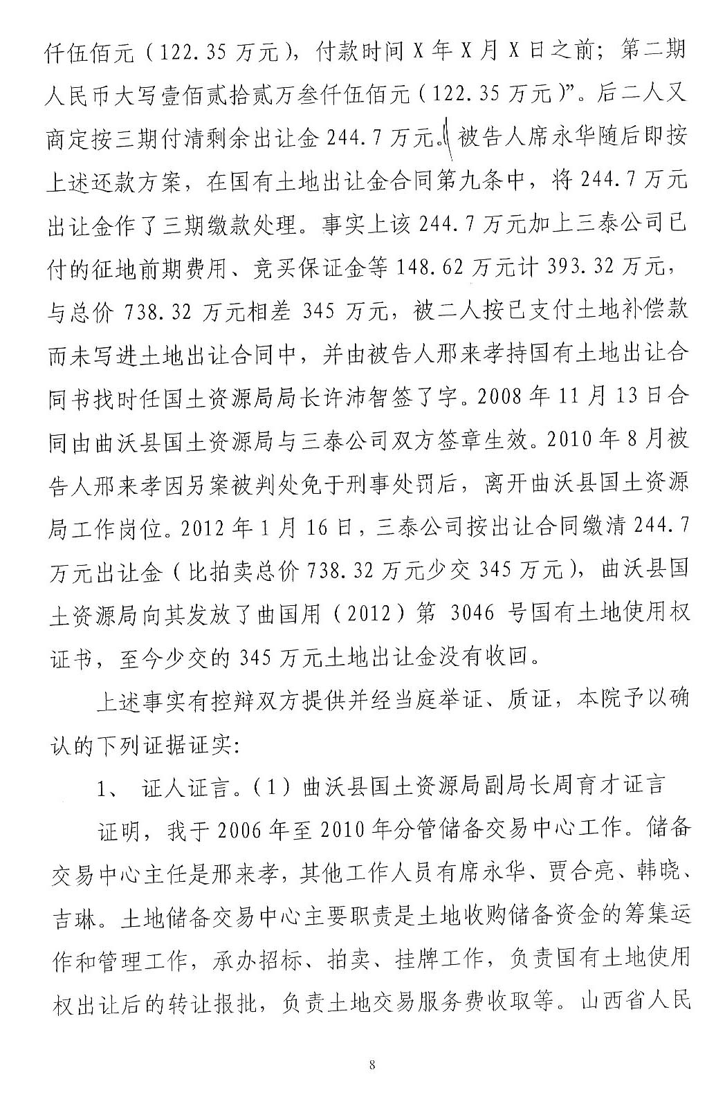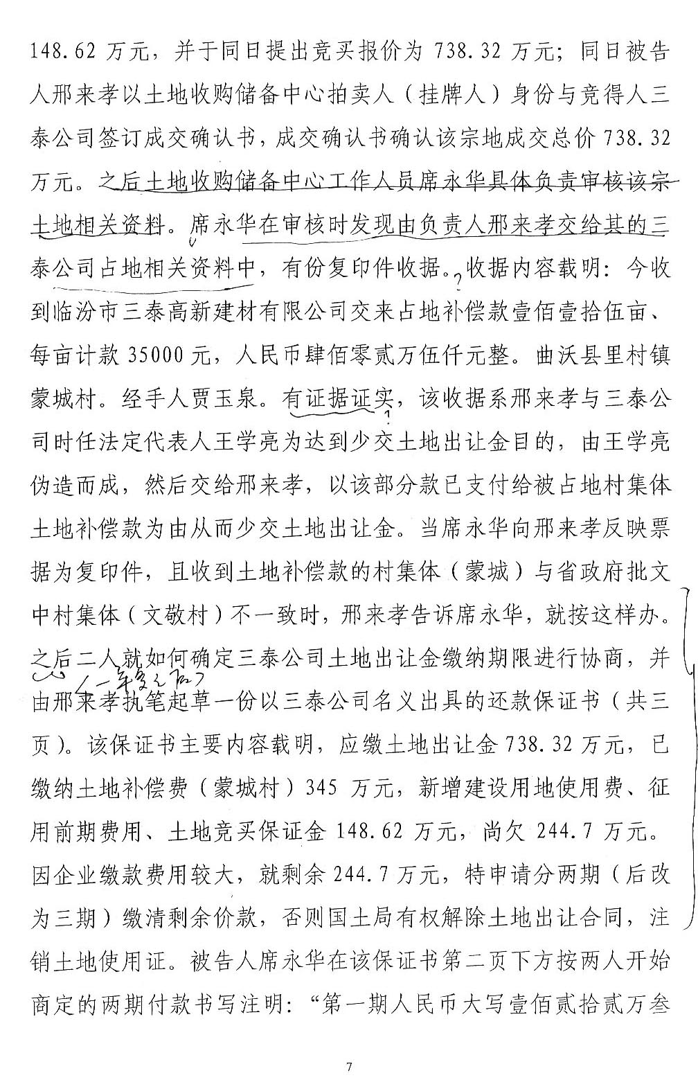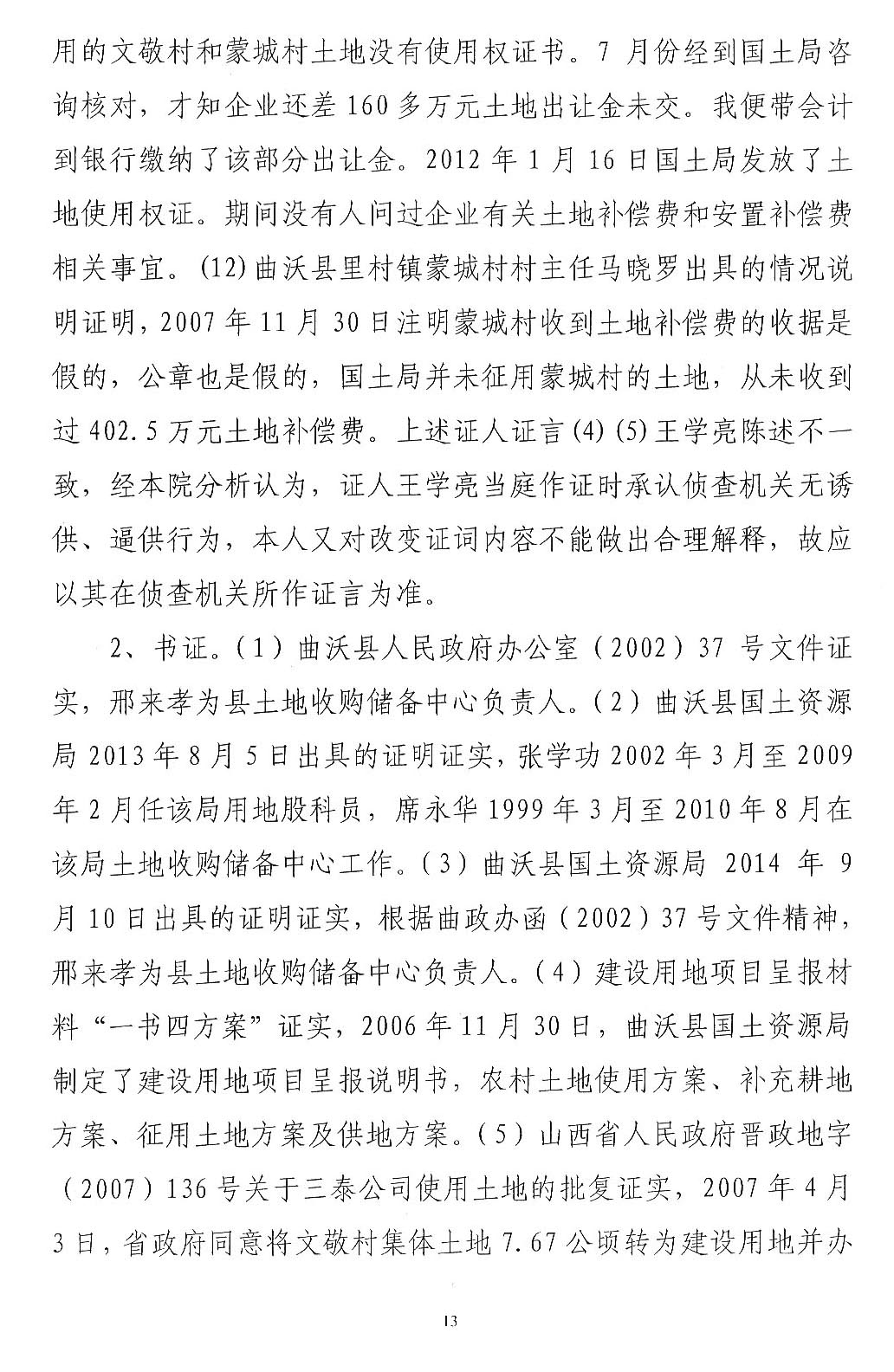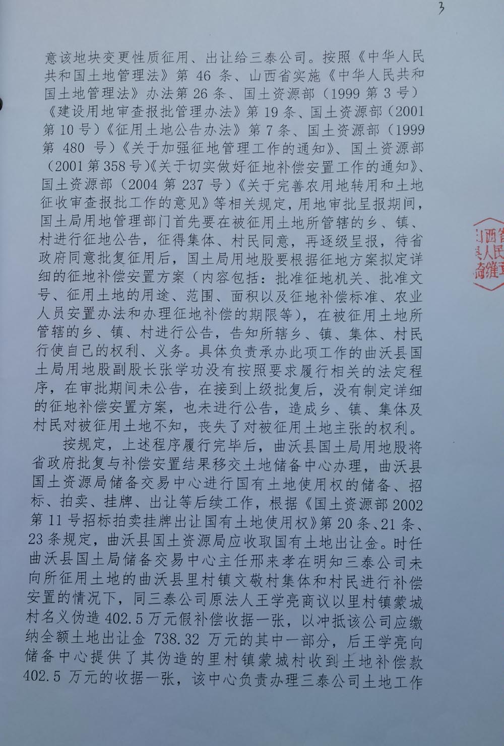 三泰公司发起人王学亮是曲沃县招商引资企业,2003年租用两村农用地建设水泥厂,2007年开始完善土地手续。在完善土地手续过程中,王学亮提供一份村委会盖章的收款收据复印件,企图证明已经向村委会交付征地款的事实,如果是因为这份收款收据发生纠纷,应当通过民事诉讼解决,请求人民法院依法判令王学亮及时支付,加之村民至今还继续要求交付租金,拒绝接收土地补偿欠款345万元,说明村民没有因涉案土地受到经济损失。