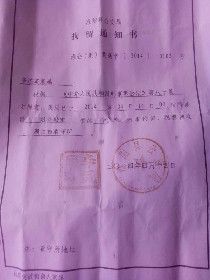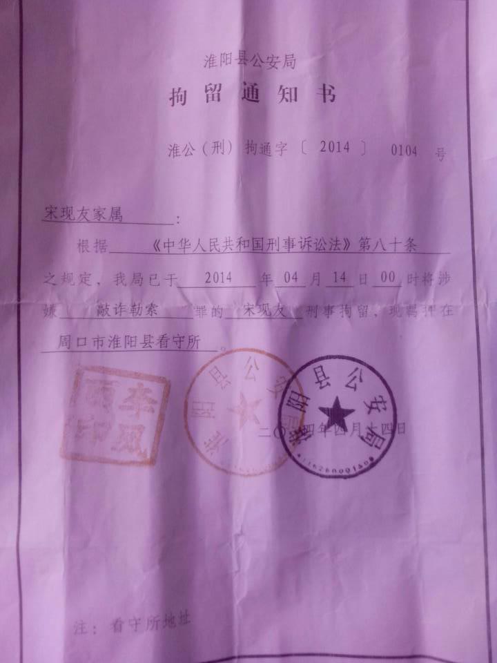 宋争光被取保候审后的2014年5月,其父母得知中央巡视组到河南的消息,在准备向中央巡视组交材举报料时,被当地公安机关以宋争光父母涉嫌敲诈勒索罪,对宋争光父母再次刑事拘留、羁押至今,始终没有任何说法,既没有按照敲诈勒索罪起诉,也没有依法释放宋争光的父母。导致宋争光年初一给我打电话,告知我其没有和父母一起过年心中的痛苦,我听后忍无可忍的流出眼泪,成为我羊年春节一大负担。