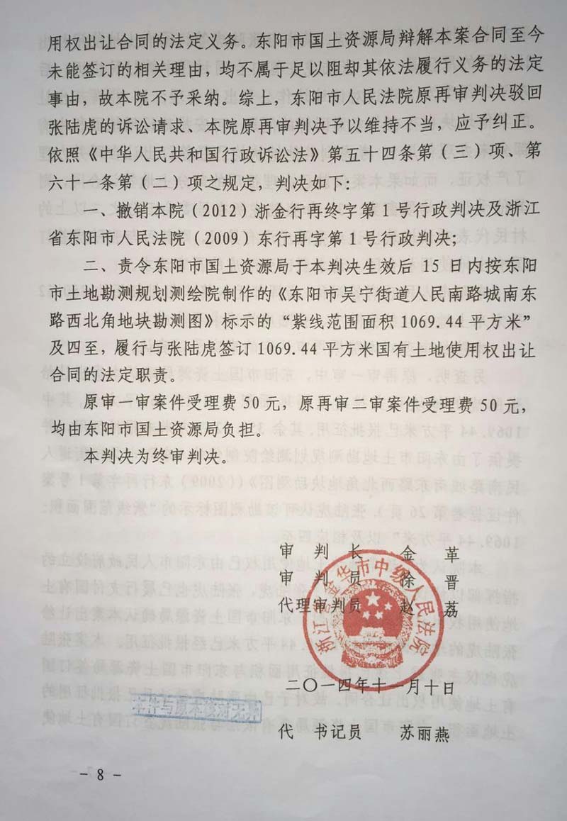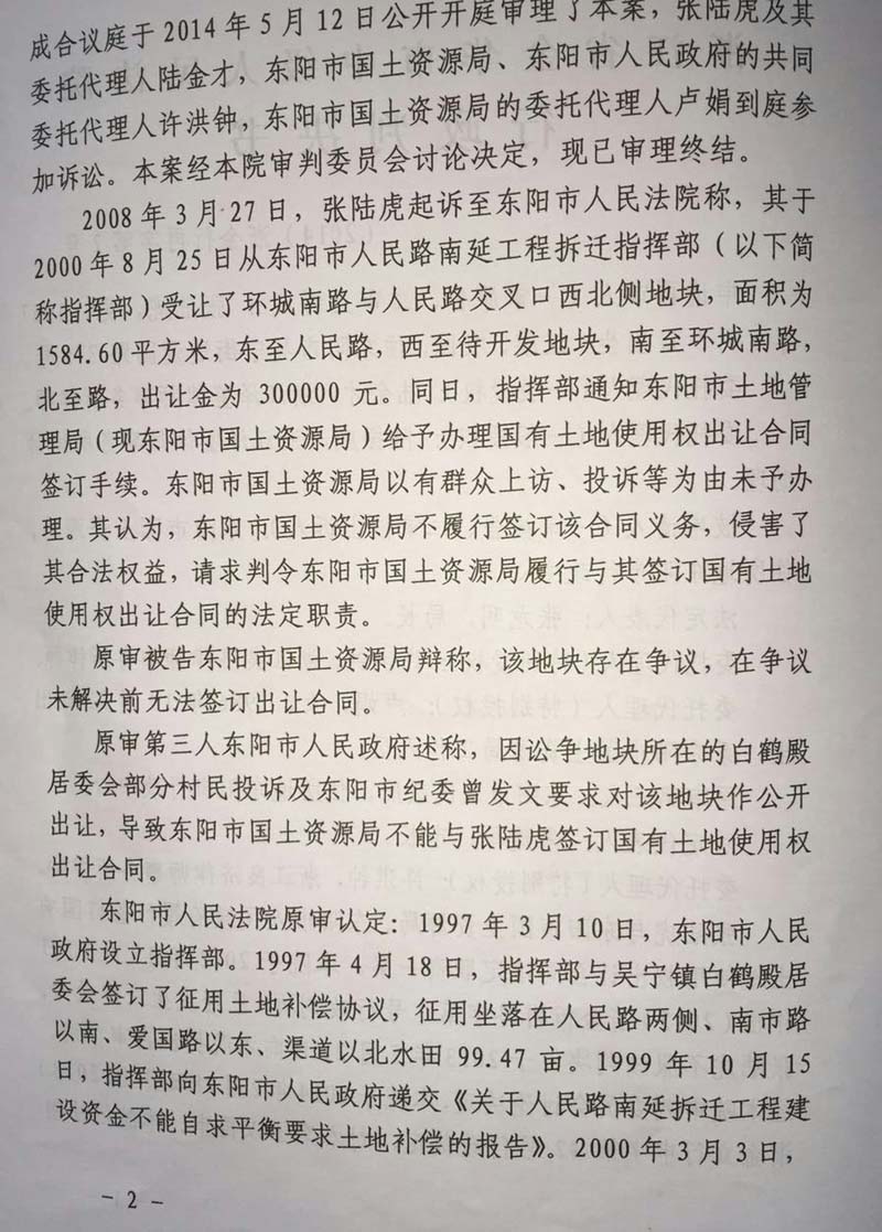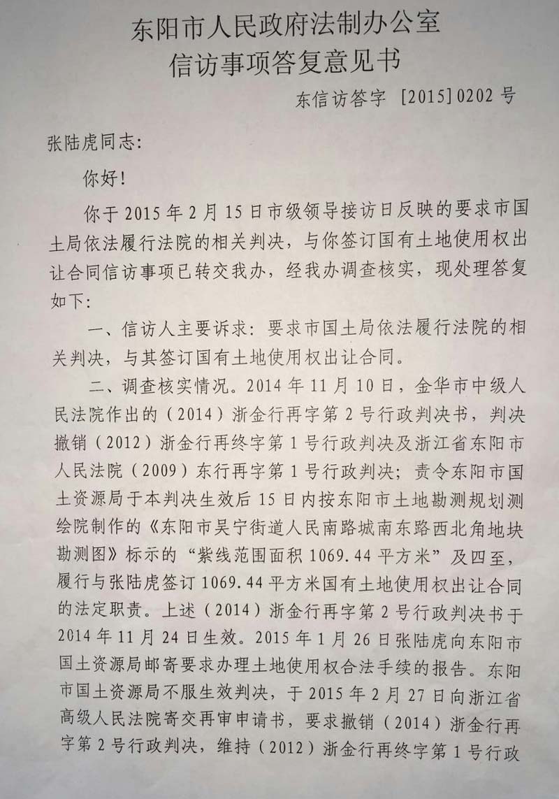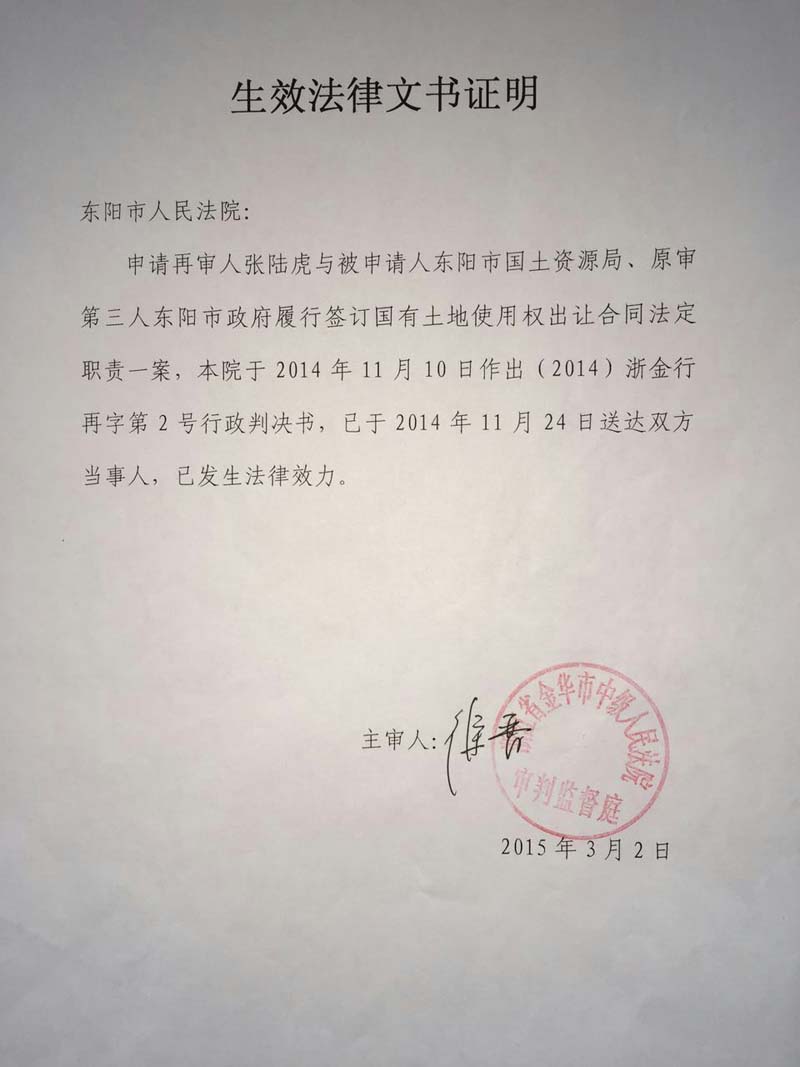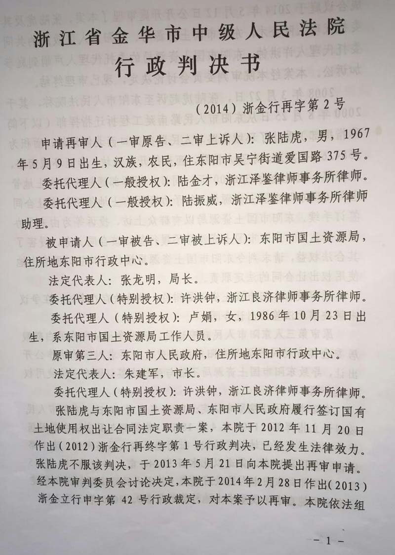 家住浙江省东阳市48岁的张陆虎,以东阳市国土资源局为被告,把东阳市人民政府列为第三人,向人民法院提起(民告官)行政诉讼,走过十几年的艰辛诉讼程序,在中央依法治国会议后获得(2014)浙金行再字第2号行政判决,张陆虎终于等待到胜诉的一天,认为平息了十几年向政府的维权之路。