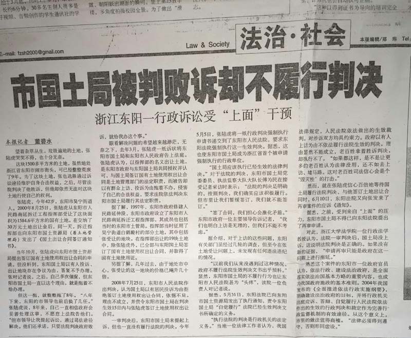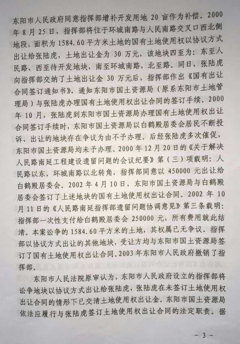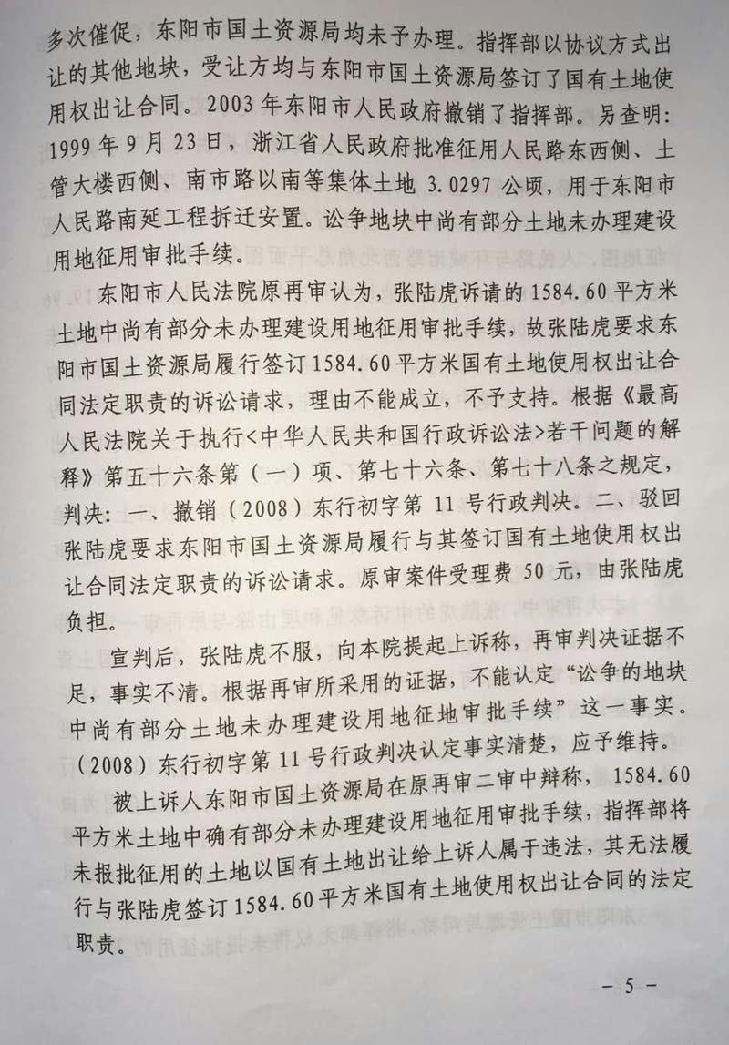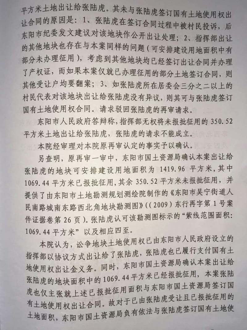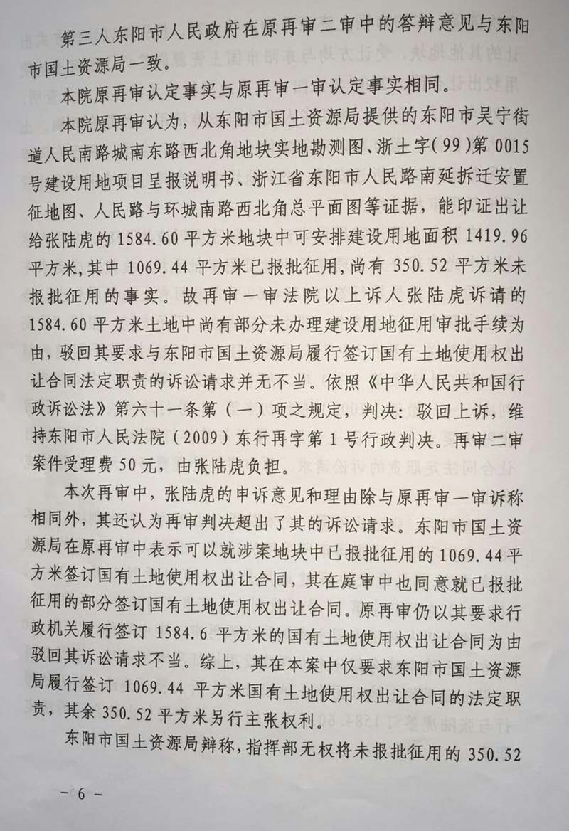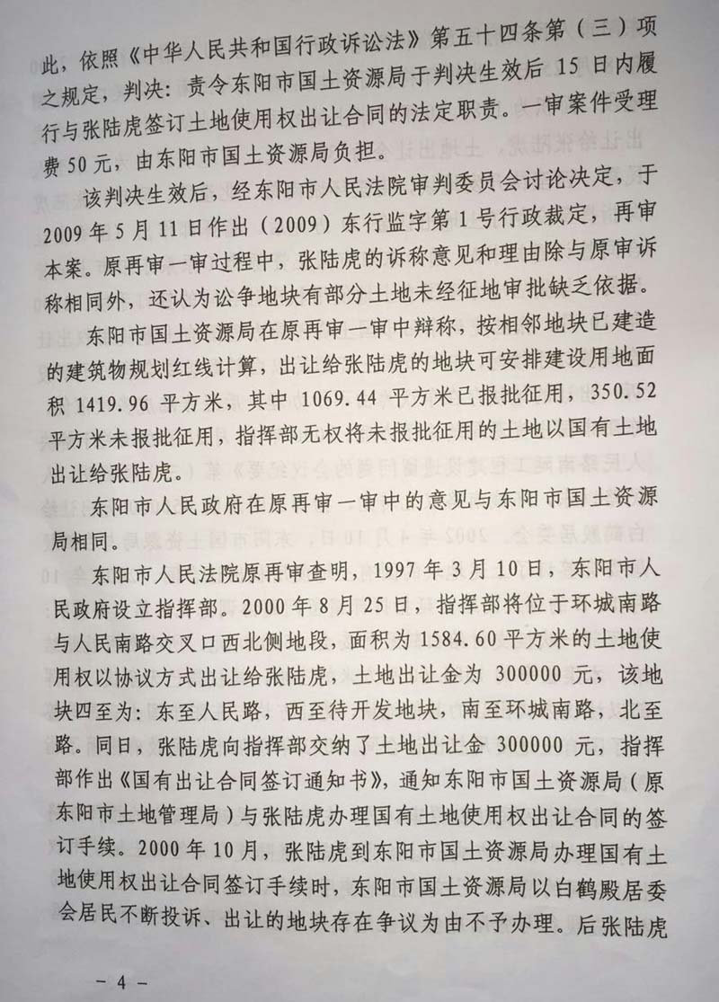 家住浙江省东阳市48岁的张陆虎,以东阳市国土资源局为被告,把东阳市人民政府列为第三人,向人民法院提起(民告官)行政诉讼,走过十几年的艰辛诉讼程序,在中央依法治国会议后获得(2014)浙金行再字第2号行政判决,张陆虎终于等待到胜诉的一天,认为平息了十几年向政府的维权之路。