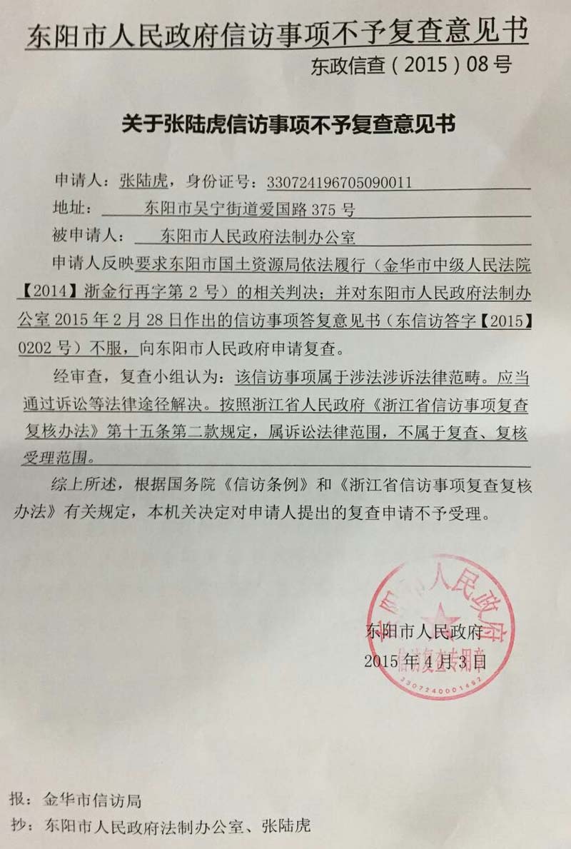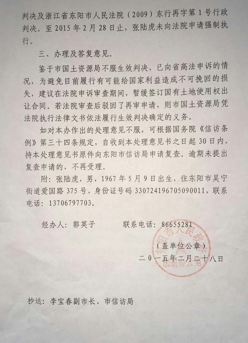 在执行过程中的2015年2月28日,东阳市人民政府的领导们无视不得干预司法的强制性规定,却滥用职权的把人民政府的印章盖到一份公开抗拒中央依法治国的文件上,太搞笑还是太任性了。