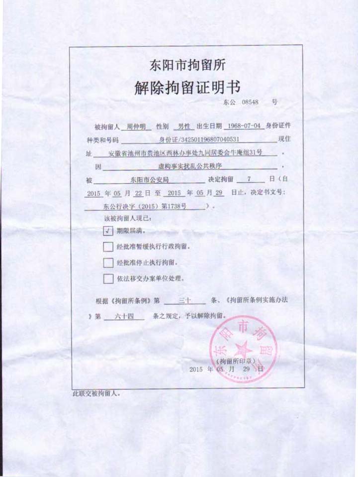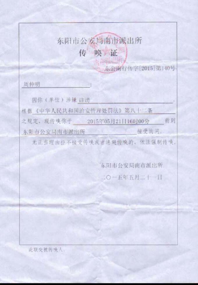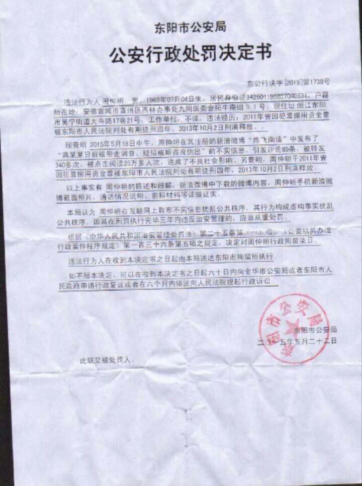2015年5月21日,东阳市公安局下属的派出所对周仲明进行传唤,询问周仲明为何在网上发布核实蒋永志是否被带走接受调查信息后,以周仲明涉嫌扰乱公共秩序为由,对周仲明作出行政拘留7日的行政处罚决定。