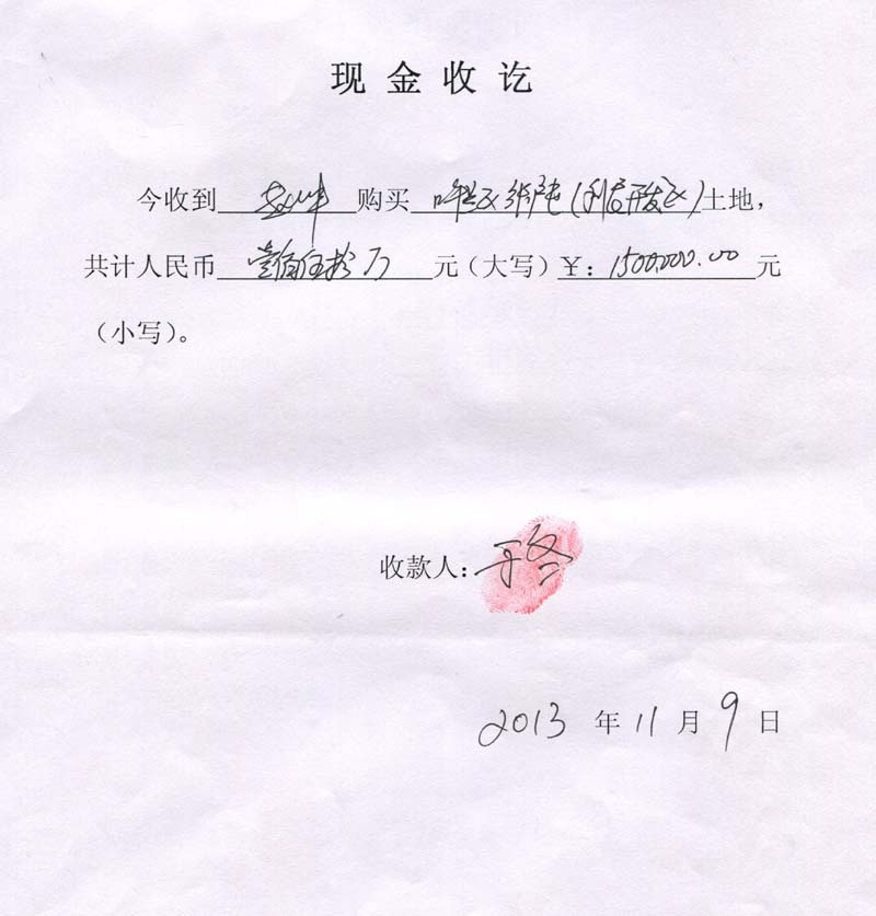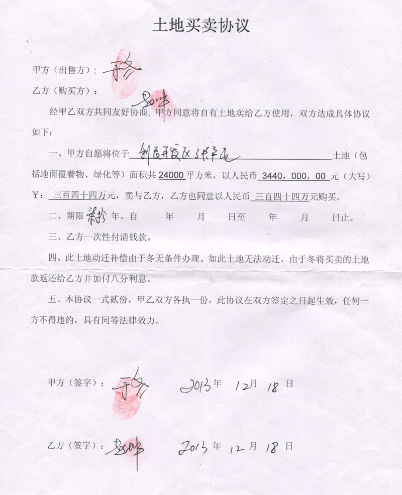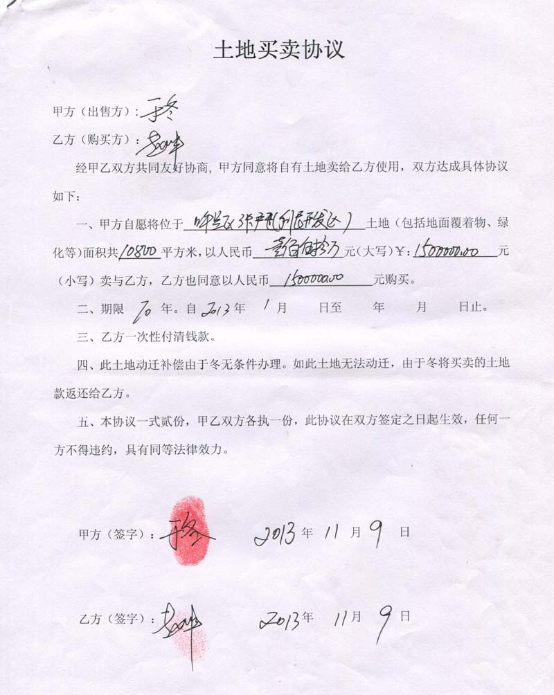2、2013年11月9日,于冬再次虚构事实真相与祝海智签订《土地买卖协议》,将位于“呼兰区张户屯(利民开发区)土地(包括地面覆着物、绿化等)面积共10800平方米”,150万元价格卖给祝海智使用,骗取祝海智人民币150万元,并非法占为己有。