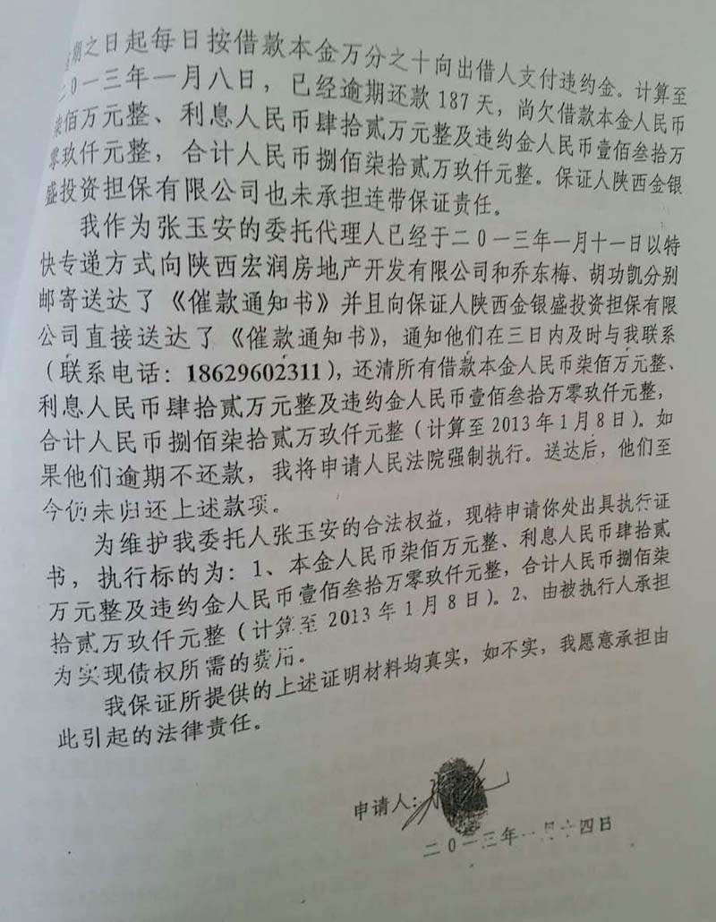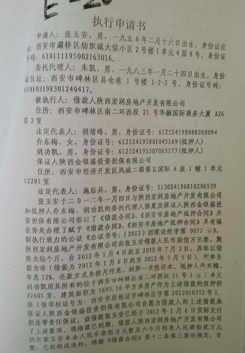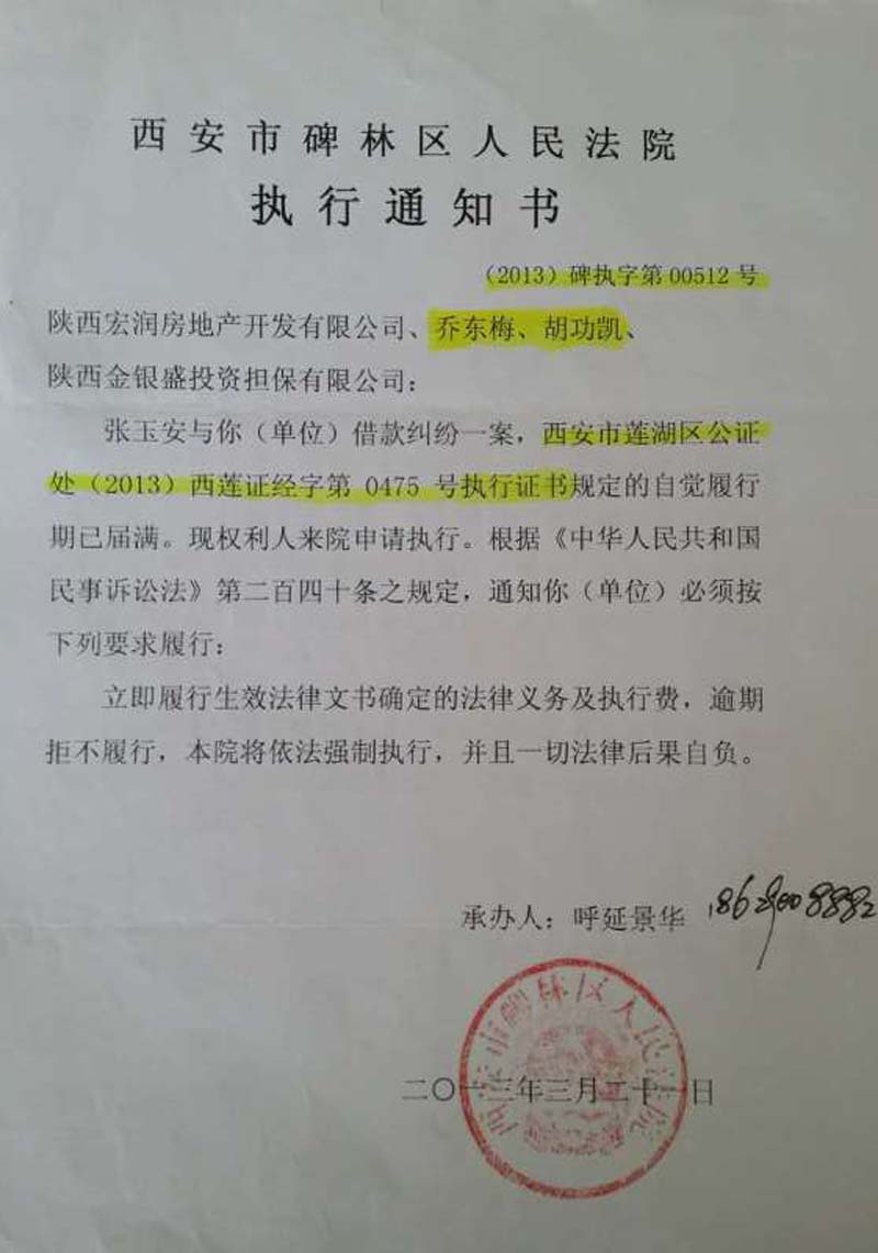 碑林区人民法院收到朱凯申请后立案执行,并于2013年3月21日发出(2013)碑执字第00512号执行通知书,故意把申请人改为张玉安(见两份申请人主体不同的执行通知和申请书),指派呼延景华法官担任执行员。
