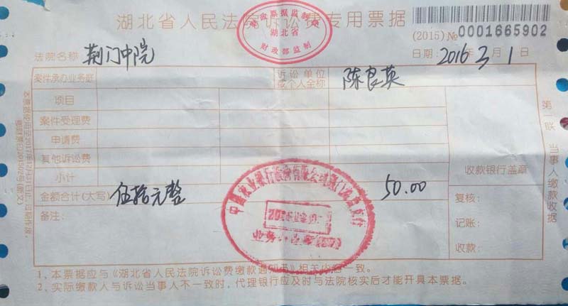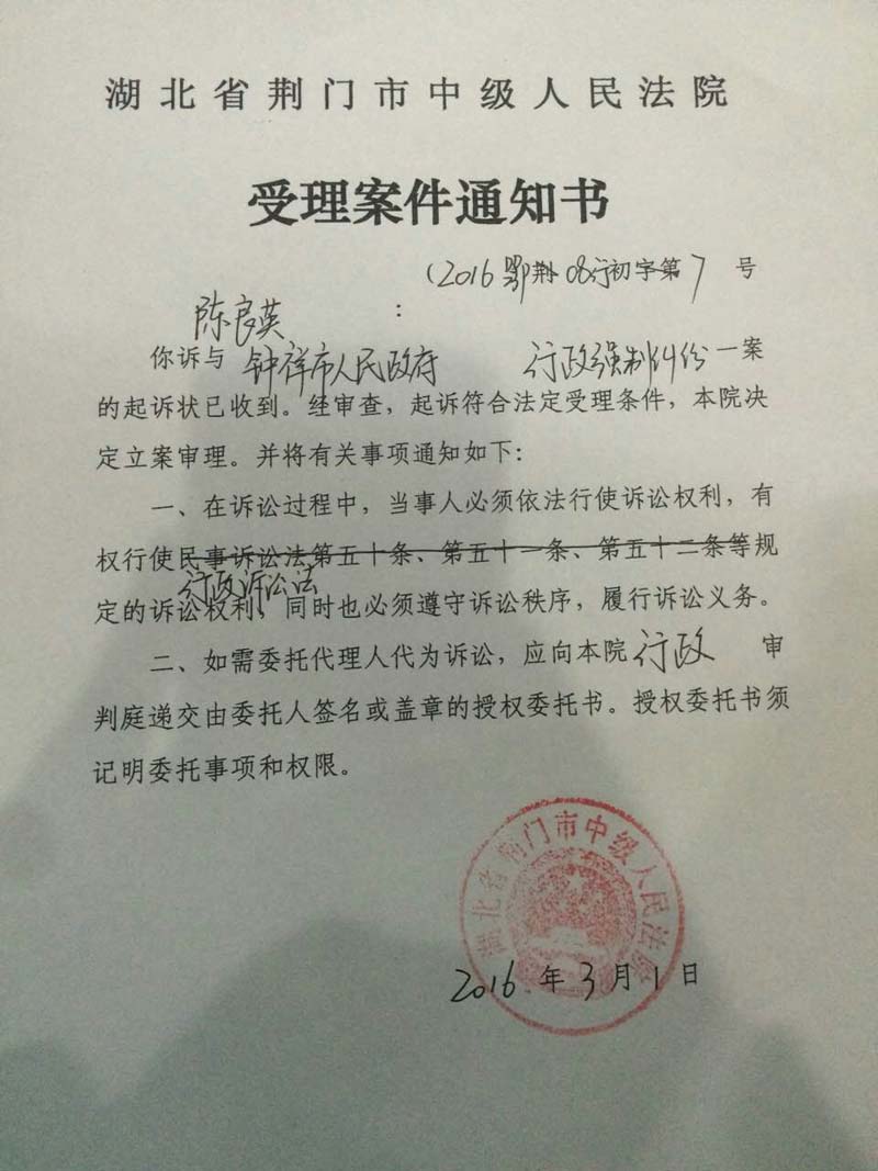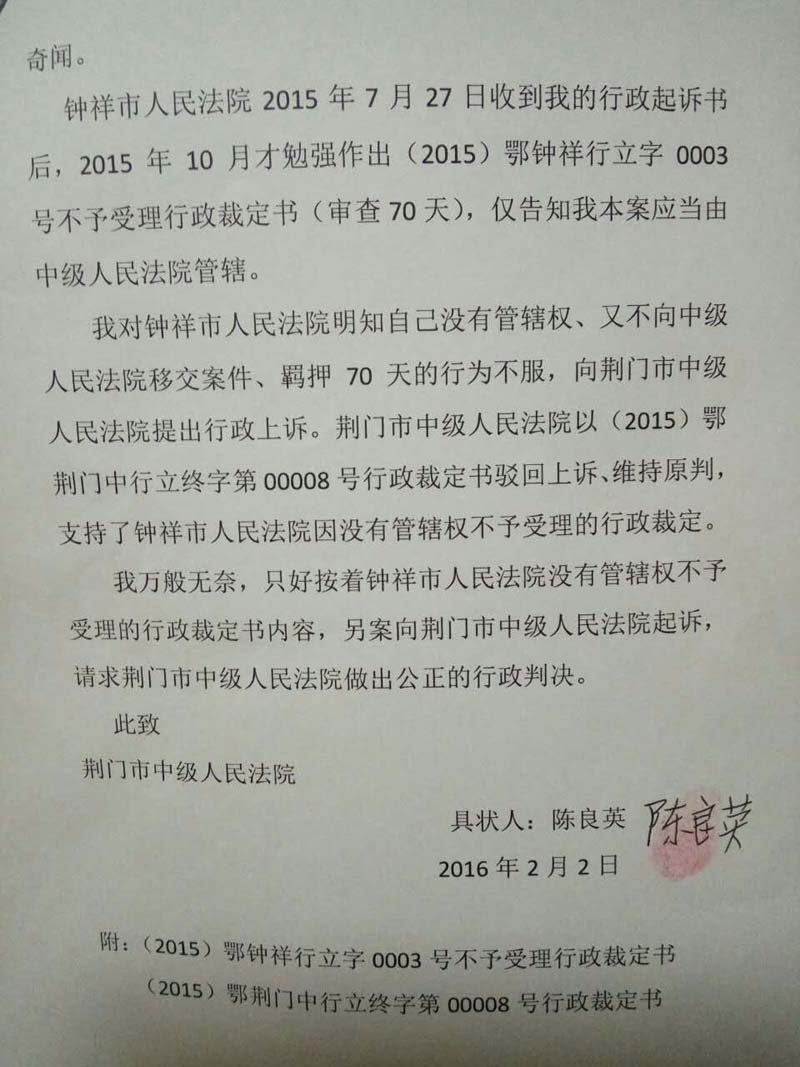 陈良英2015年又去北京马家楼上访,被钟祥市人民政府派人带回老家,放在 宾馆看管51天之久,就连睡觉也要一男、一女在陈良英左右陪同,让陈良英过着没有尊严的51天(混居)。陈良英被送回家后(变相释放),认为钟祥市人民政府侵害自己合法权益,并以钟祥市人民政府为被告,向钟祥市人民法院提起行政诉讼。钟祥市人民法院收到陈良英行政起诉书后,告知陈良英向中级人民法院起诉,属于正确口头告知。由于陈良英没有文化、不懂法律,误认为钟祥市人民法院故意袒护政府,不给陈良英立案,所以再次去北京久敬庄上访。