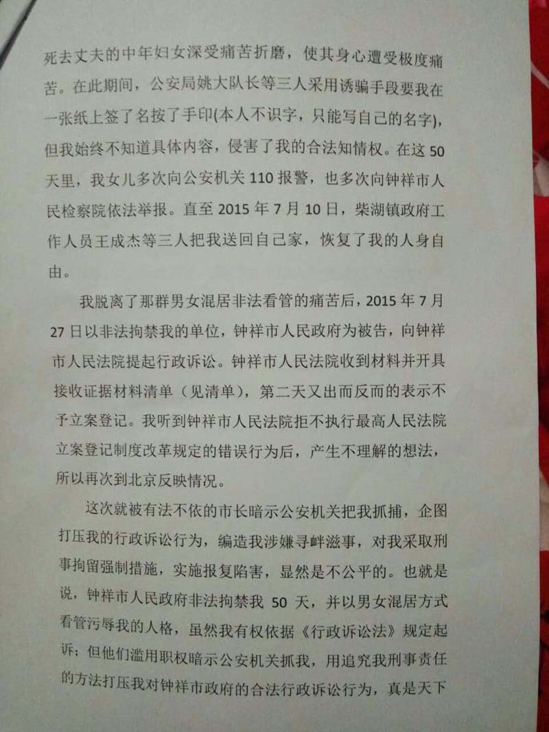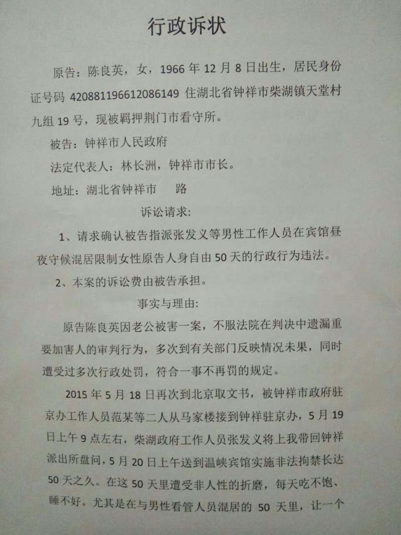 陈良英因被政府非法拘51天,在男、女混居陪同下度日如年,变相释放回家之后,以钟祥市人民政府为