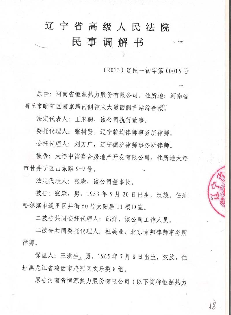 河南恒源热力股份有限公司(以下简称恒源公司)因合作收益起诉大连中裕嘉合房地产开发有限公司(以下简称中裕公司),大连中院受理后,因合作项目没有竣工、无法计算收益,将此案交给辽宁高院帮助调解结案。法官在准五星级宾馆吃住,不仅利用国庆节假日期间进行协调,更是在没有制作调解笔录的情况下,做出了(2013)辽民一初字第00015号民事调解书,把案外人王洪生列为非诉讼地位的“保证人”及甲方,把被告中裕公司列为乙方。以上所有行为,是《民事诉讼法》找不到任何依据的。