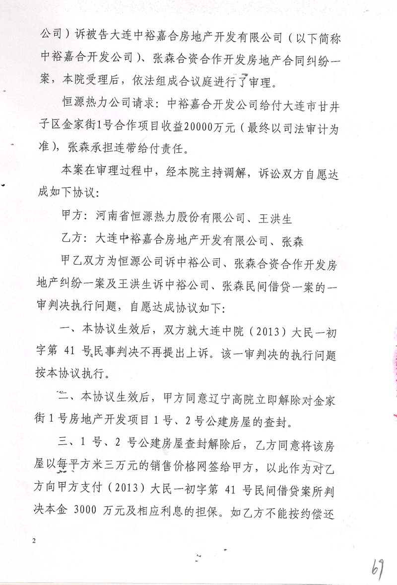 2010年9月17日,大连中裕嘉合房地产开发有限公司为甲方(以下简称中裕公司)与河南省恒源热力股份有限公司为乙方(以下简称恒源公司)签订金家街1号房地产开发项目合作协议,双方约定项目总投资29135万元人民币,由乙方投入资金5000万元,其余资金由甲方负责筹集,并约定甲方股权占60%,乙方股权占40%,扣除成本和费用后,净利润按股权比例分配(风险共担属于法定情形)。中裕公司2012年4月20日与自然人王洪生签订2000万元借款协议,并完成交付,中裕公司按期归还2000万元,尚欠280万元利息。