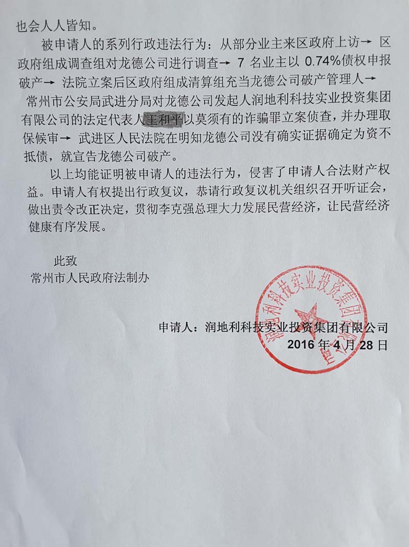 “我们对法院宣布龙德置业破产的程序存在质疑。”王和平对记者表示,龙德公司名下资产大于负债,远未到破产阶段,但在法院的操办下,龙德置业被认定为“资不抵债”而被宣判“破产”。