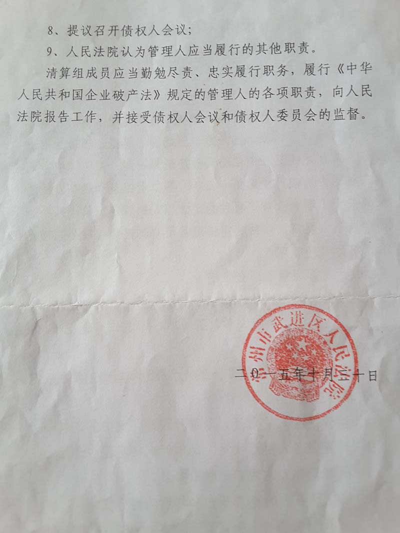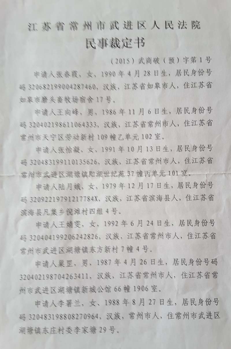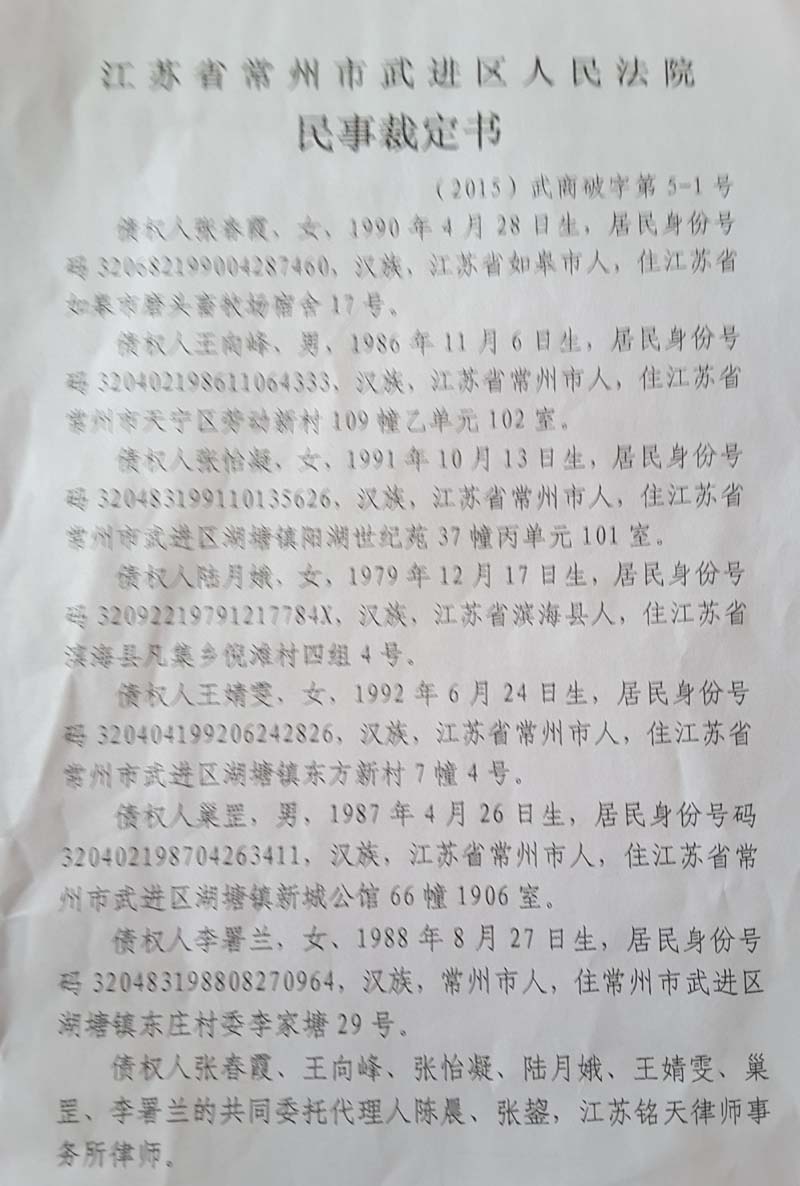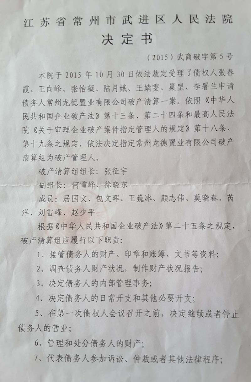 记者梳理法院相关裁定发现,破产的动议来自于6个购房人。2015年10月13日,他们向法院提交申请,两周后的10月27日完成听证程序,而3天后,法院即裁定受理申请,并于当天指定破产管理人。4天之后的11月4日,破产管理人在法院的支持下,采取突然行动,强行控制了公司公章、执照等。2016年2月25日,法院裁定宣告破产。