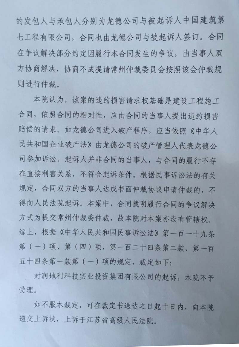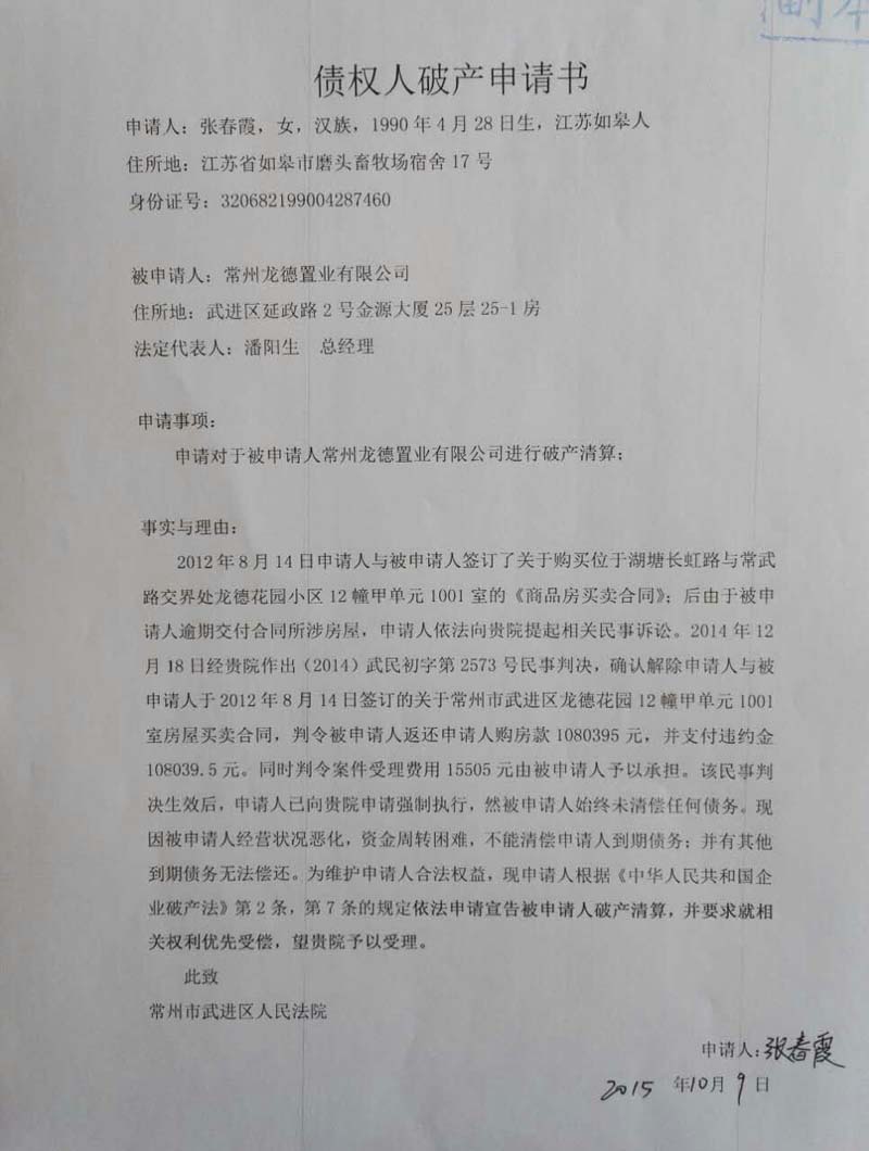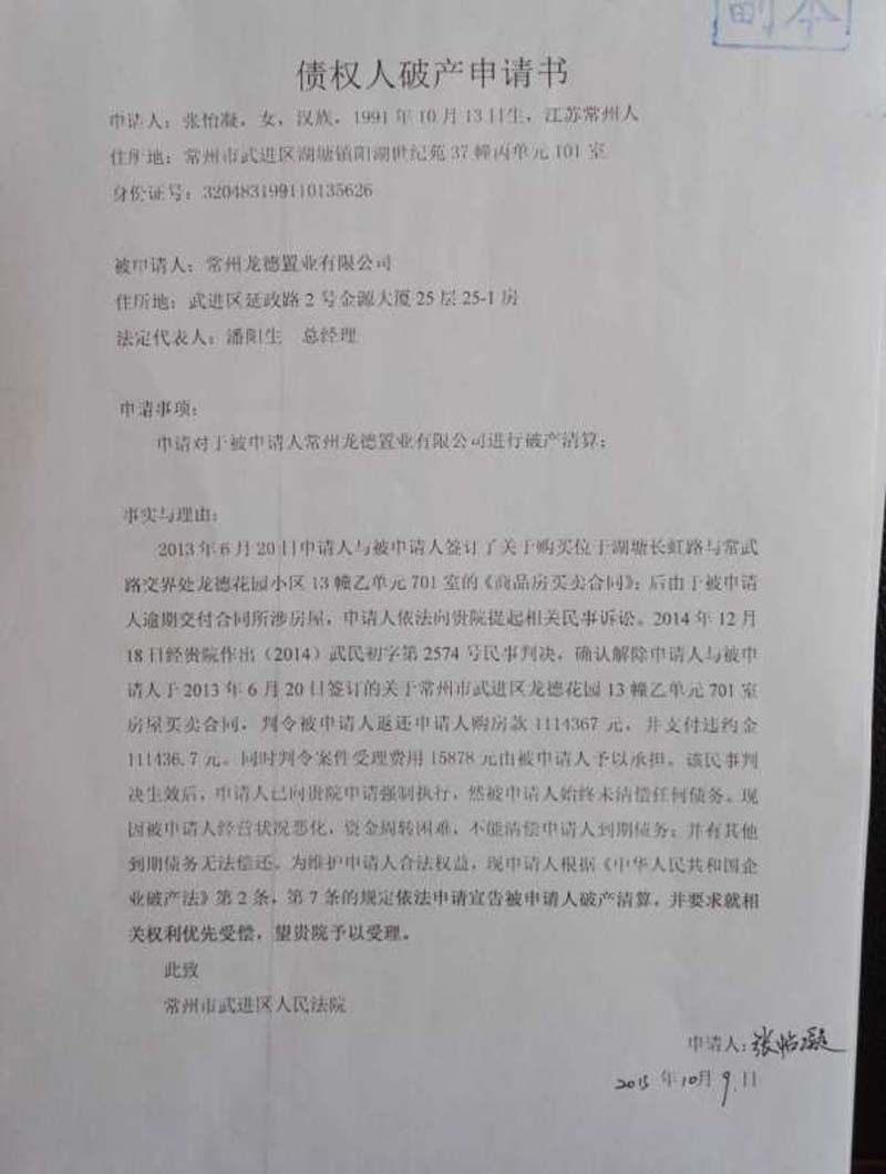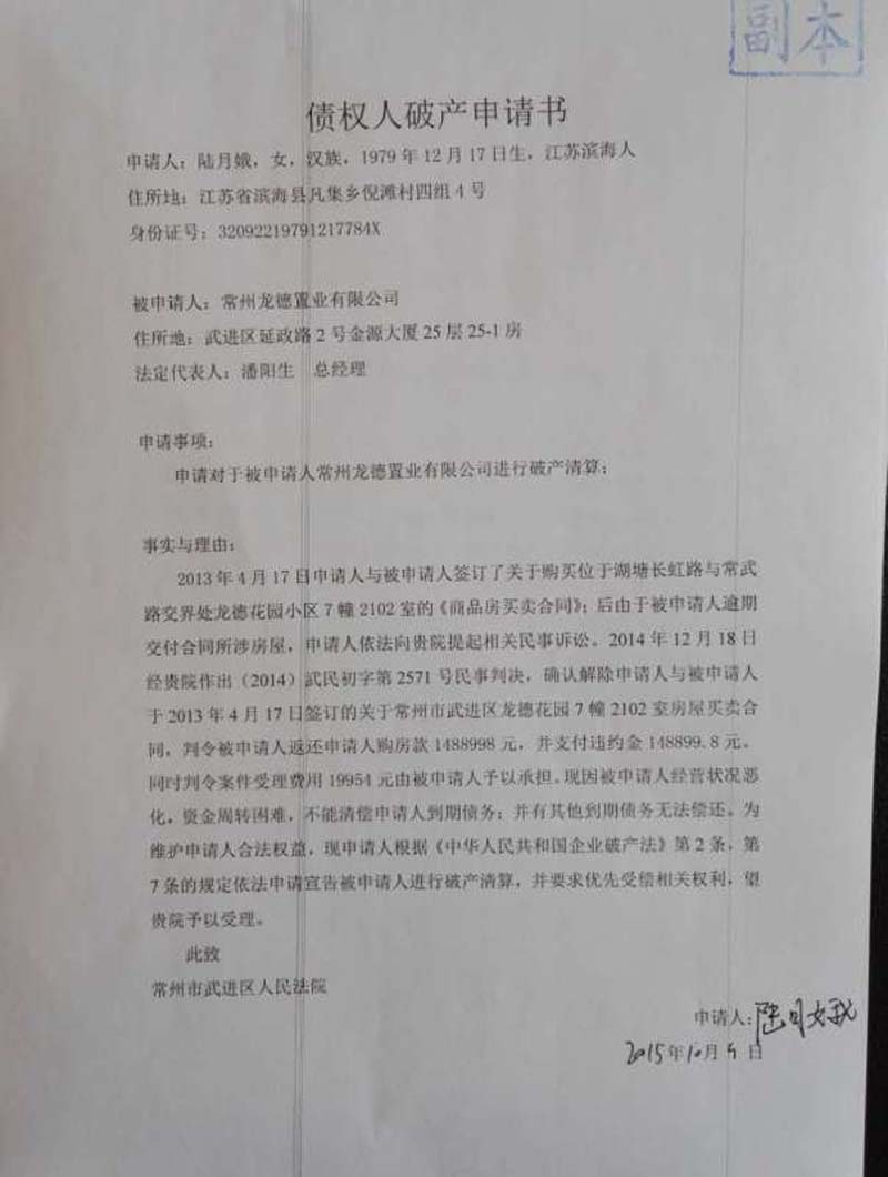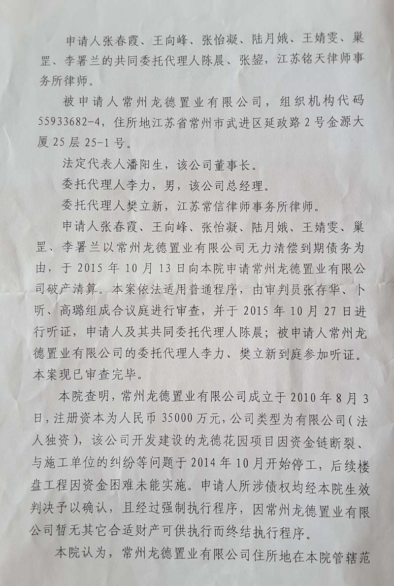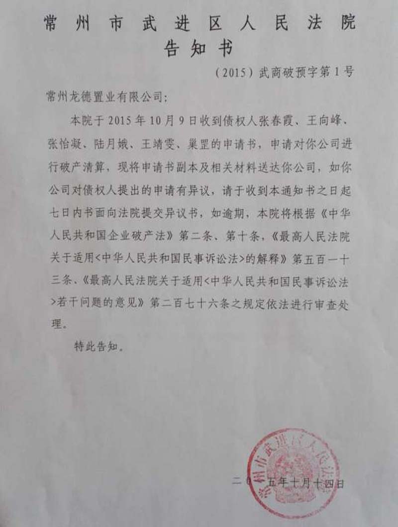 2015年年中,6名购房业主向法院提起诉讼,要求与开发商解除购房合同,退还购房款。上述诉求获法院支持。因判决未获执行,这些购房业主直接向法院提出了破产清算申请。2016年春节后不久,法院裁定宣布龙德置业破产。