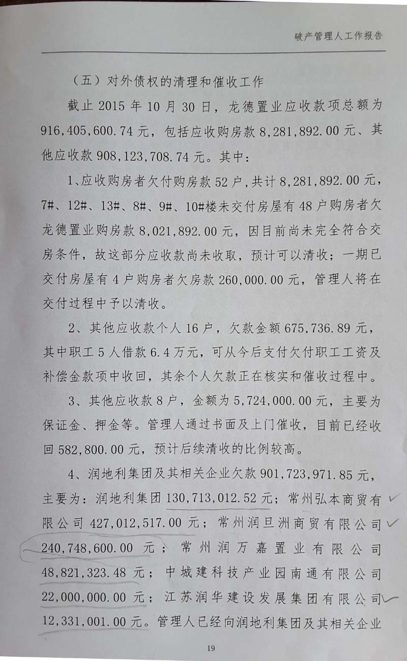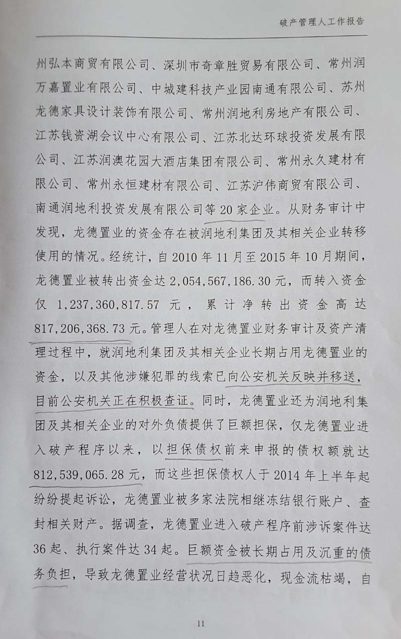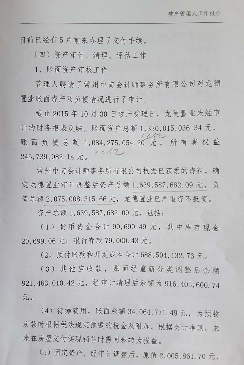 记者获得的破产管理人提供的第一次债权人会议资料显示,截止到2015年10月30日破产受理日,龙德置业未经审计的财务报表反映,账面资产总额为13.30亿元,账面负债总额10.84亿元,所有者权益为2.46亿元。经常州中南会计师事务所审计,确定龙德置业的资产和负债分别是16.40亿元、20.75亿元,已严重资不抵债,缺口高达4.35亿元。