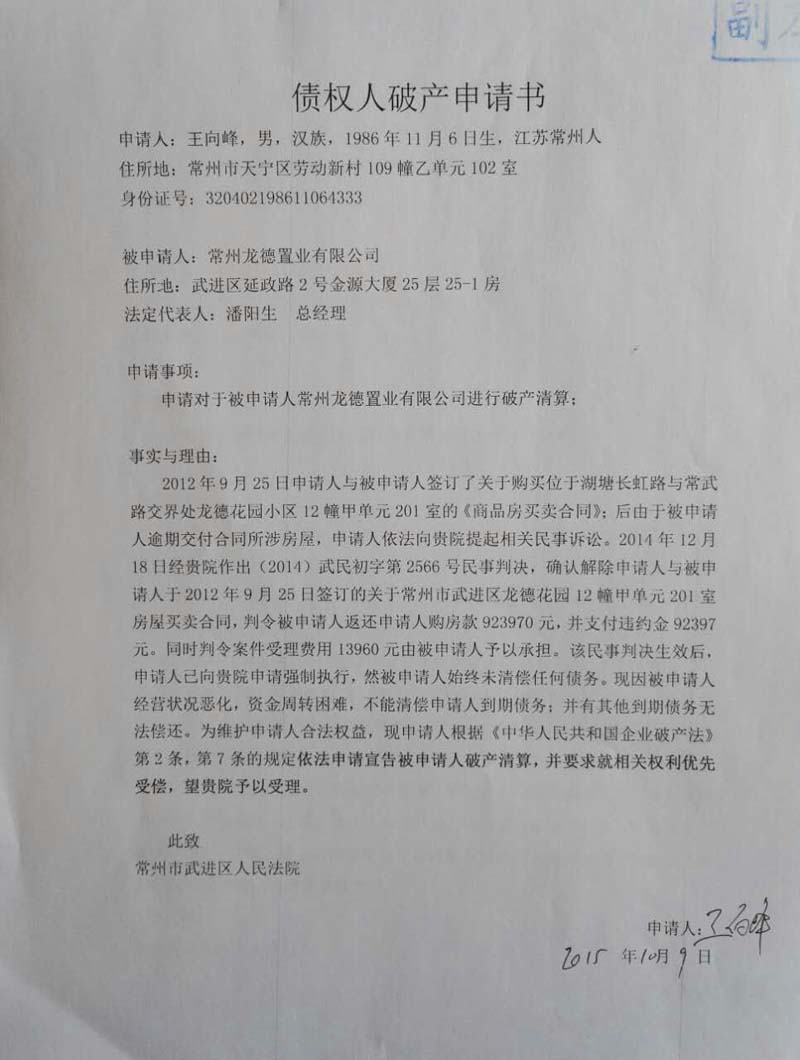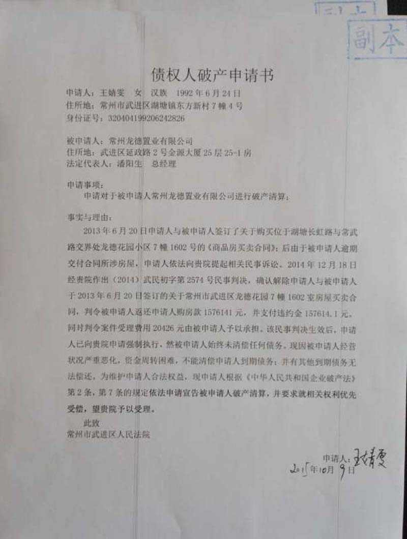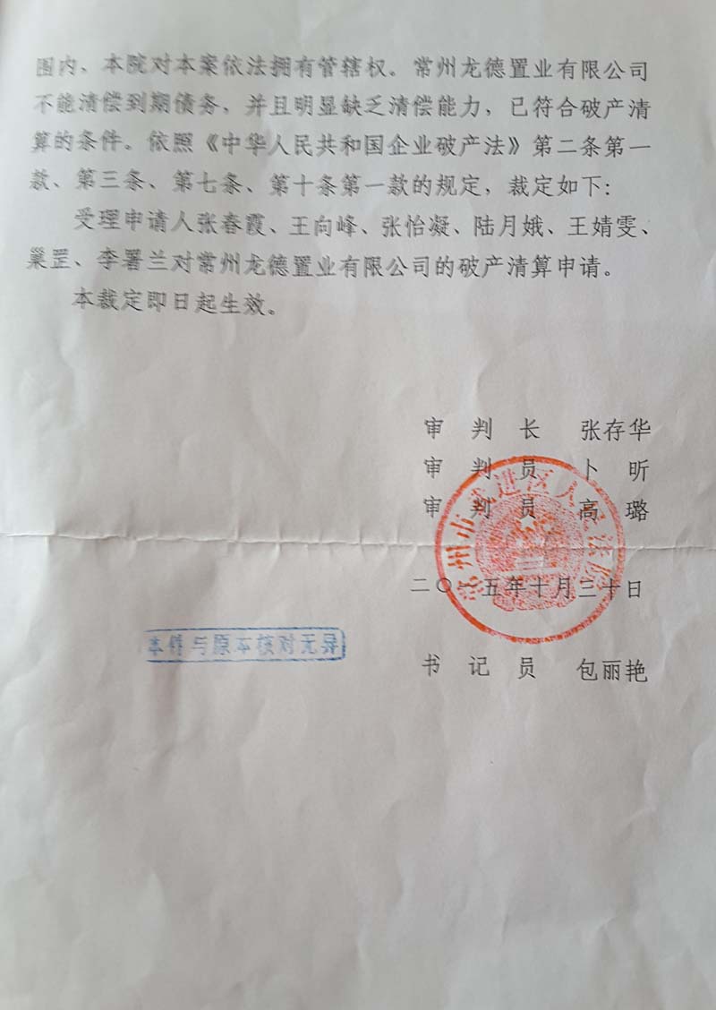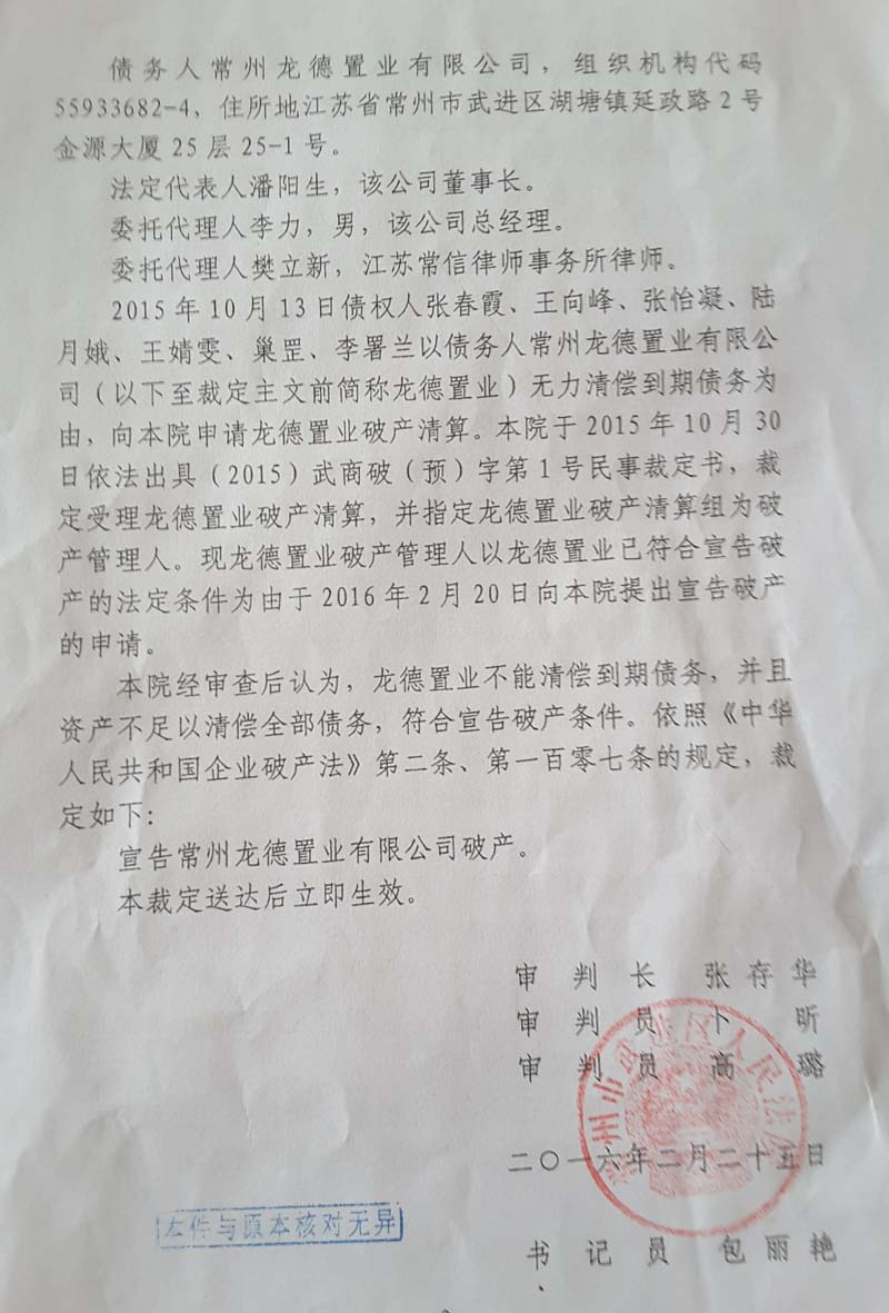 而承办法官、武进区人民法院民庭庭长张存华则是另一种说法。他表示,宣布龙德置业破产,在于其不能清偿到期债务。“我们前期跟王和平沟通,要求其执行判决,偿还申请人的债务,但因企业经营不善,资金链断裂后,他已经无力归还。”他说。
