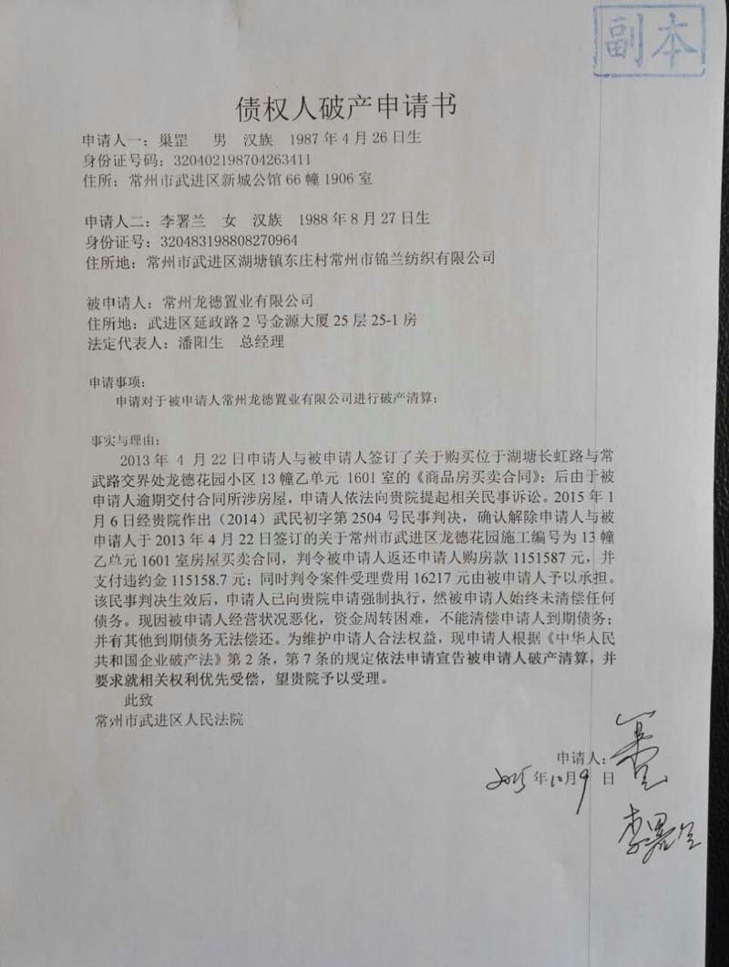 行的债权人以0.74%数额申请破产,谎称龙德公司项目资