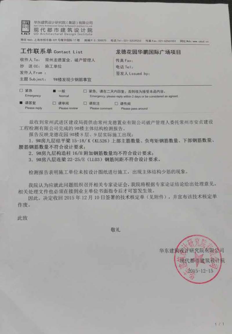 辛迪集团对此深感忧虑,他们表示,由于这些楼层的钢筋原材料物能检测报告都是“中天”牌的,明显和实际上使用的“龙江”牌存在严重不符,钢筋原材料物能检测报告存在造假,对钢筋及工程质量有怀疑,因此,要求对使用在8-15层建筑中的钢筋进行一次质量检测,以确保大楼的安全。