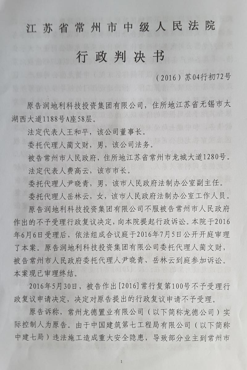 王和平说:江苏省常州市武进区人民法院宣布常州龙德置业有限公司(下称龙德置业)进入破产清算程序,并指定了破产清算管理人。如今,龙德置业已进入资产拍卖阶段。但该公司董事长王和平却并不认可这一破产清算程序,在他看来,“项目资产远远未到资不抵债的地步,破产清算无异于一场资产洗劫。”我是是常州市润地利集团的董事长和法定代表人,是龙德置业等十多家企业的实际控制人,而龙德置业在常州市武进区开发有龙德花园项目。公开资料显示,龙德花园项目位于武进新区腹地,总建筑面积51万平米,为集住宅、写字楼、酒店式公寓、会所等于一体的“都市综合体”。
