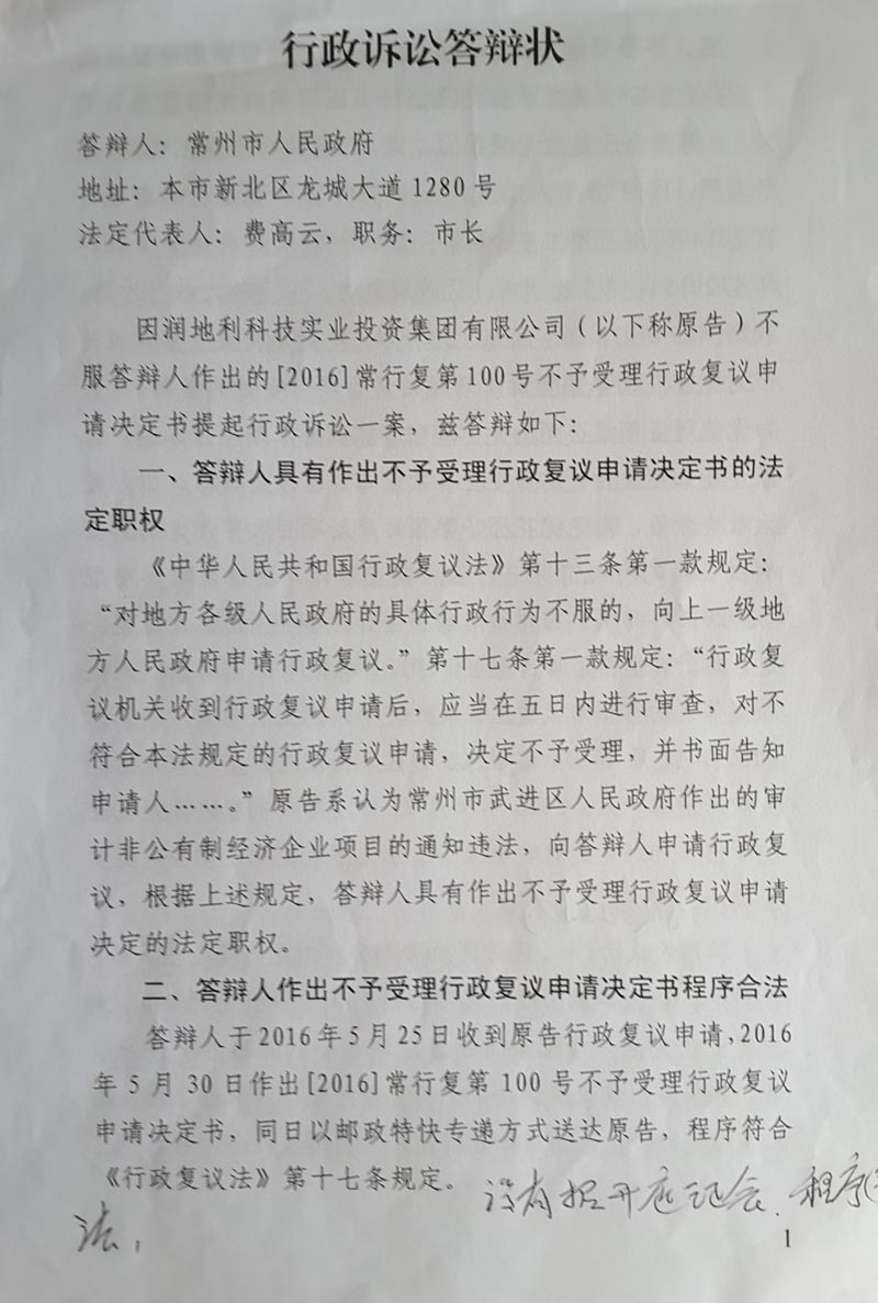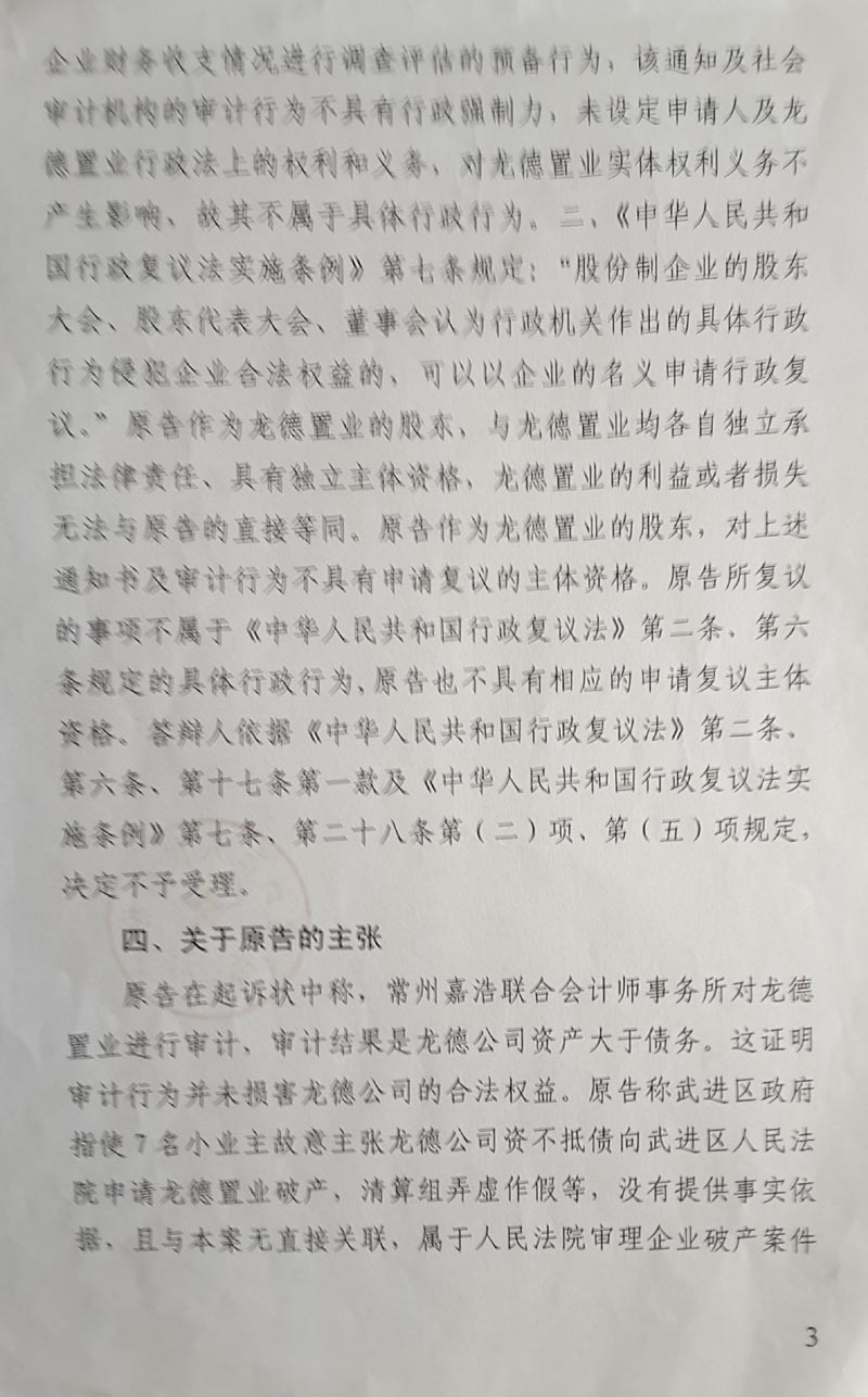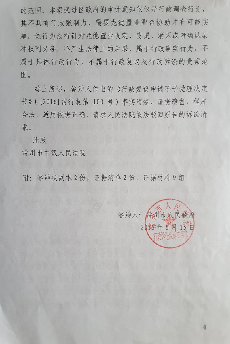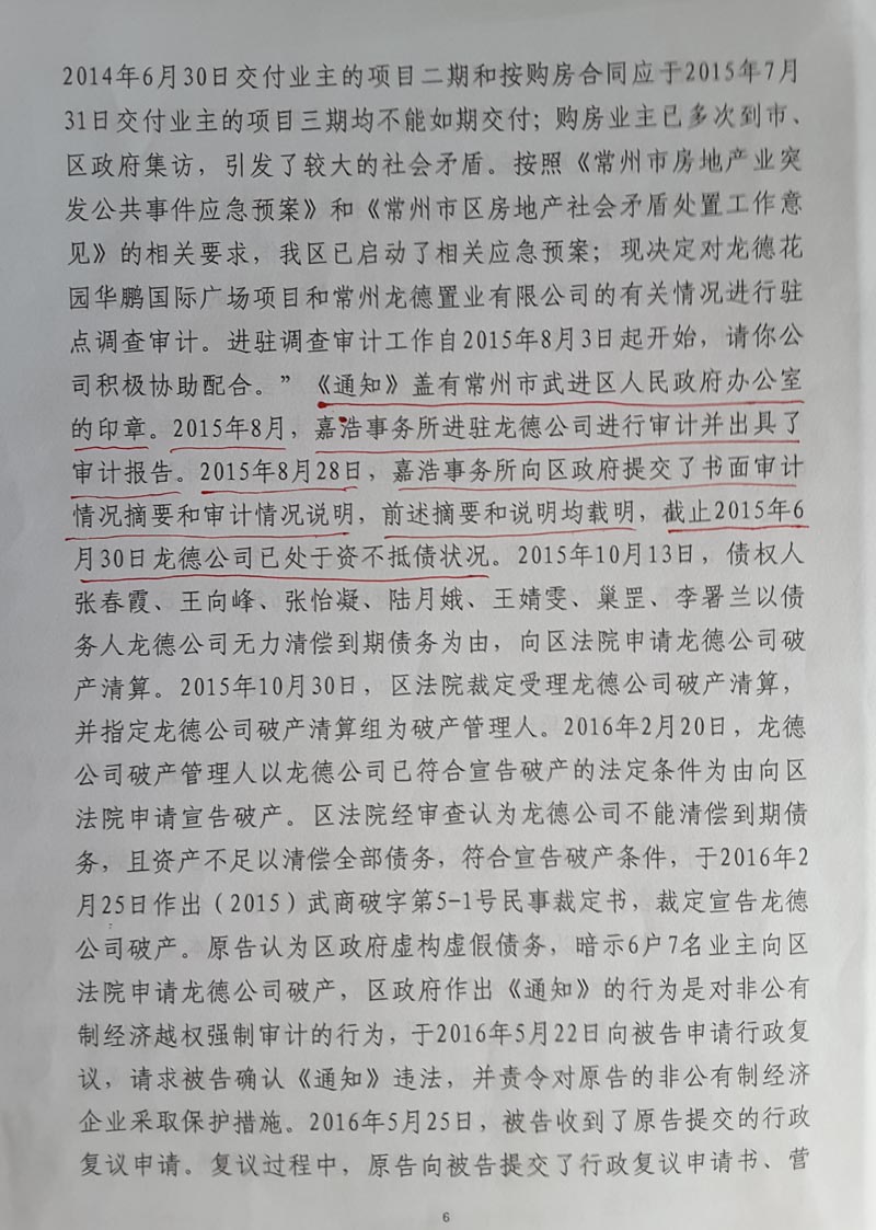 一份盖有武进区人民政府办公室公章的函件显示,龙德花园项目2014年10月起长时间停工,购房业主在预期无法按合同约定获得房屋后,多次到市、区政府上访。为此,2015年8月初,武进区成立工作组,进驻龙德置业进行调查审计。