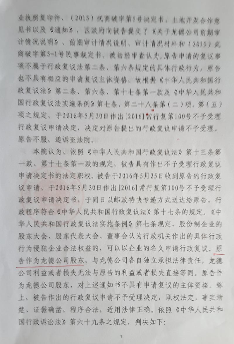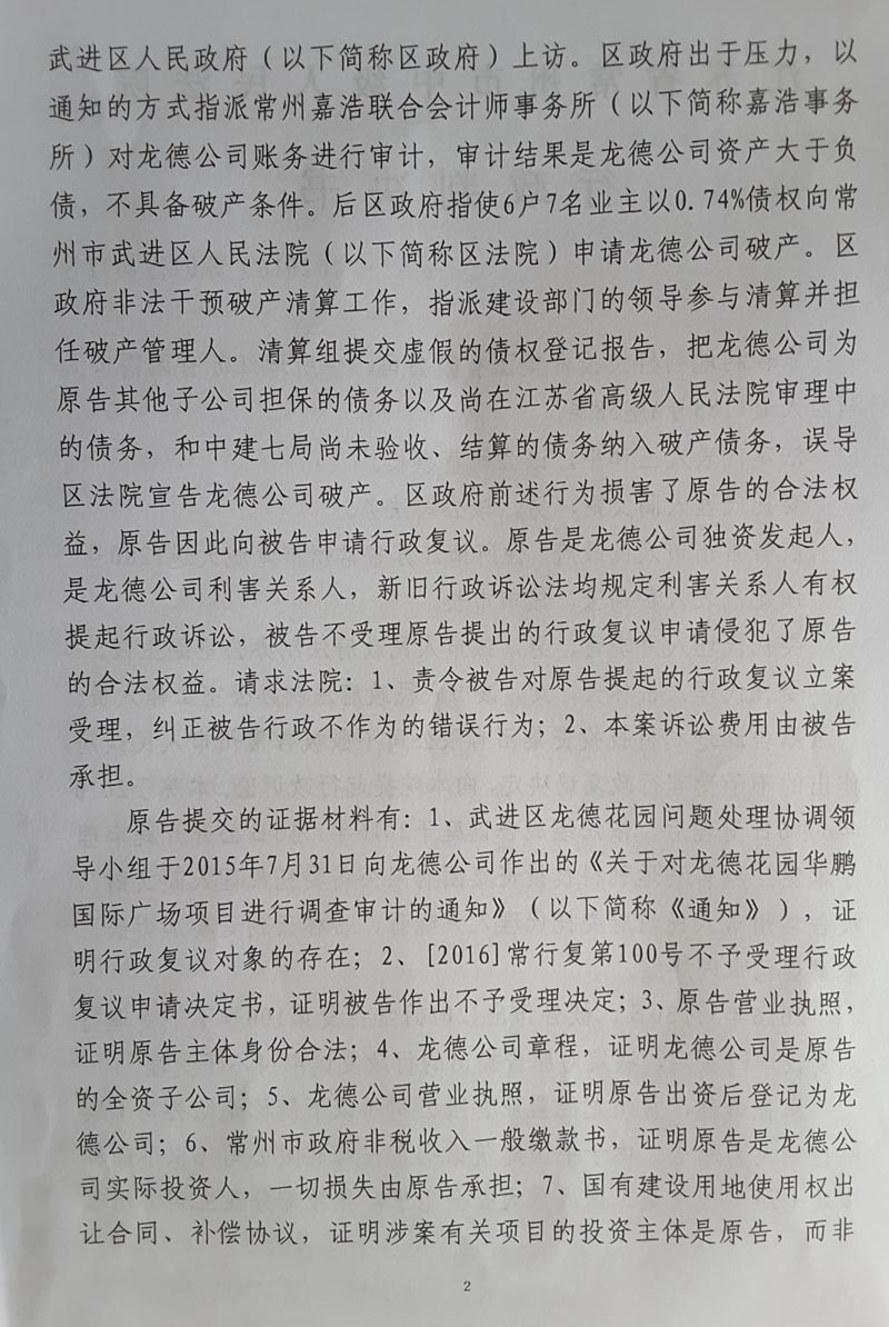 2015年中期,6名购房业主向法院提起诉讼,要求与开发商解除购房合同,退还购房款。上述诉求获法院支持。因判决未获执行,购房业主直接向法院提出了破产清算申请,武进区人民法院明知龙德置业资大于债2.457亿余元,对不该受理的破产申请予以受理。2016年春节后不久,法院裁定宣布龙德快速置业破产,让一个有经济实力后盾的非公有制企业走向死亡的高速路,幕后肯定有腐败窝案在作怪,否则不会如此荒唐。