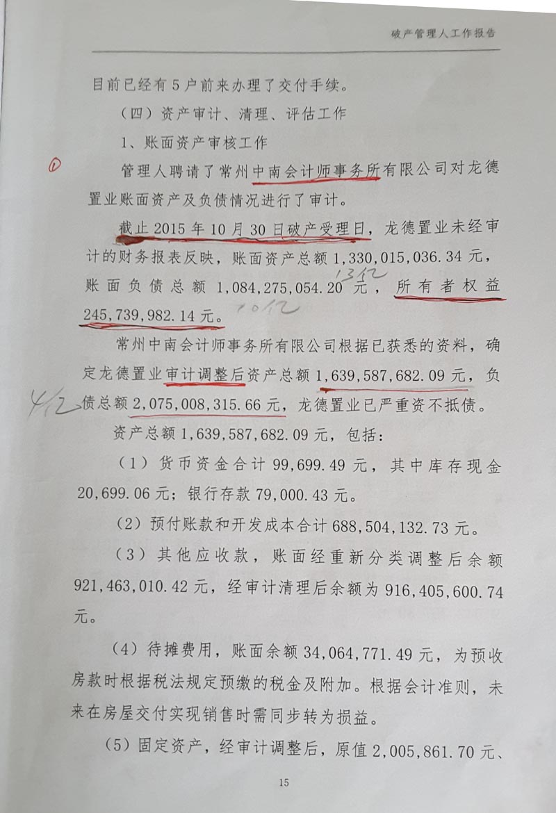 有记者获得的破产管理人提供的第一次债权人会议资料显示,截止到2015年10月30日破产受理日,龙德置业未经审计的财务报表反映,账面资产总额为13.30亿元,账面负债总额10.84亿元,所有者权益为2.46亿元。经常州中南会计师事务所审计,确定龙德置业的资产和负债分别是16.40亿元、20.75亿元,已严重资不抵债,缺口高达4.35亿元。